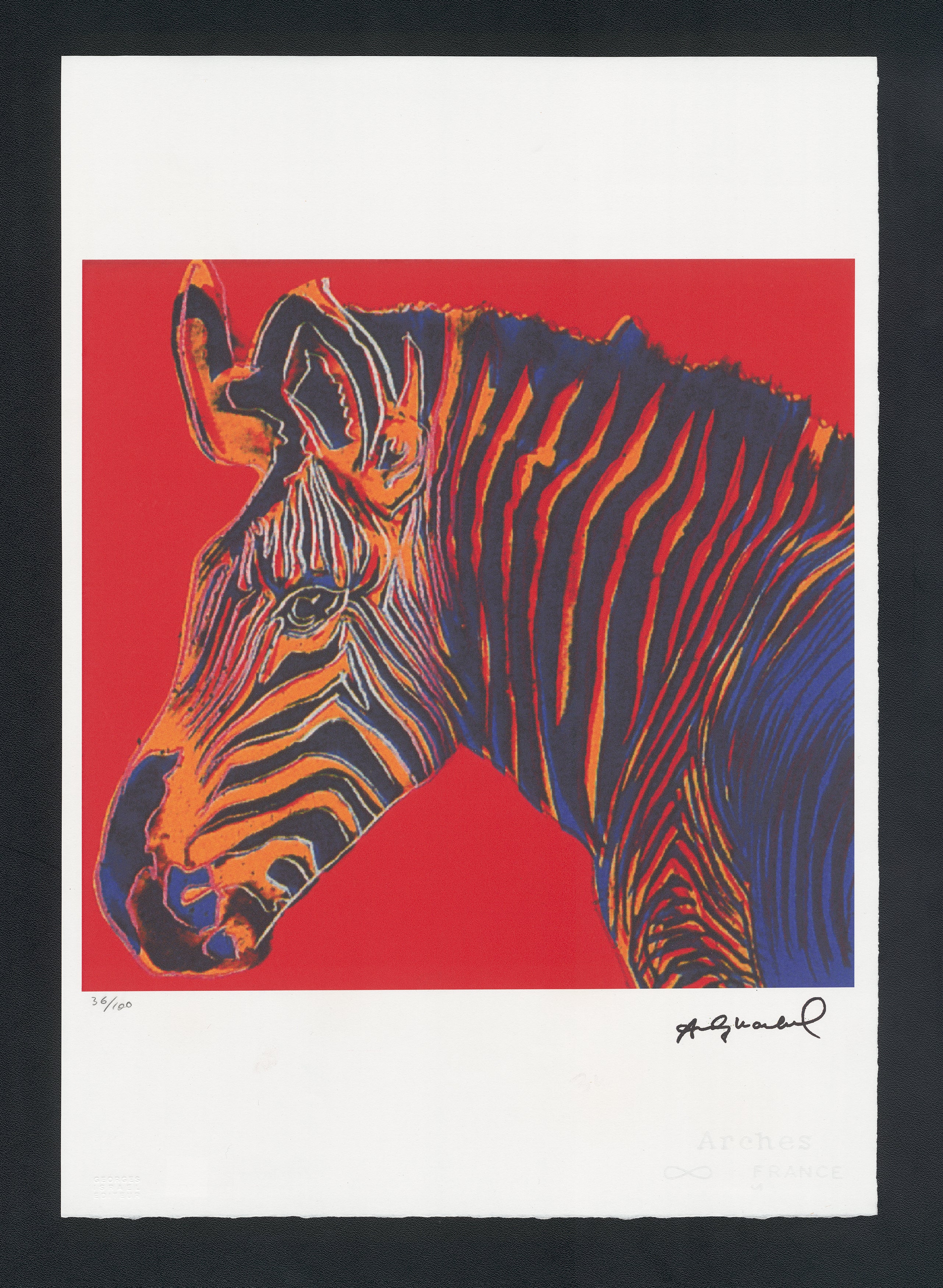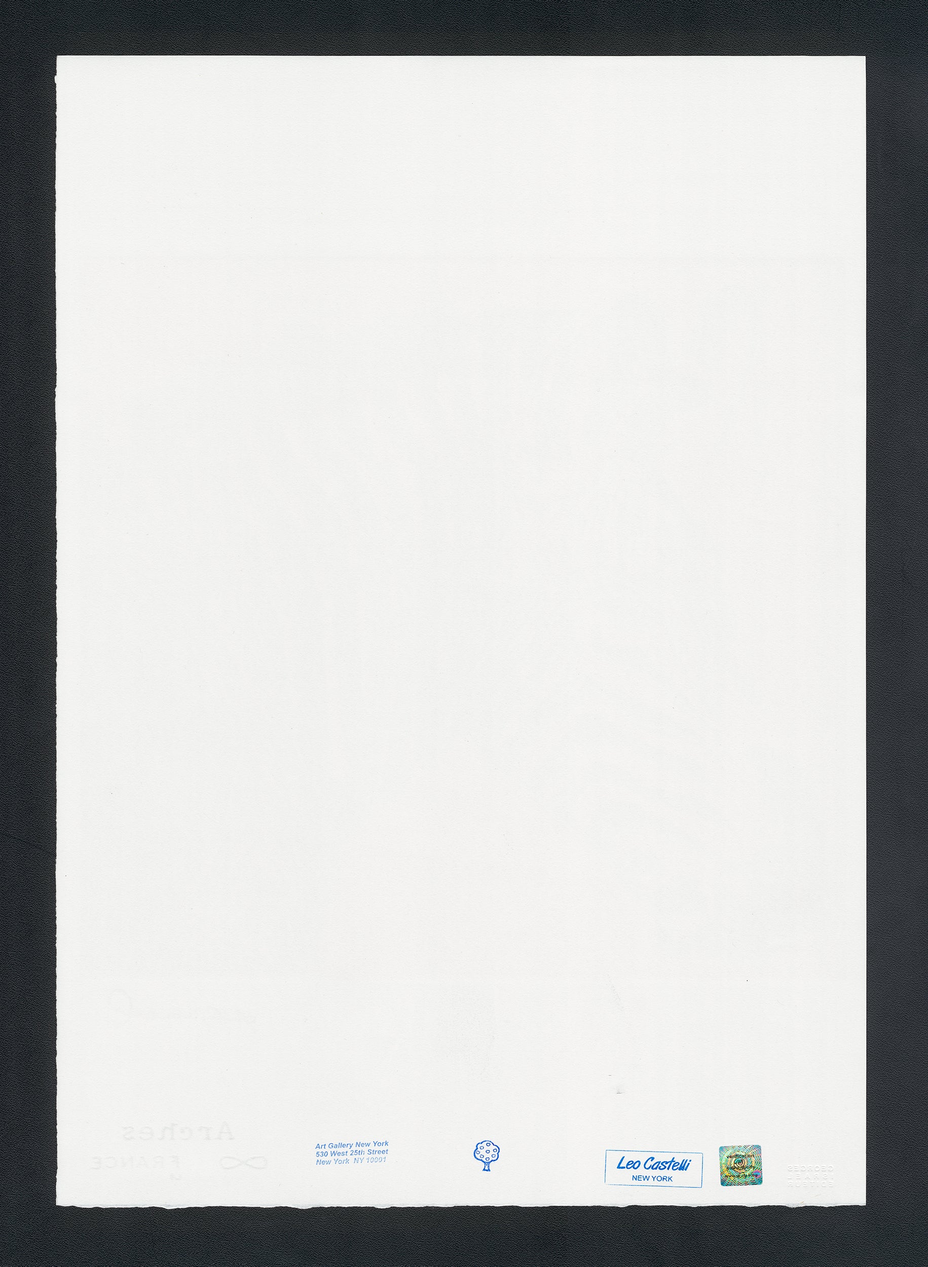 Certifikovaný grafický list, 38 x 56 cm. Certifikát, slepotisk © ANDY WARHOL, ruční papír Fabriano Privilege. Signováno vpravo dole Andy Warhol. Na zadní straně razítka: ANDY WARHOL Factory.