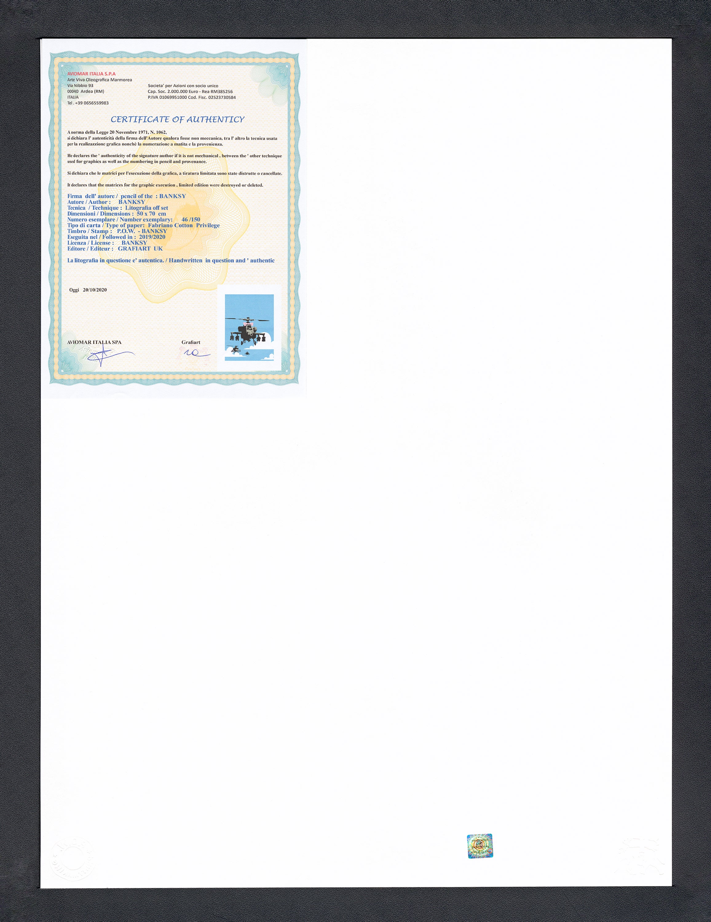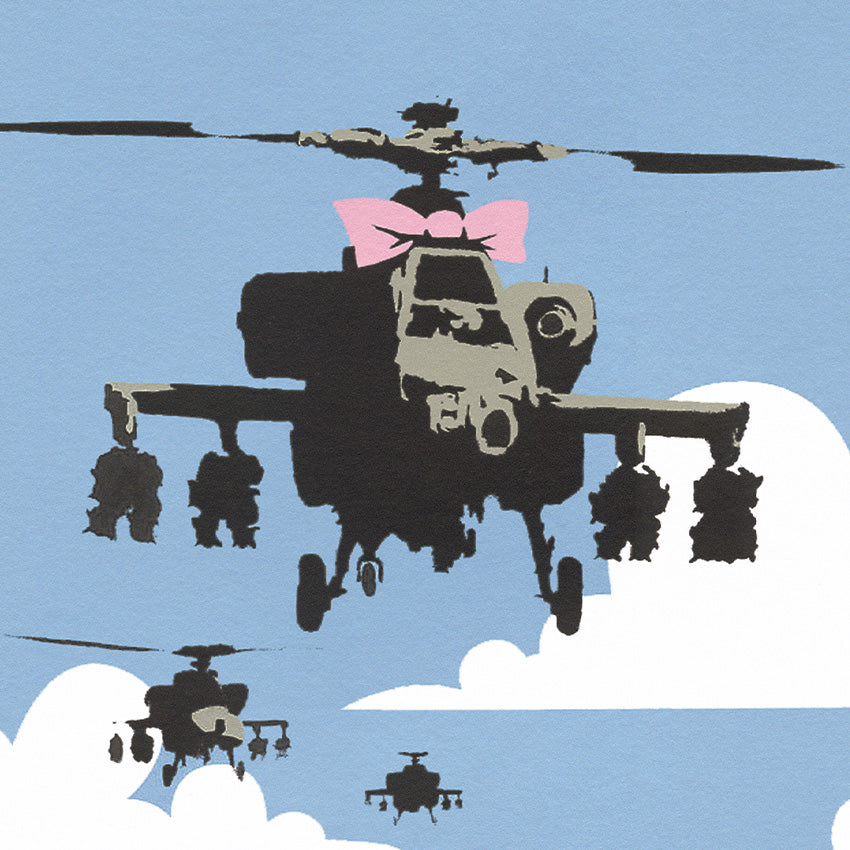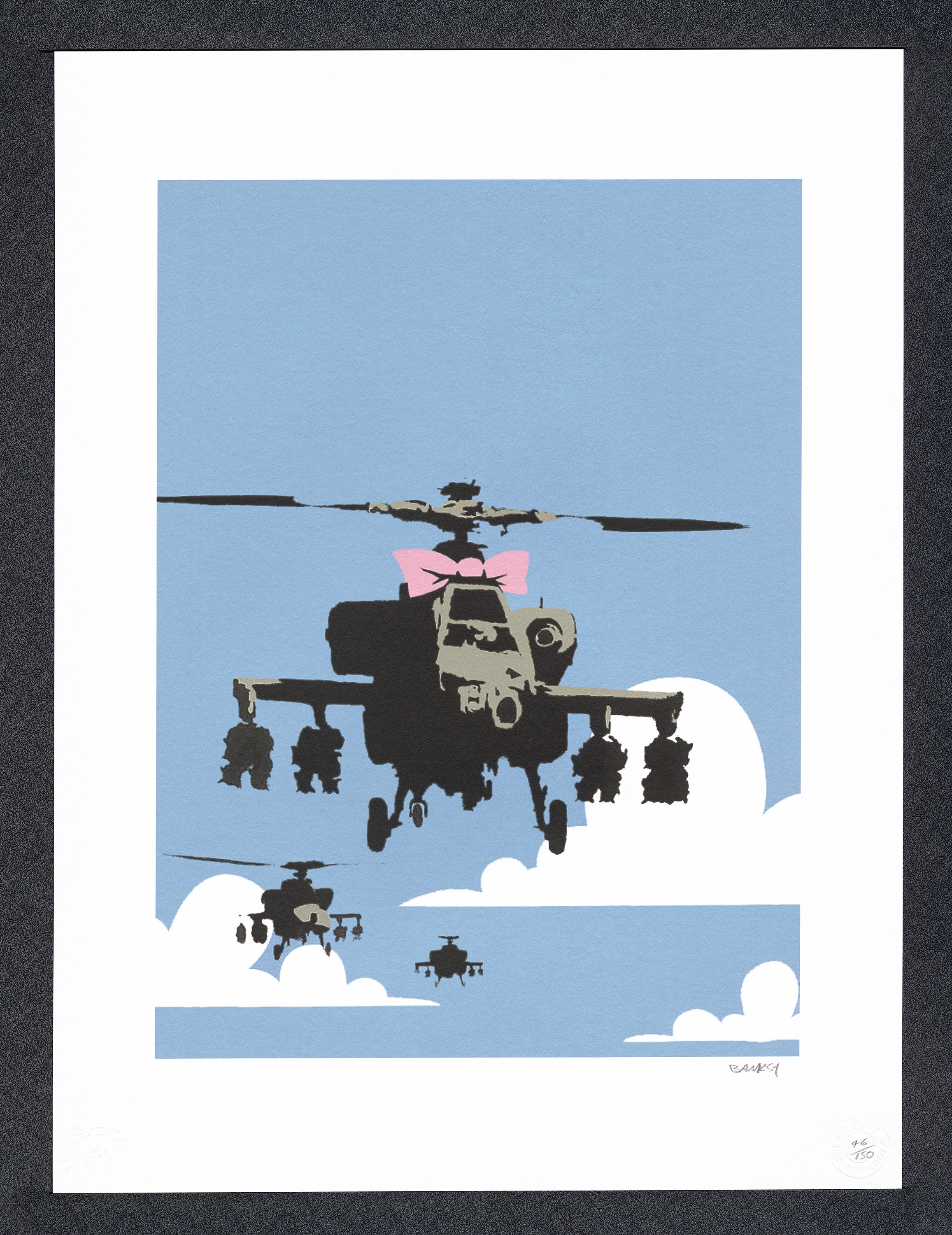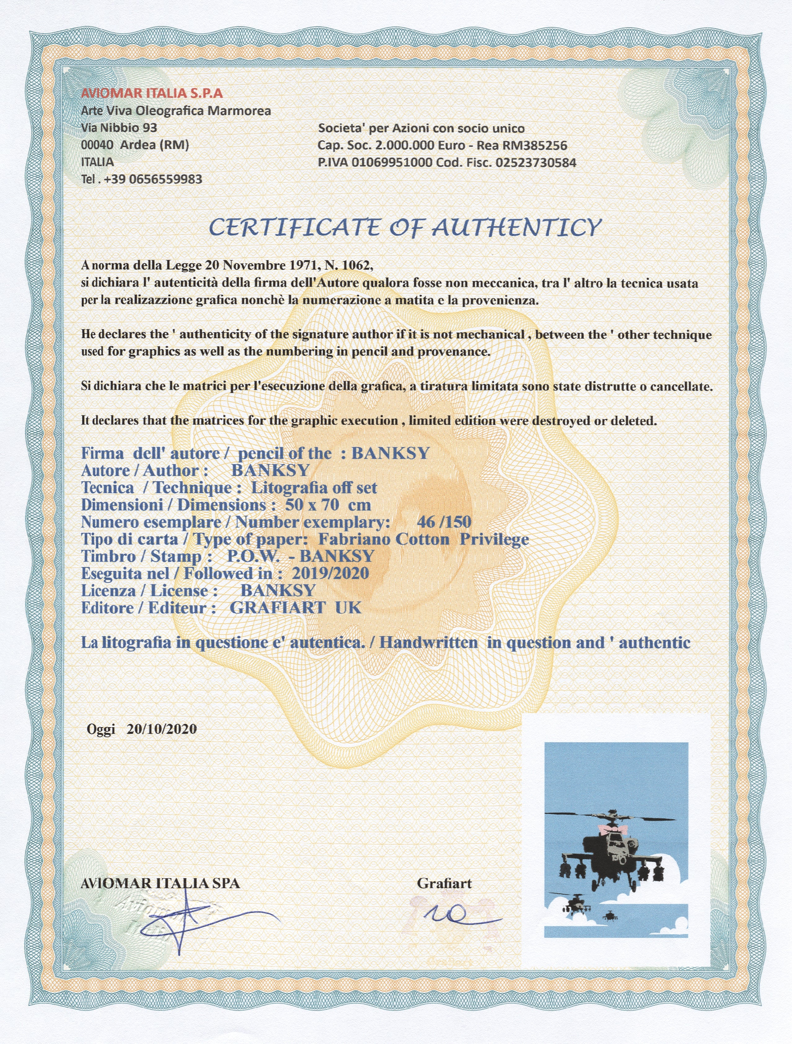 Grafický list, 50 x 70 cm. Číslováno, slepotisk P.O.W.-BANKSY, ruční papír Fabriano Cotton Privilege. Signováno vpravo dole BANKSY.