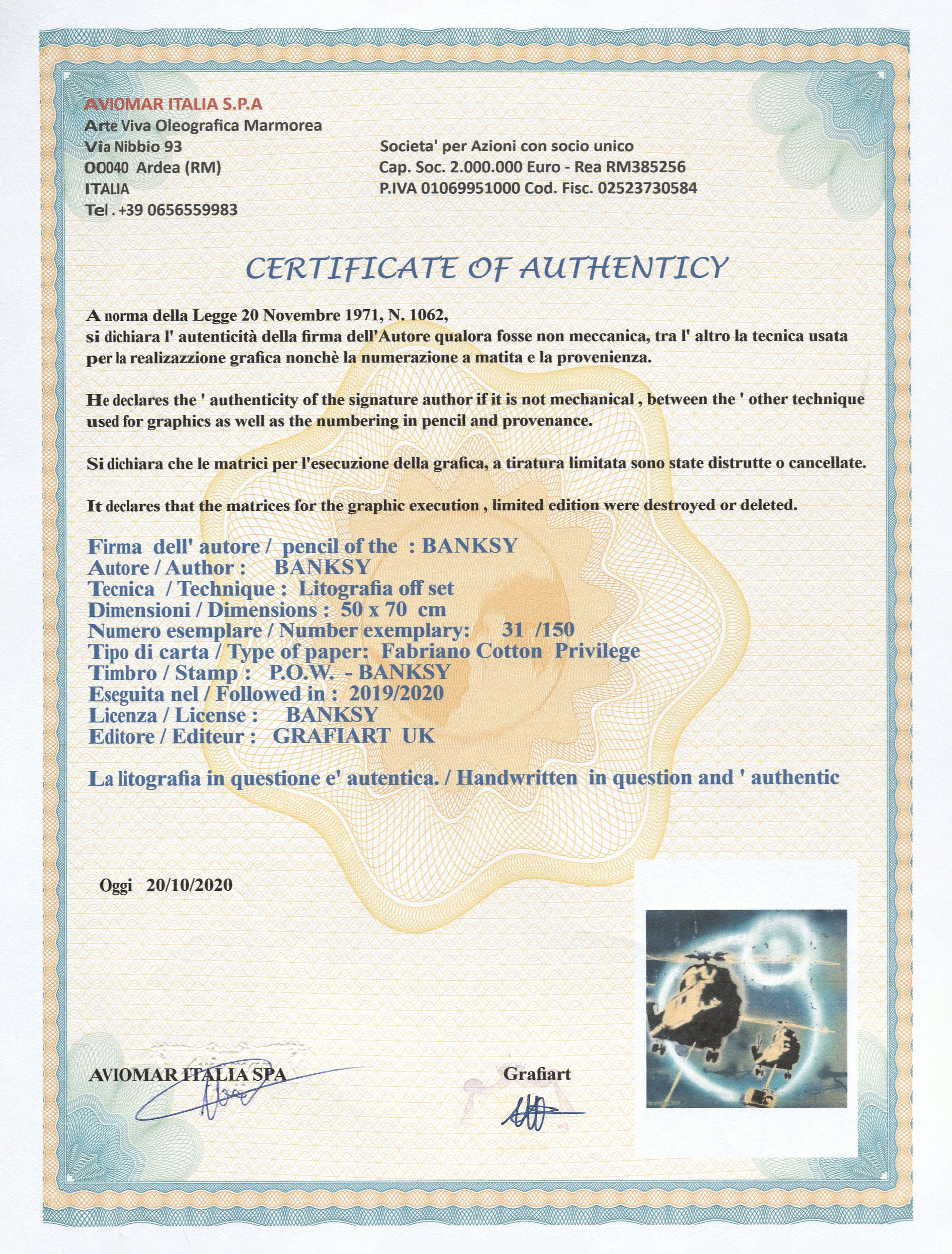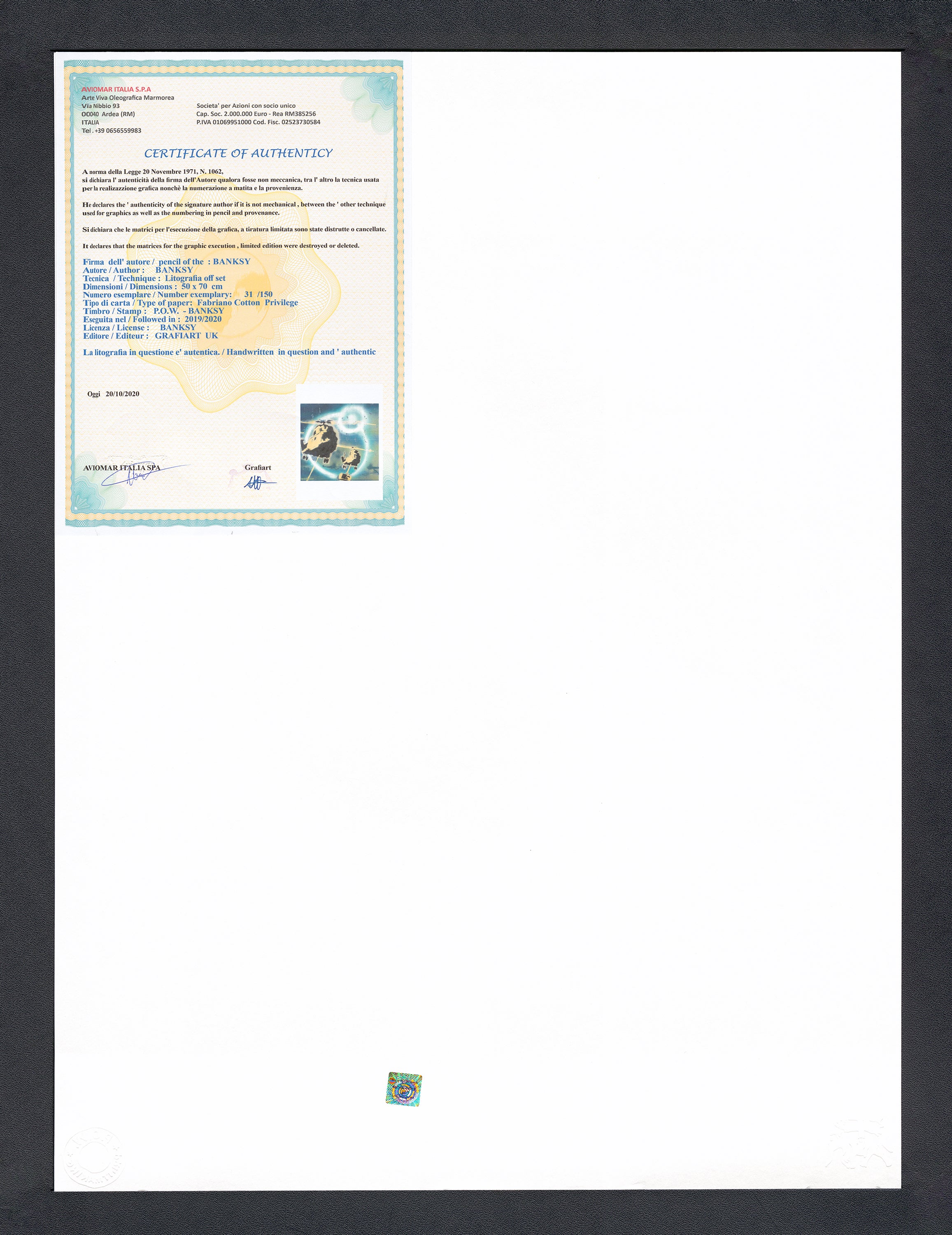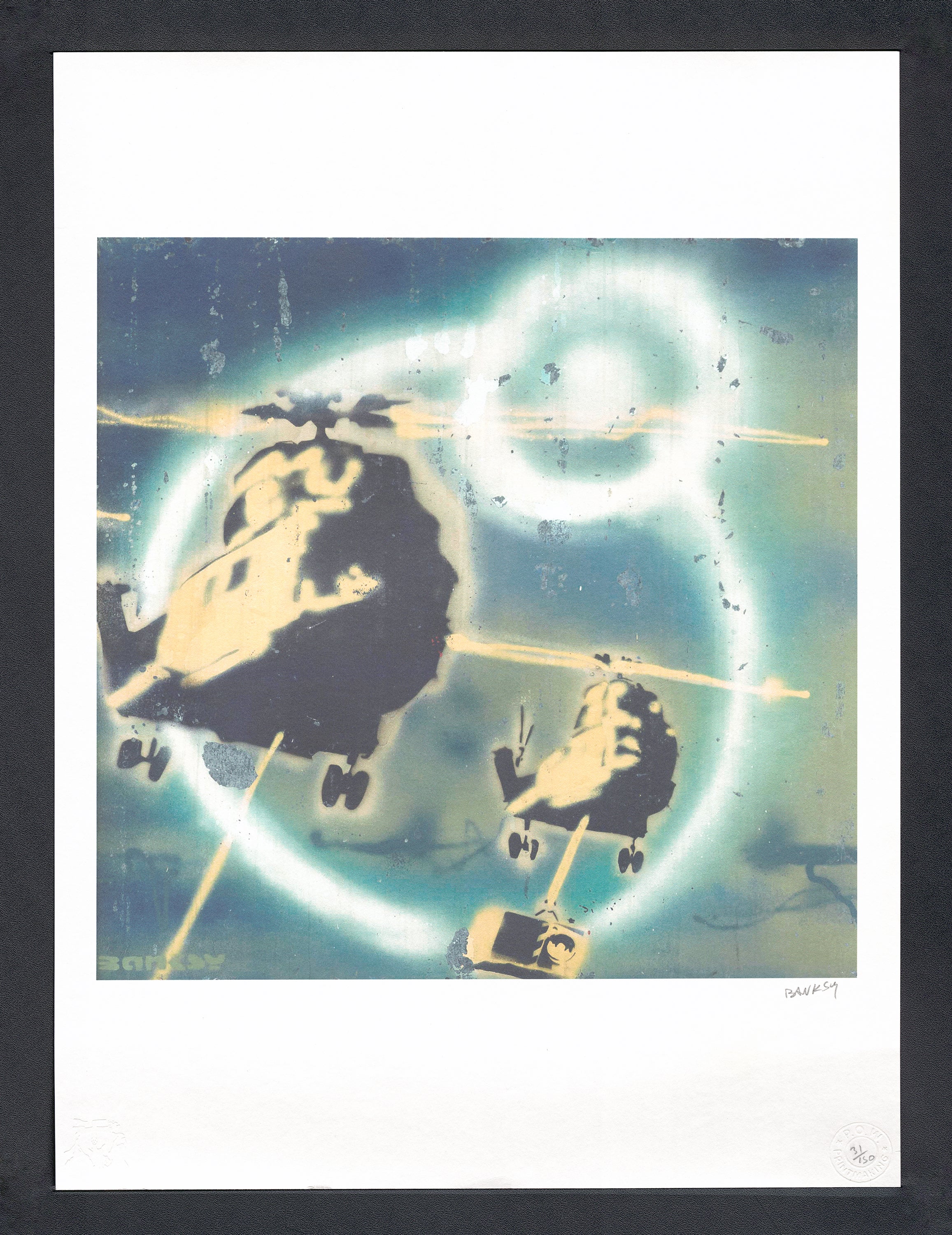 Grafický list, 50 x 70 cm. Číslováno, slepotisk P.O.W.-BANKSY, ruční papír Fabriano Cotton Privilege. Signováno vpravo dole BANKSY.