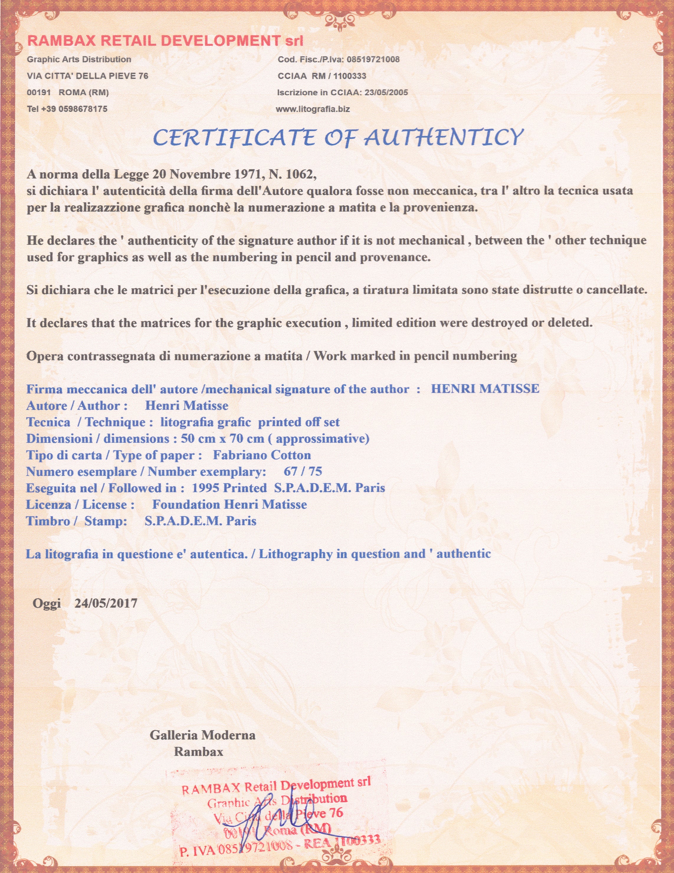 Grafický list 50x70 cm v limitovaném nákladu. Tisk č. 67/75. Slepotiskové razítko vydavatele díla. Ruční papír. Volný list.