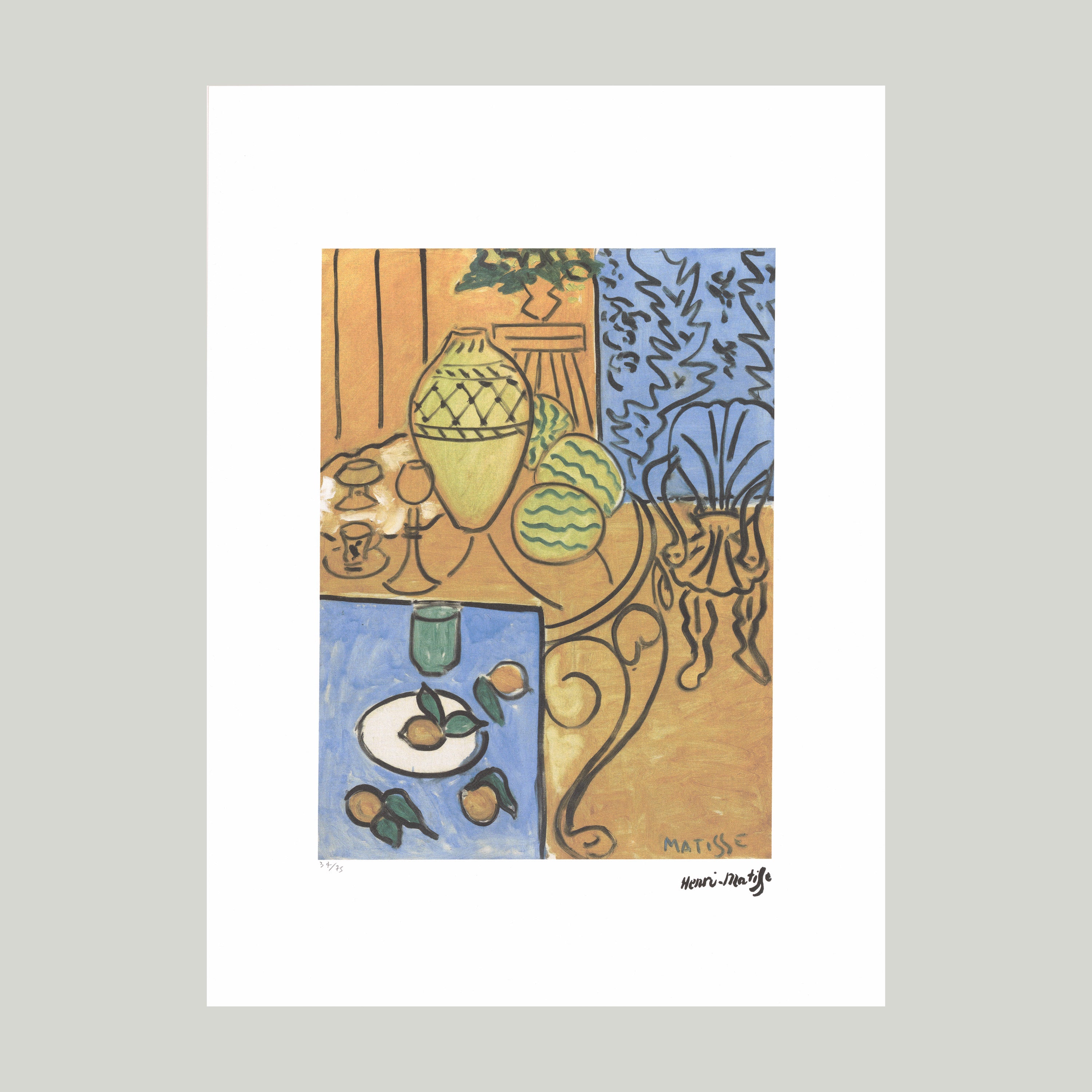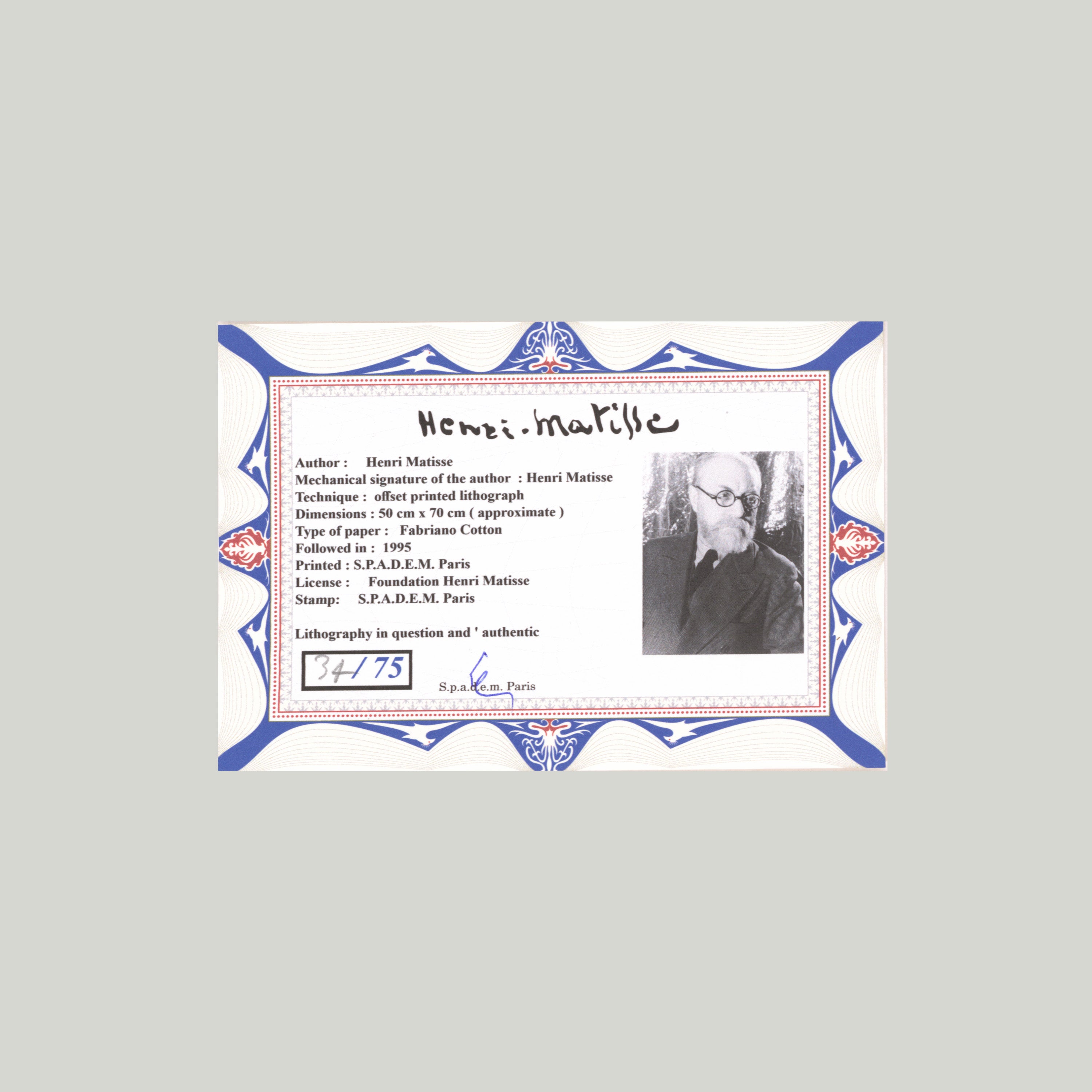 Certifikovaný grafický list, 50x70 cm. Číslováno 34/75. Certifikát, ruční papír Fabriano Cotton. Signováno vpravo dole Henri Matisse. Slepotisk S.P.A.D.E.M. Paris. Číslováno tužkou