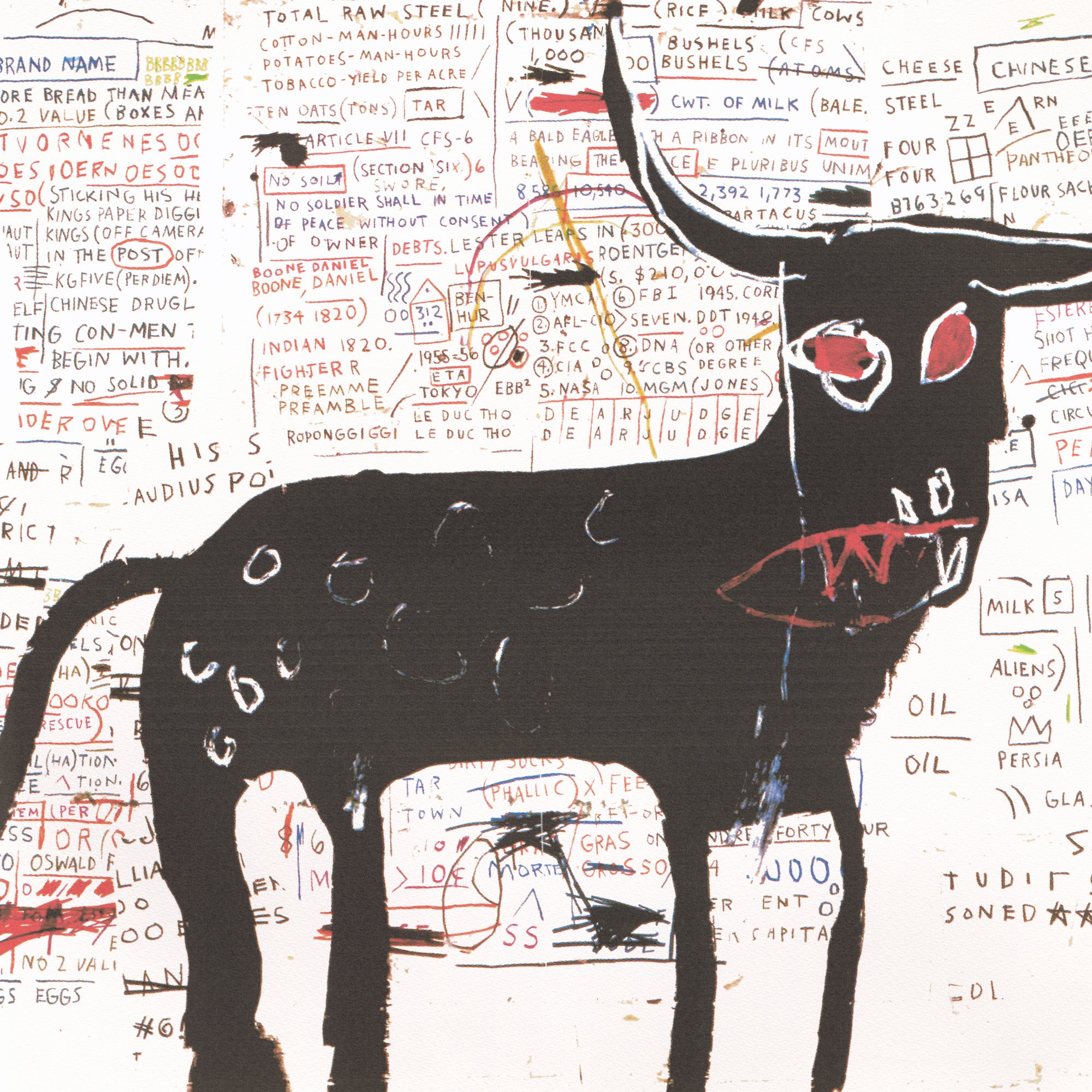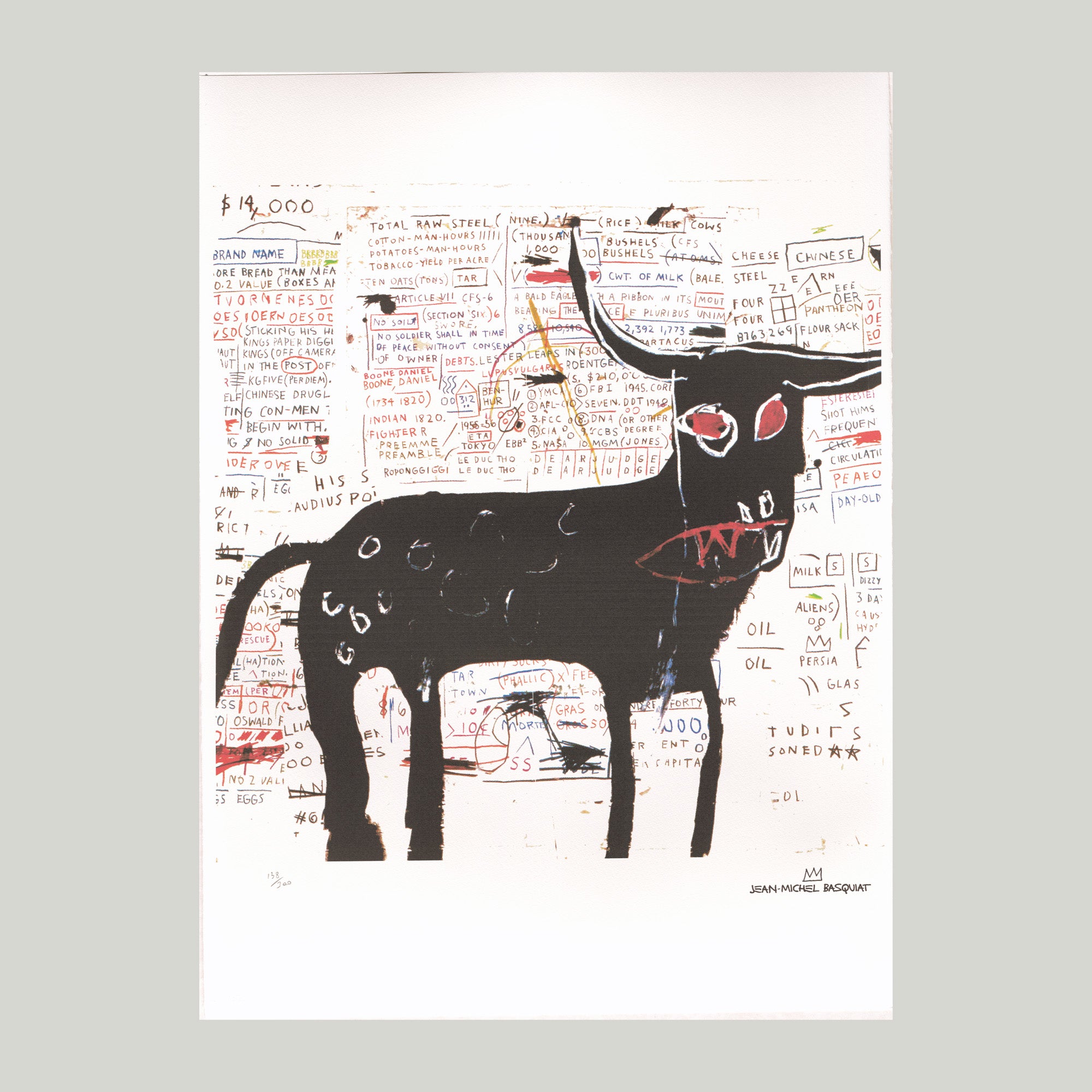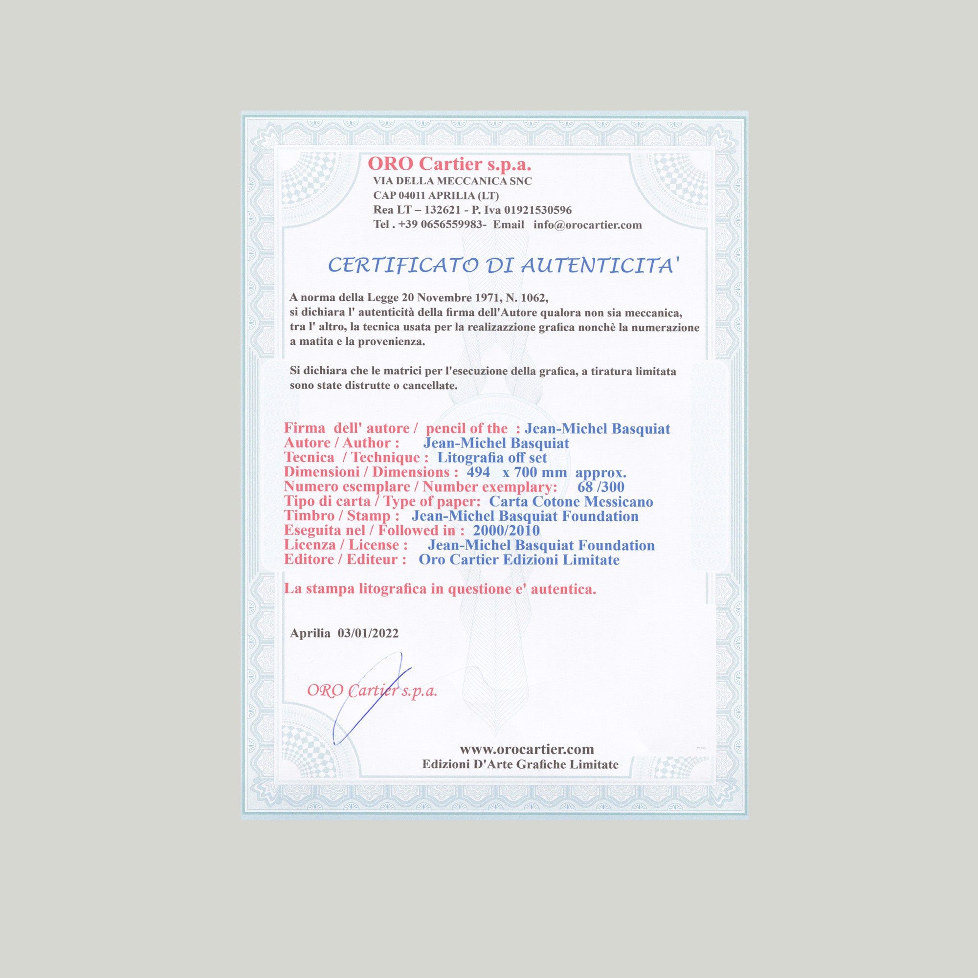 Certifikovaný grafický list, 49,4 x 70 cm. Číslováno, licence Jean-Michel Basquiat Foundation, ruční papír Carta Cotone Messicano. Slepotisk Oro Cartier Edizioni Limitate. Číslo konkrétního grafického listu se může lišit od uvedeného vyobrazení.