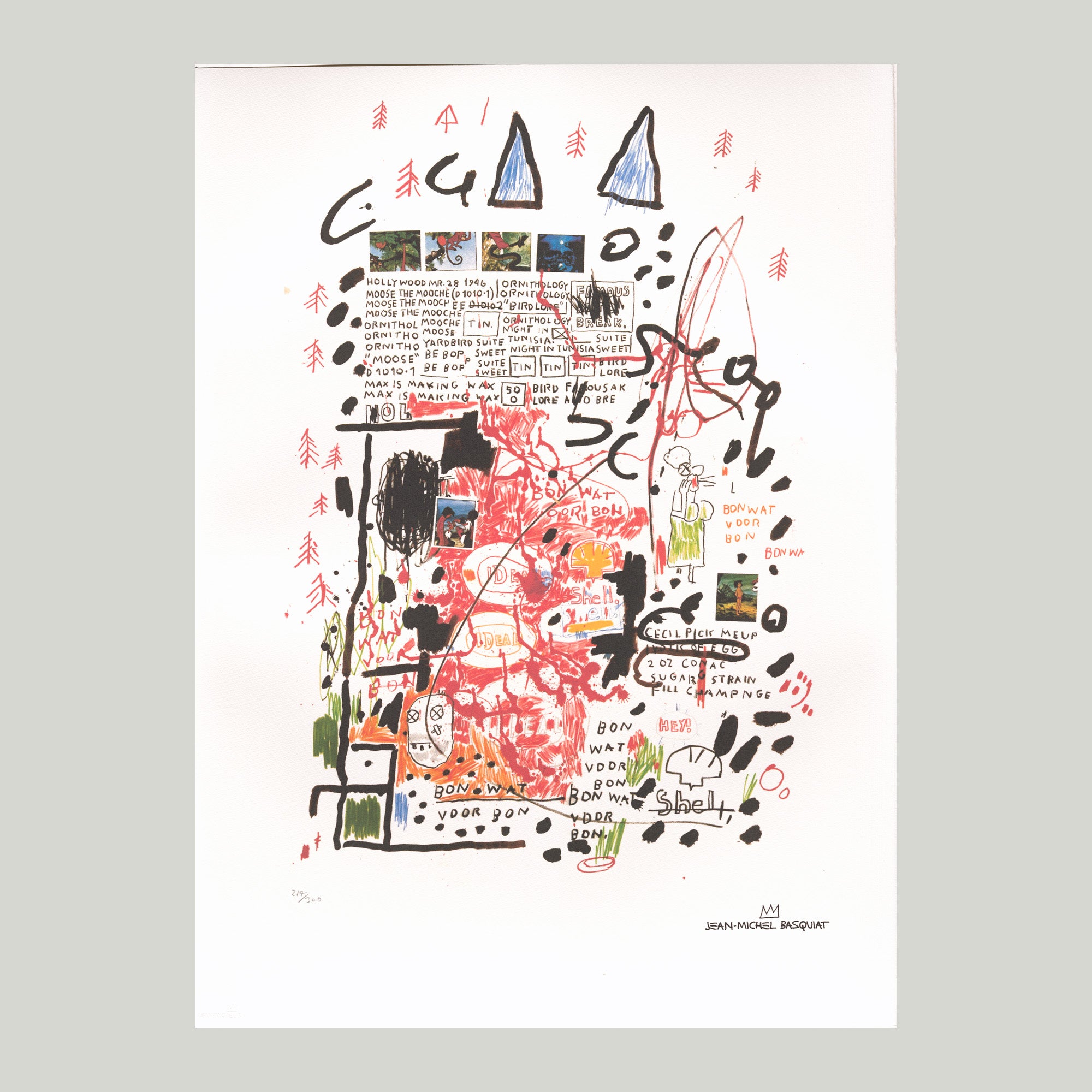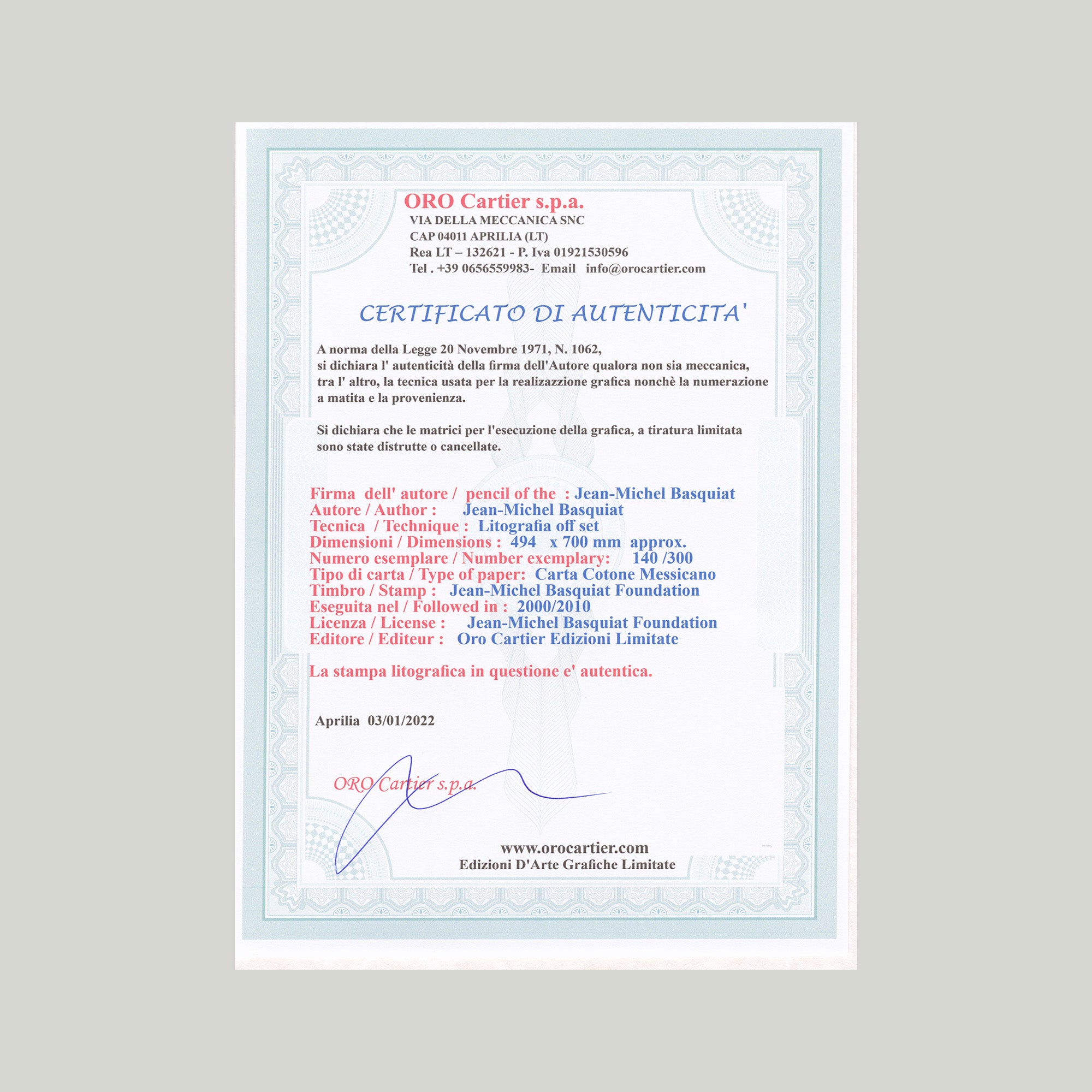 Certifikovaný grafický list, 49,4 x 70 cm. Číslováno, licence Jean-Michel Basquiat Foundation, ruční papír Carta Cotone Messicano. Slepotisk Oro Cartier Edizioni Limitate. Číslo konkrétního grafického listu se může lišit od uvedeného vyobrazení.