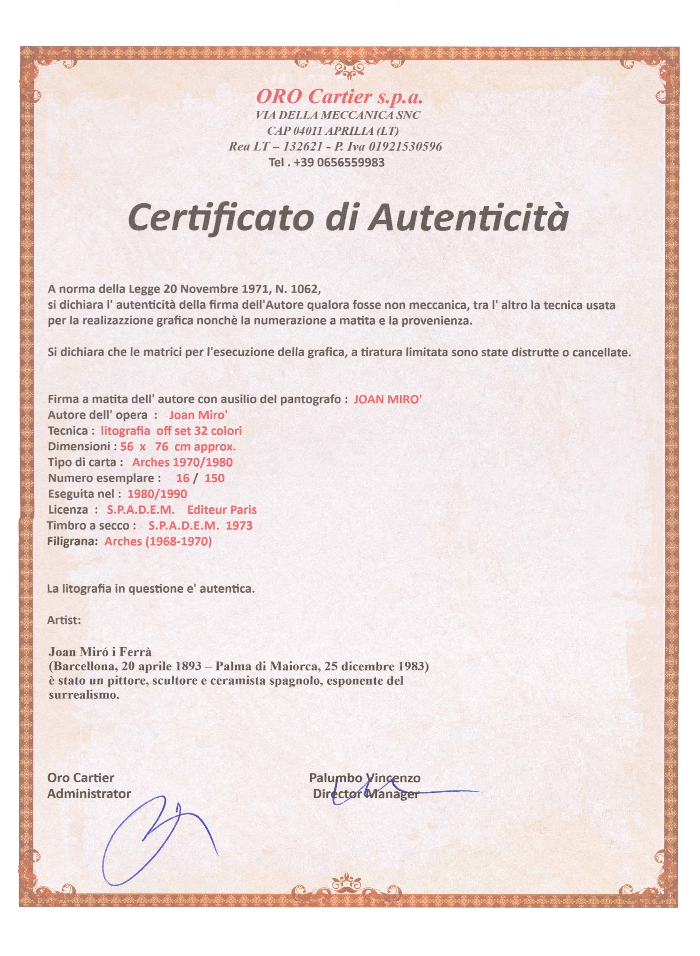 Joan Miró (1893-1983) byl významným katalánským malířem, sochařem a keramikem. Navštěvoval školu Escuelu de Bellas Artes, na které studoval i Pablo Picasso dvanáct let před ním. Jeho učitelé byli nadšeni jeho talentem, Miró však trpěl depresemi a nervovými problémy. Po pobytu na venkovském statku v Mont-roig del Camp se definitivně rozhodl stát se malířem. Studoval na Škole umění v Barceloně a následně se seznámil se surrealismem, což mělo významný vliv na jeho tvorbu. Miró byl známý svým osobitým stylem - kombinoval abstrakci s poetickými prvky. Jeho díla jsou plná barevnosti a rytmu, který vytvářel geometrickými tvary. Miró se stal blízkým přítelem Pabla Picassa, který ho podporoval v jeho uměleckém snažení. Byl aktivní v surrealistickém hnutí, ale jeho přístup k němu byl odlišný. Zatímco ostatní surrealisté se zaměřovali na snovou a halucinační stránku, Miró se nechával vést svou vlastní představivostí. Vytvořil řadu grafických děl včetně litografií. Během druhé světové války se jeho díla stala reakcí na politické události, a to zejména v jeho vlastní Španělsku. Později se přestěhoval do Normandie a vytvořil několik významných nástěnných maleb. Joan Miró byl významným umělcem 20. století, jehož dílo ovlivnilo moderní uměleckou scénu.