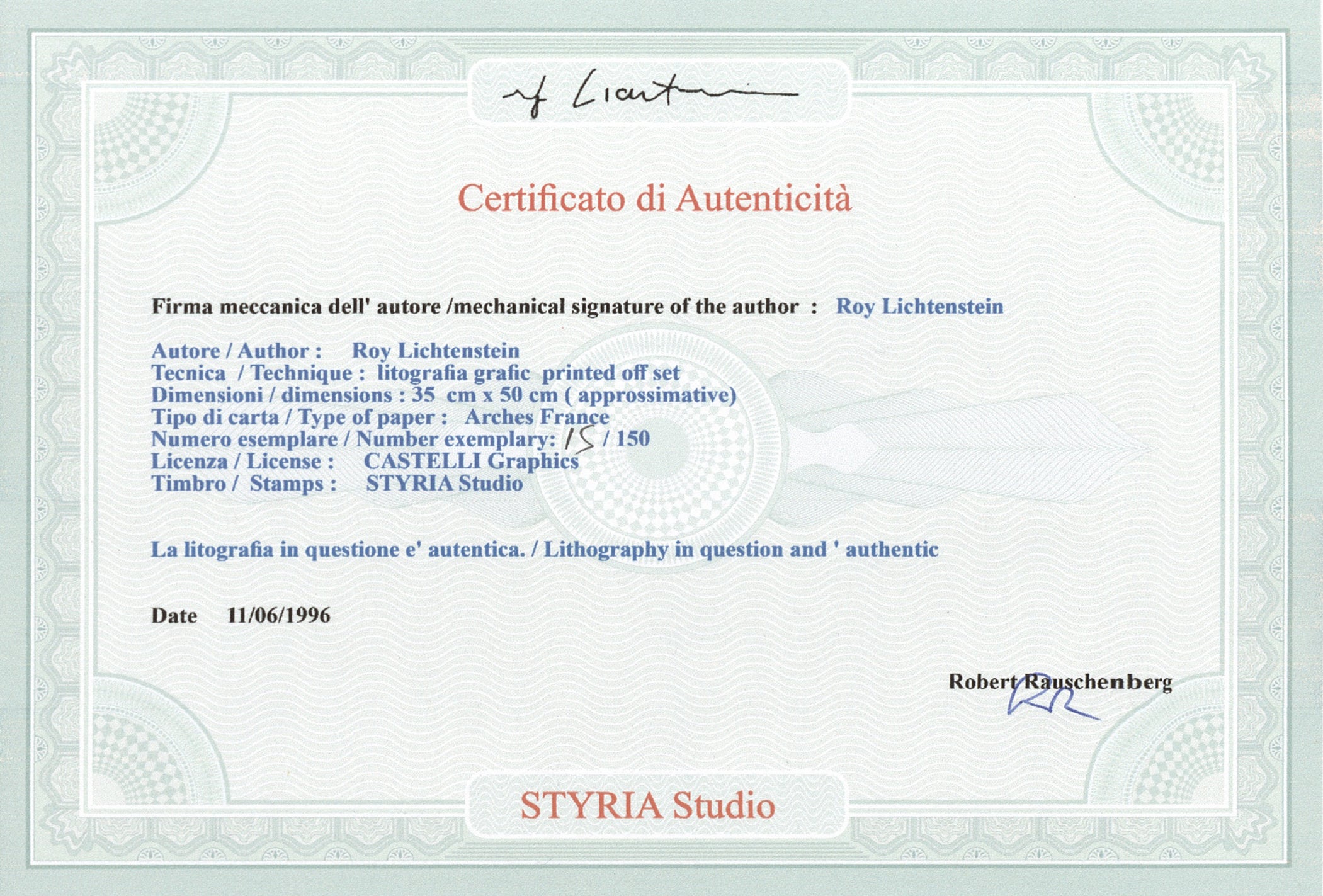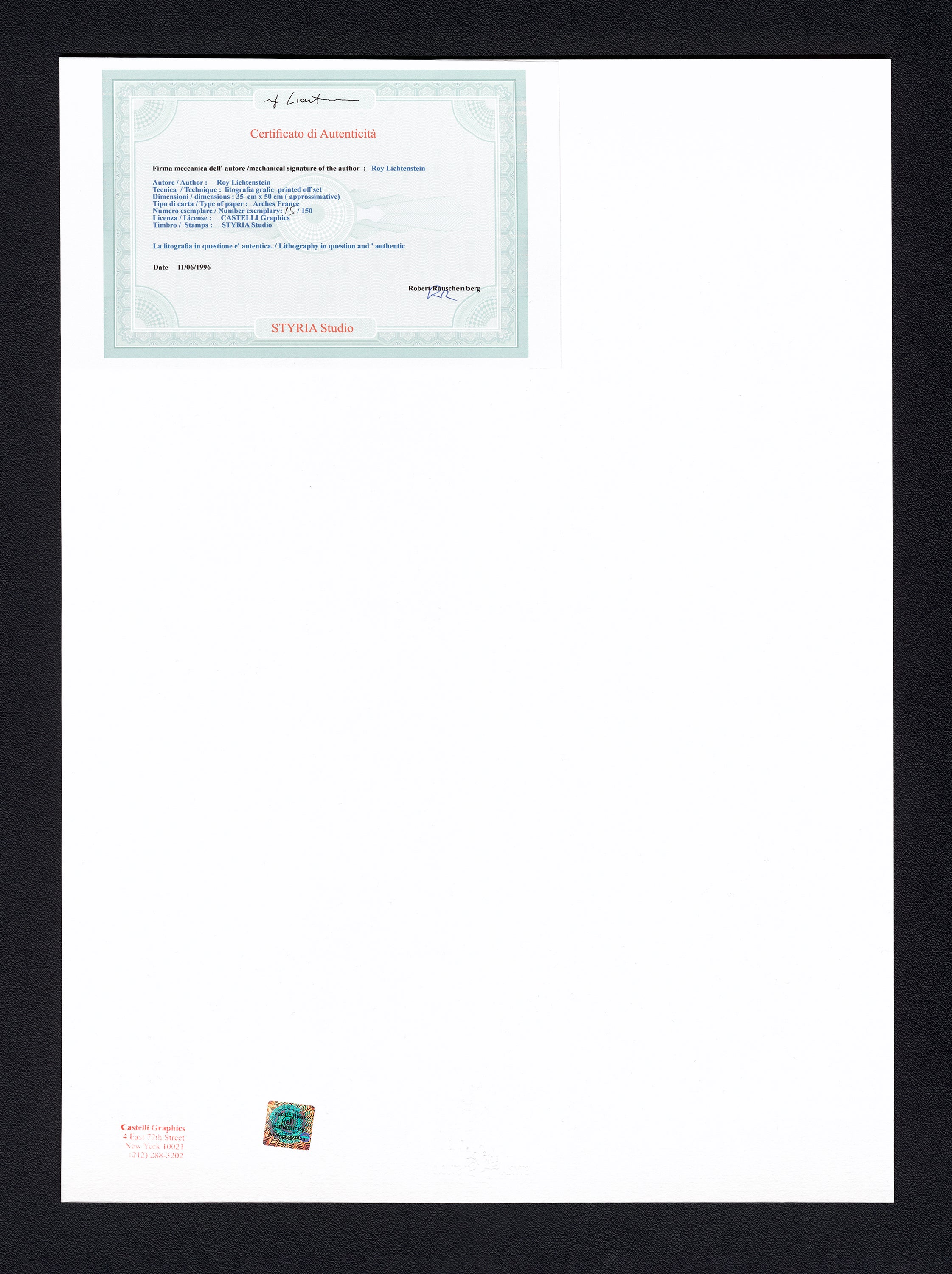 Certifikovaný grafický list, 35 x 50 cm. Certifikát, slepotisk STYRIA Studio, ruční papír Arches France. Signováno vpravo dole Roy Lichtenstein ©. Na zadní straně razítko: CASTELLI Graphics.