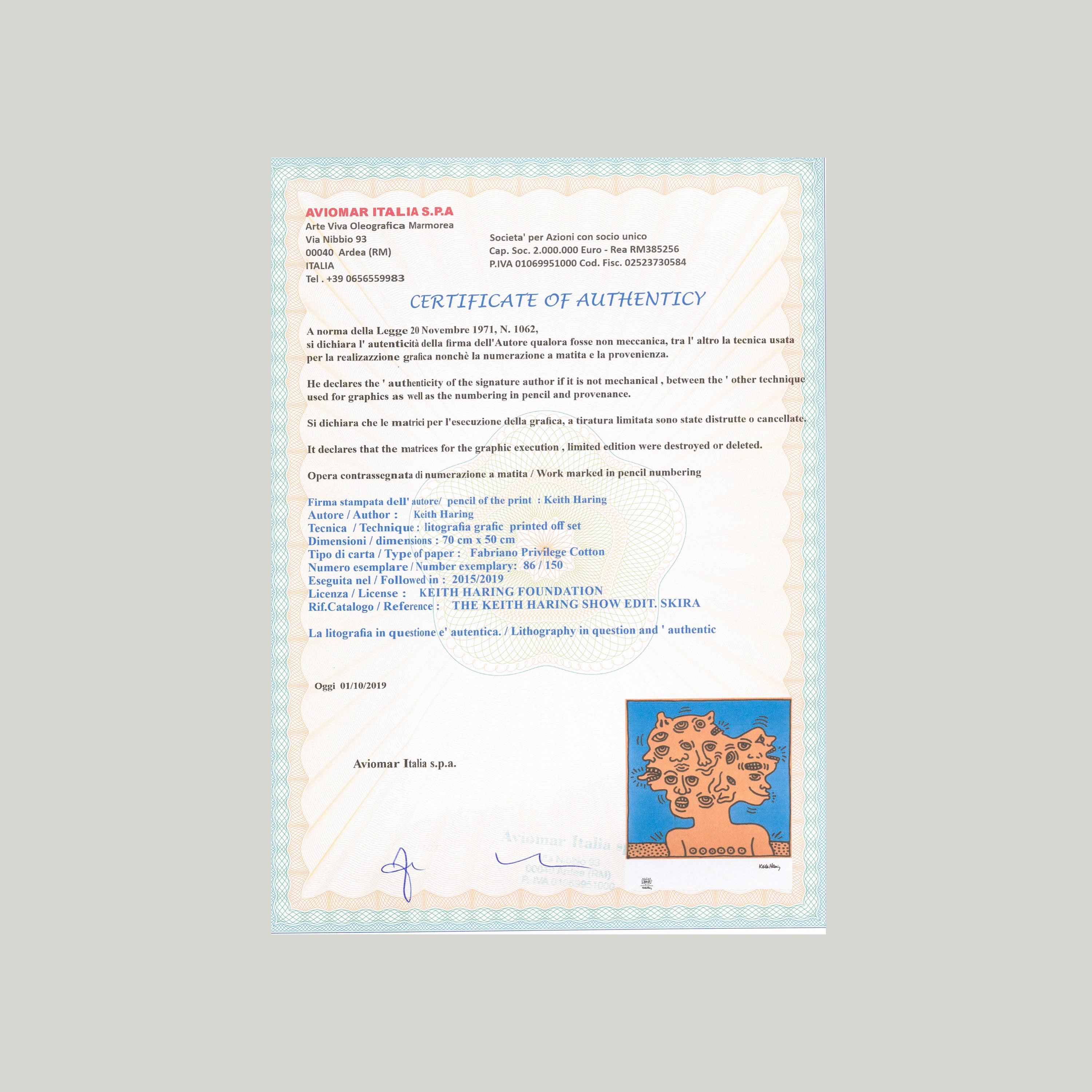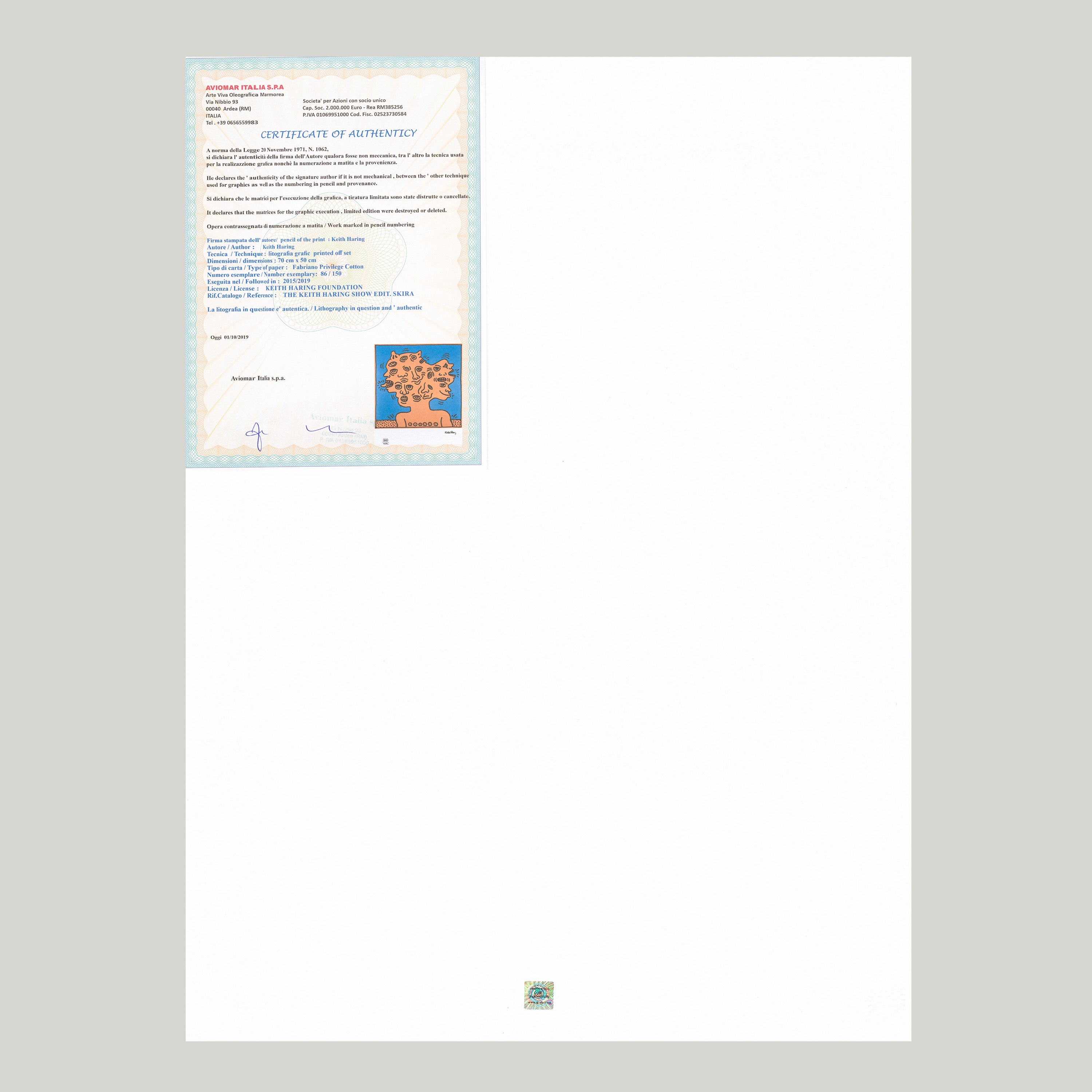 Certifikovaný grafický list, 50 x 70 cm. Číslováno, certifikát, slepotisk a licence KEITH HARING FOUNDATION, ruční papír Fabriano Privilege Cotton. Signováno vpravo dole Keith Haring.