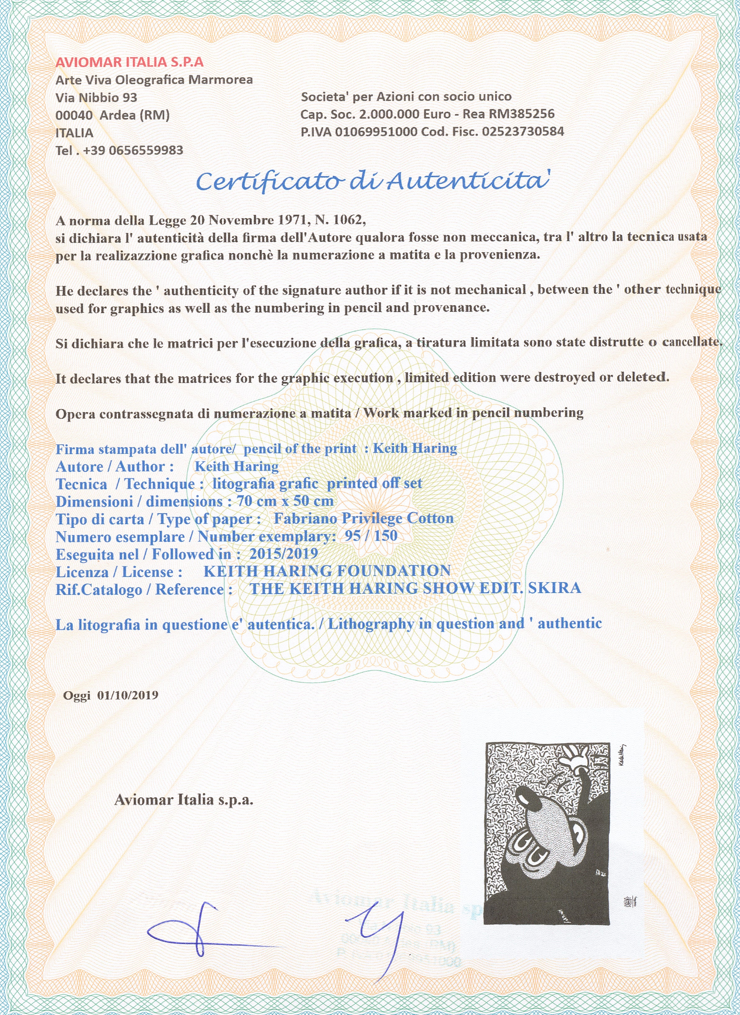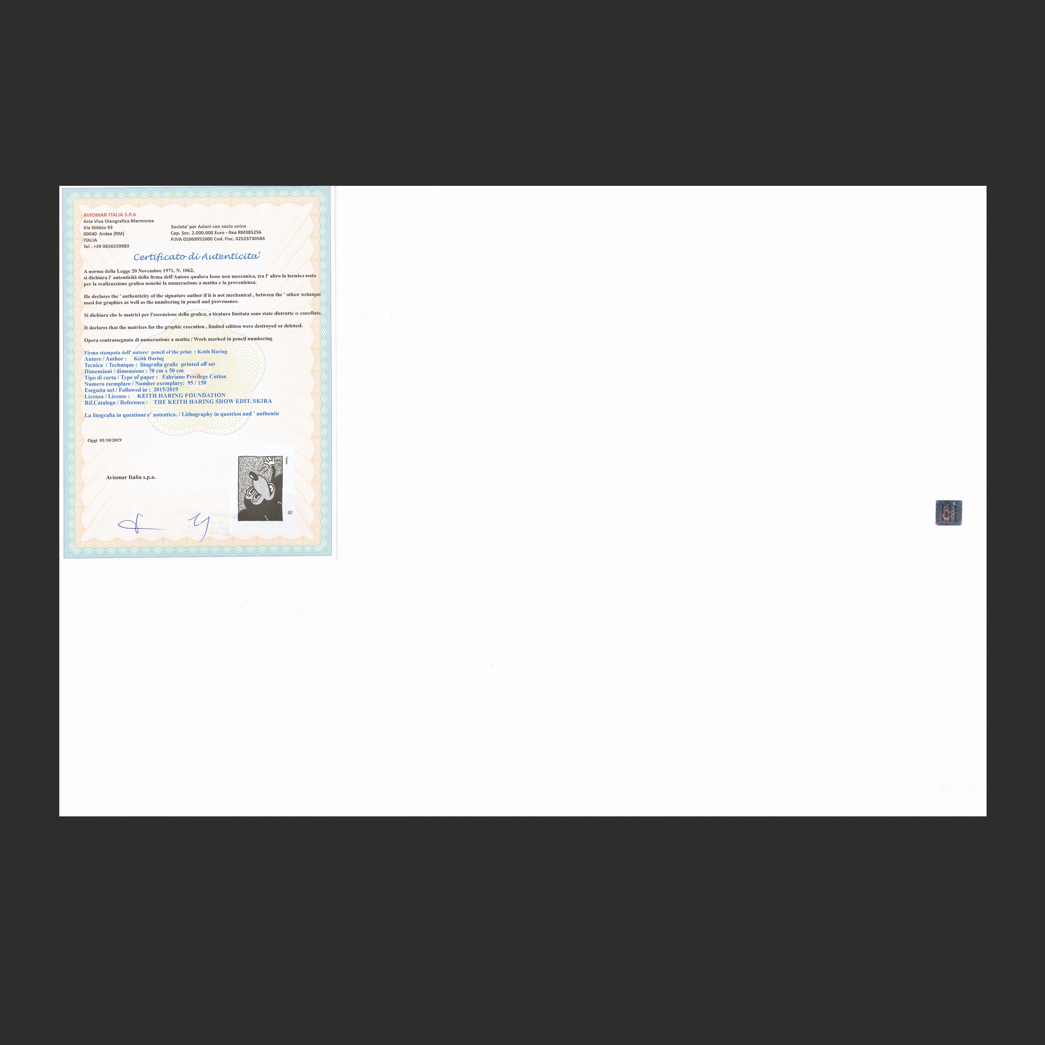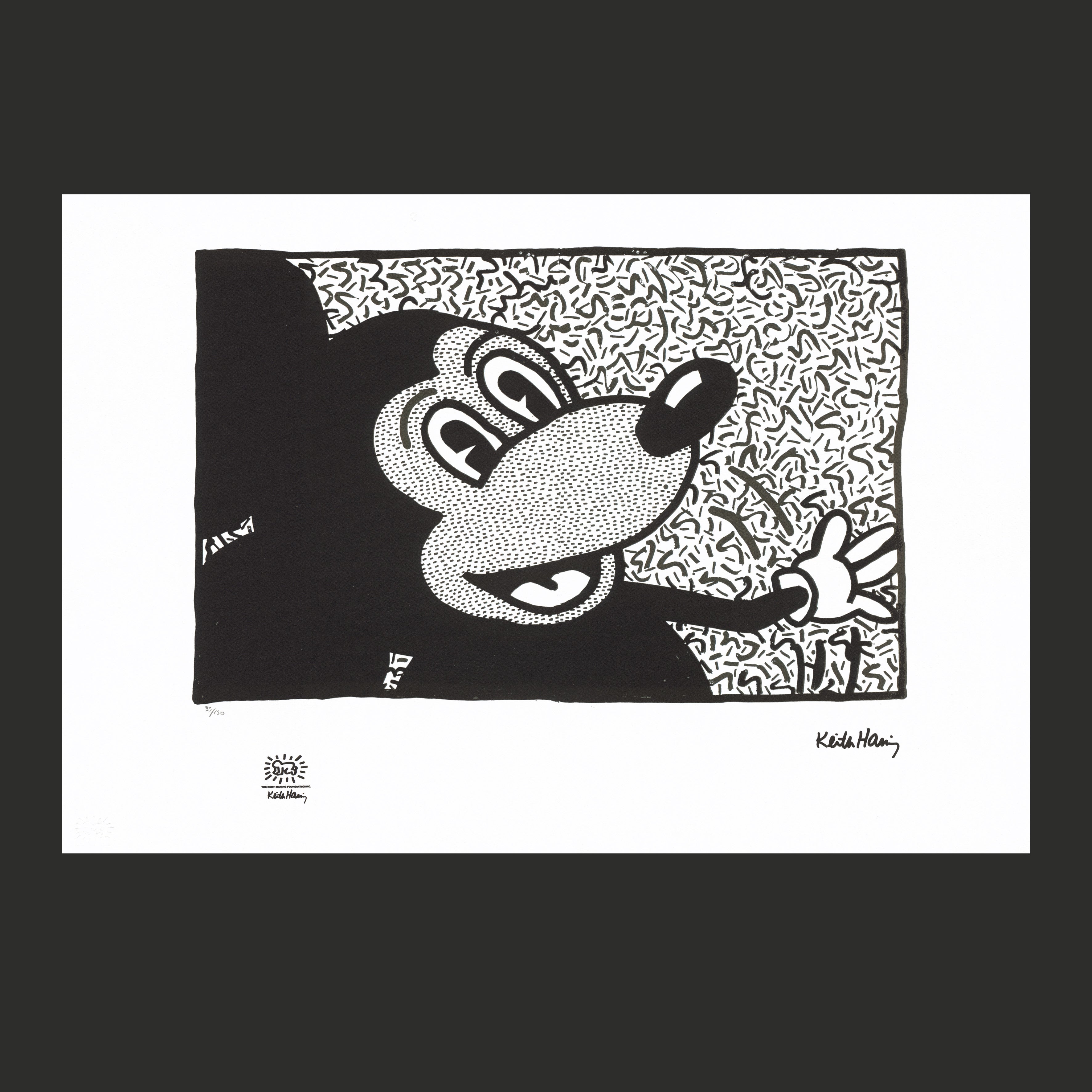 Certifikovaný grafický list, 50 x 70 cm. Číslováno, certifikát, slepotisk a licence KEITH HARING FOUNDATION, ruční papír Fabriano Privilege Cotton. Signováno vpravo dole Keith Haring.