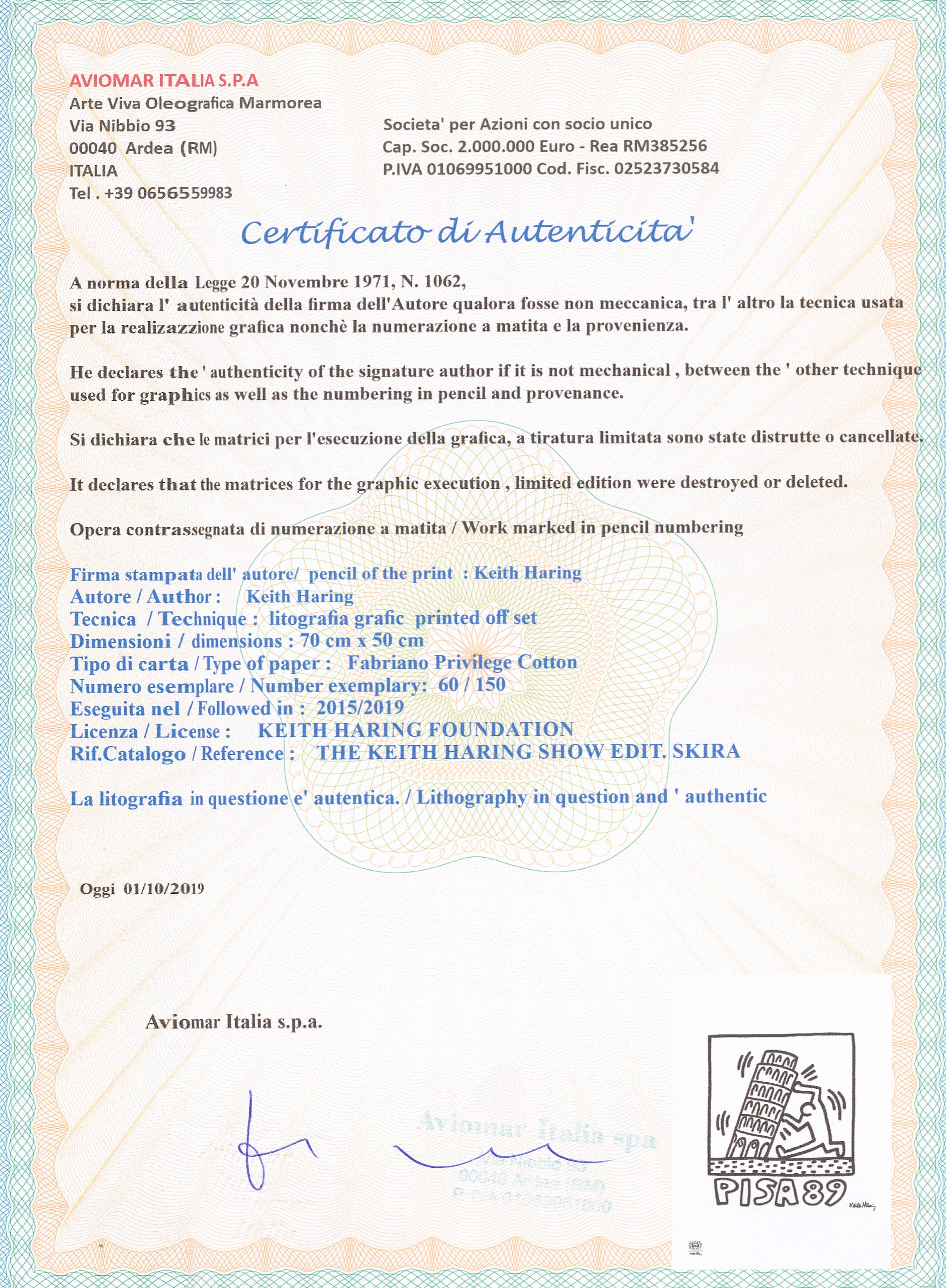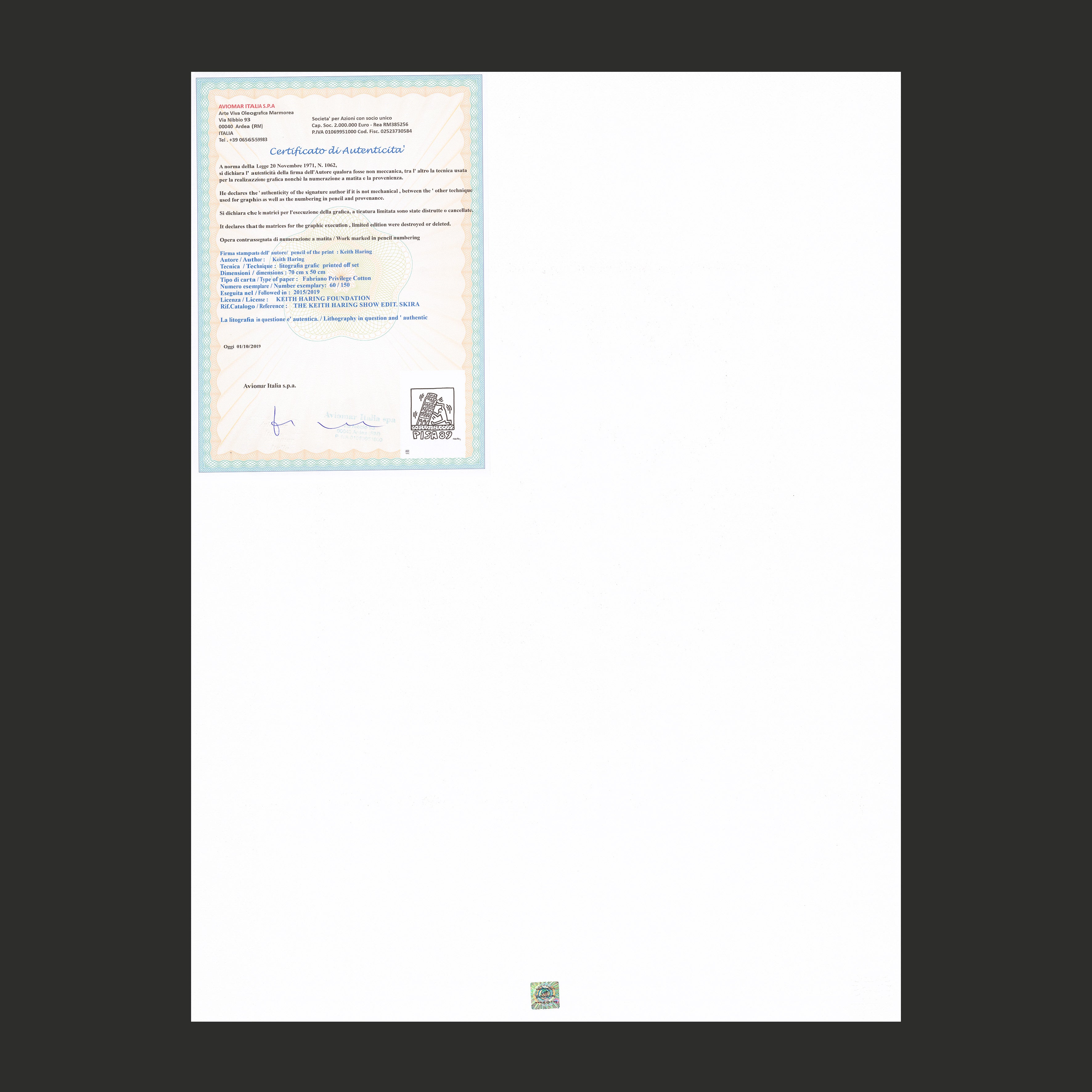 Certifikovaný grafický list, 50 x 70 cm. Číslováno, certifikát, slepotisk a licence KEITH HARING FOUNDATION, ruční papír Fabriano Privilege Cotton. Signováno vpravo dole Keith Haring. Číslo konkrétního grafického listu se může lišit od uvedeného vyobrazení.