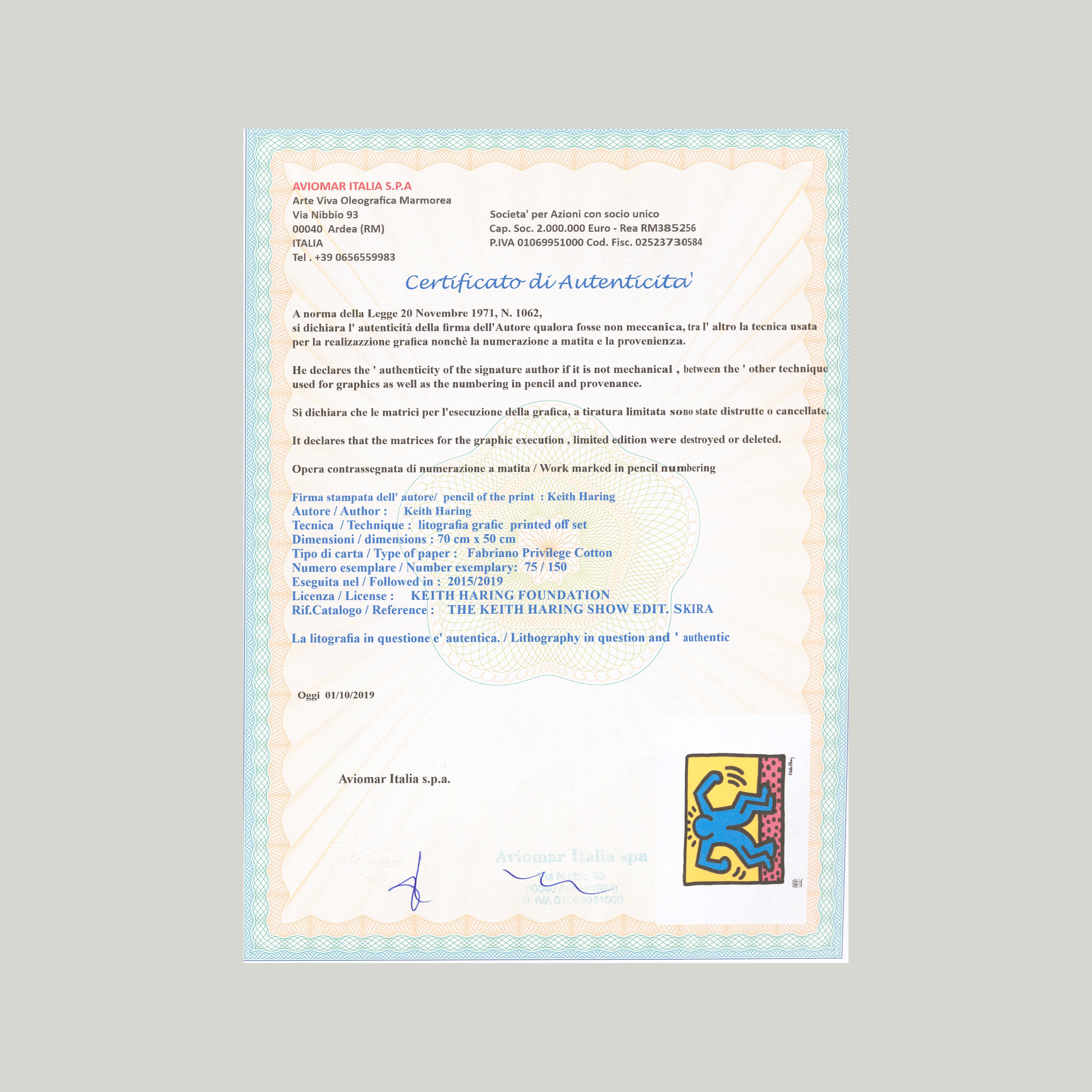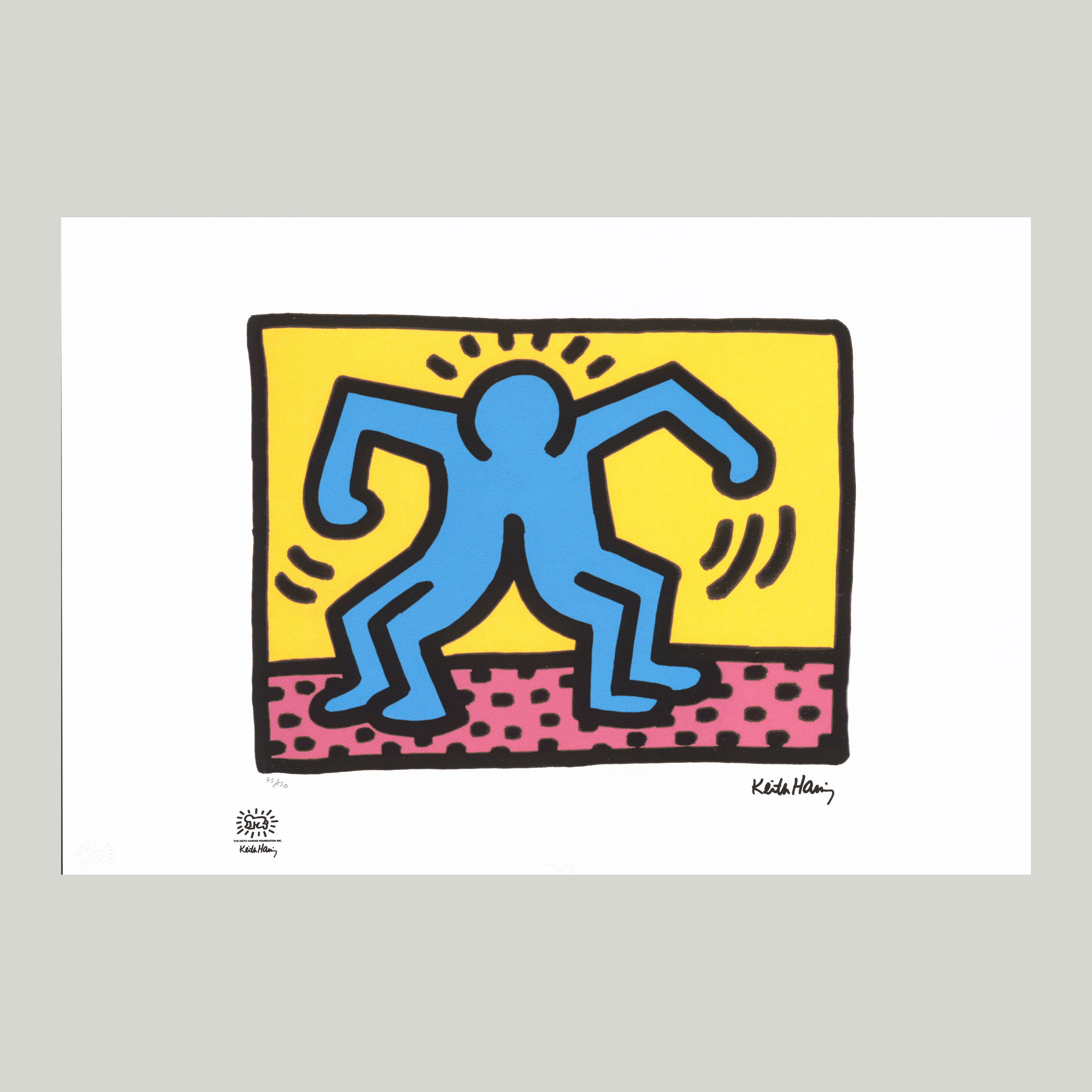 Certifikovaný grafický list, 50 x 70 cm. Číslováno, certifikát, slepotisk a licence KEITH HARING FOUNDATION, ruční papír Fabriano Privilege Cotton. Signováno vpravo dole Keith Haring.