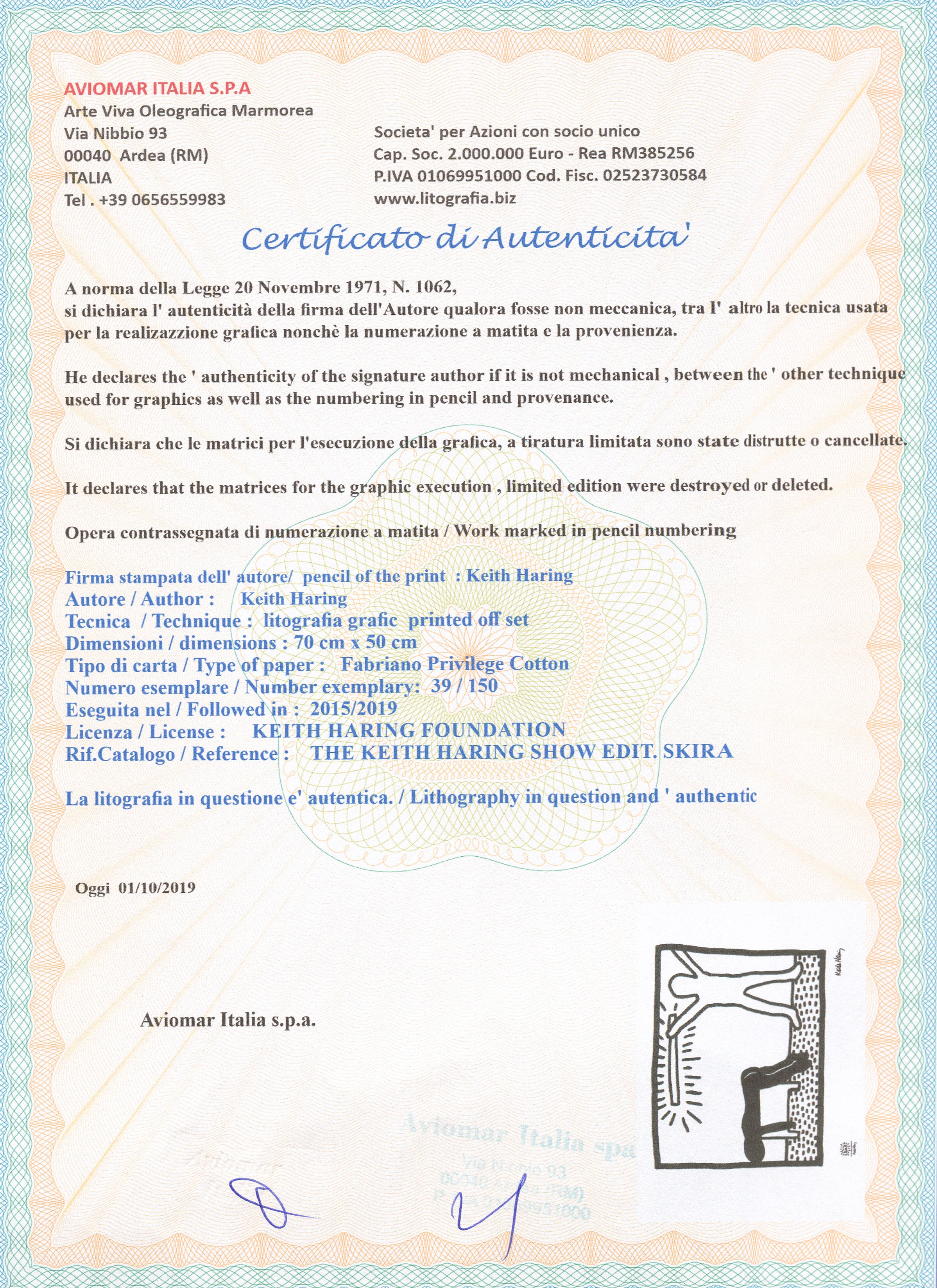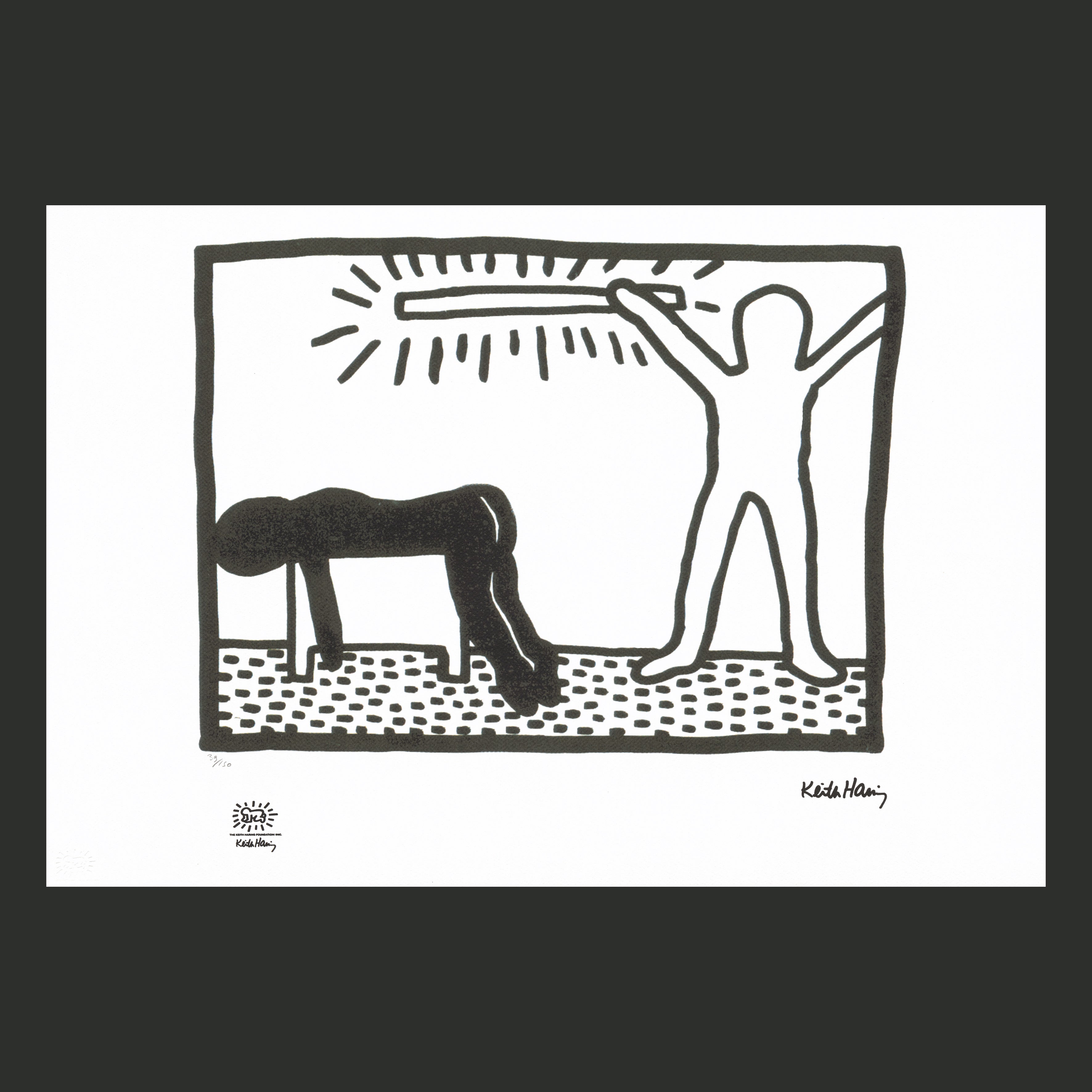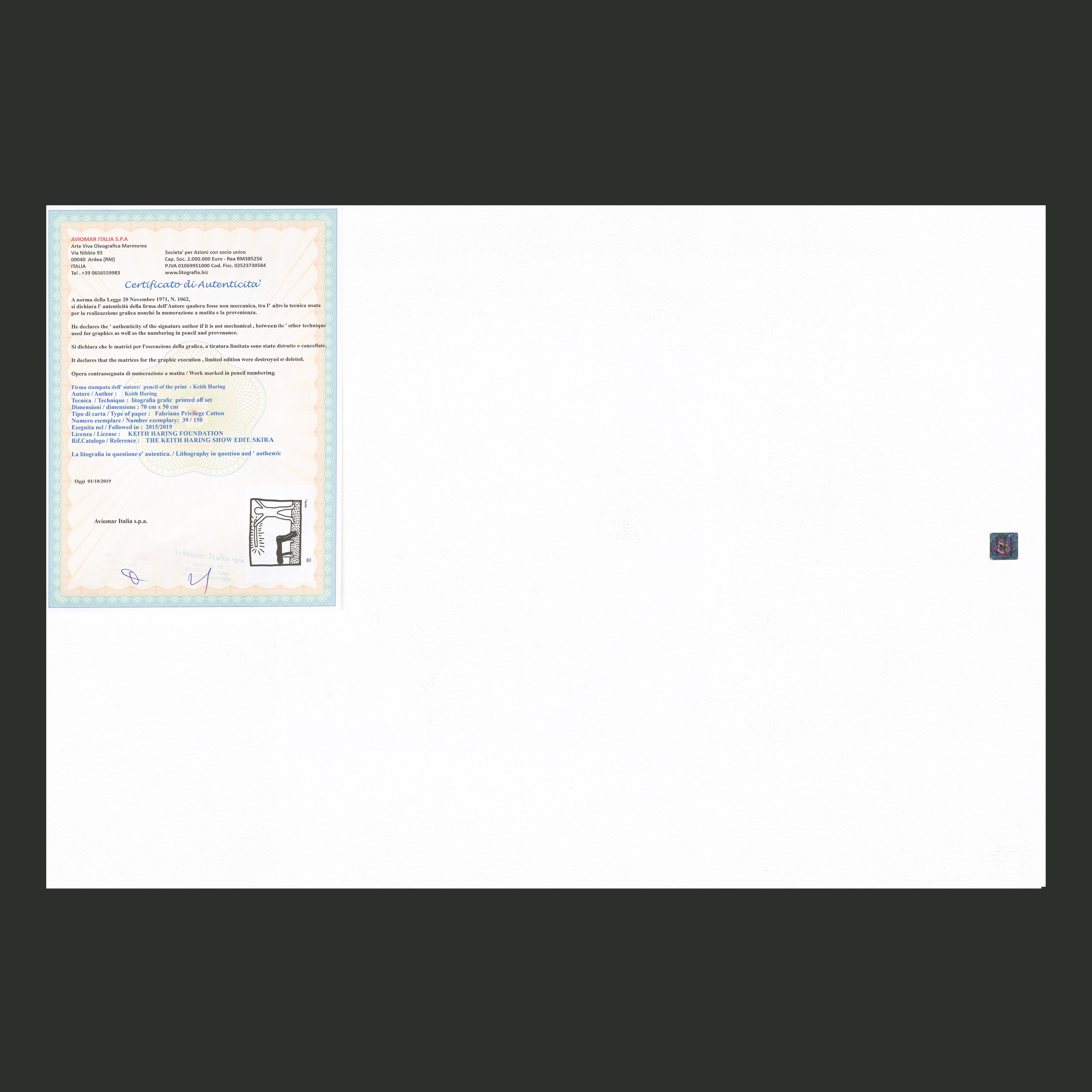 Certifikovaný grafický list, 50 x 70 cm. Číslováno, certifikát, slepotisk a licence KEITH HARING FOUNDATION, ruční papír Fabriano Privilege Cotton. Signováno vpravo dole Keith Haring.