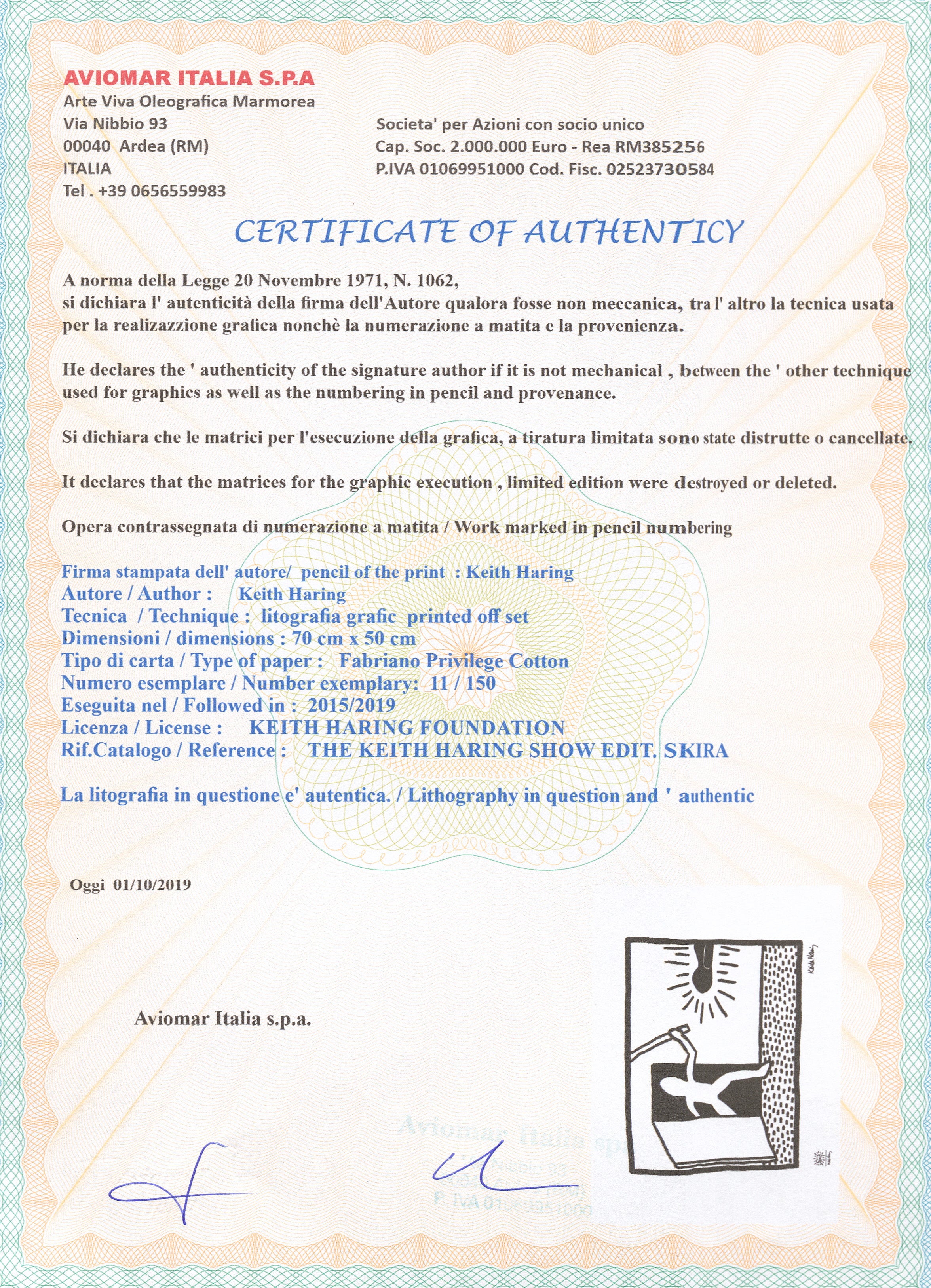Certifikovaný grafický list, 50 x 70 cm. Číslováno, certifikát, slepotisk a licence KEITH HARING FOUNDATION, ruční papír Fabriano Privilege Cotton. Signováno vpravo dole Keith Haring.