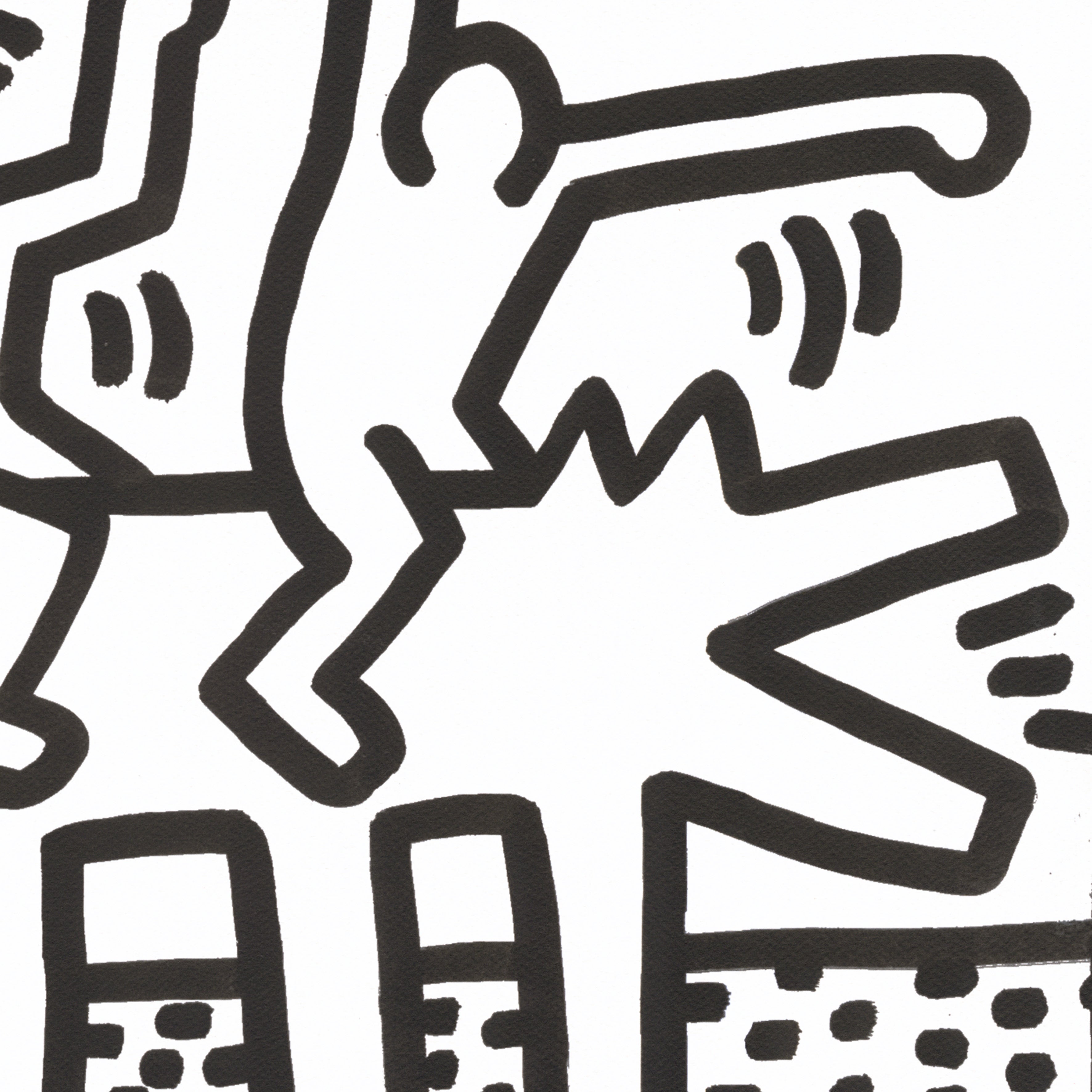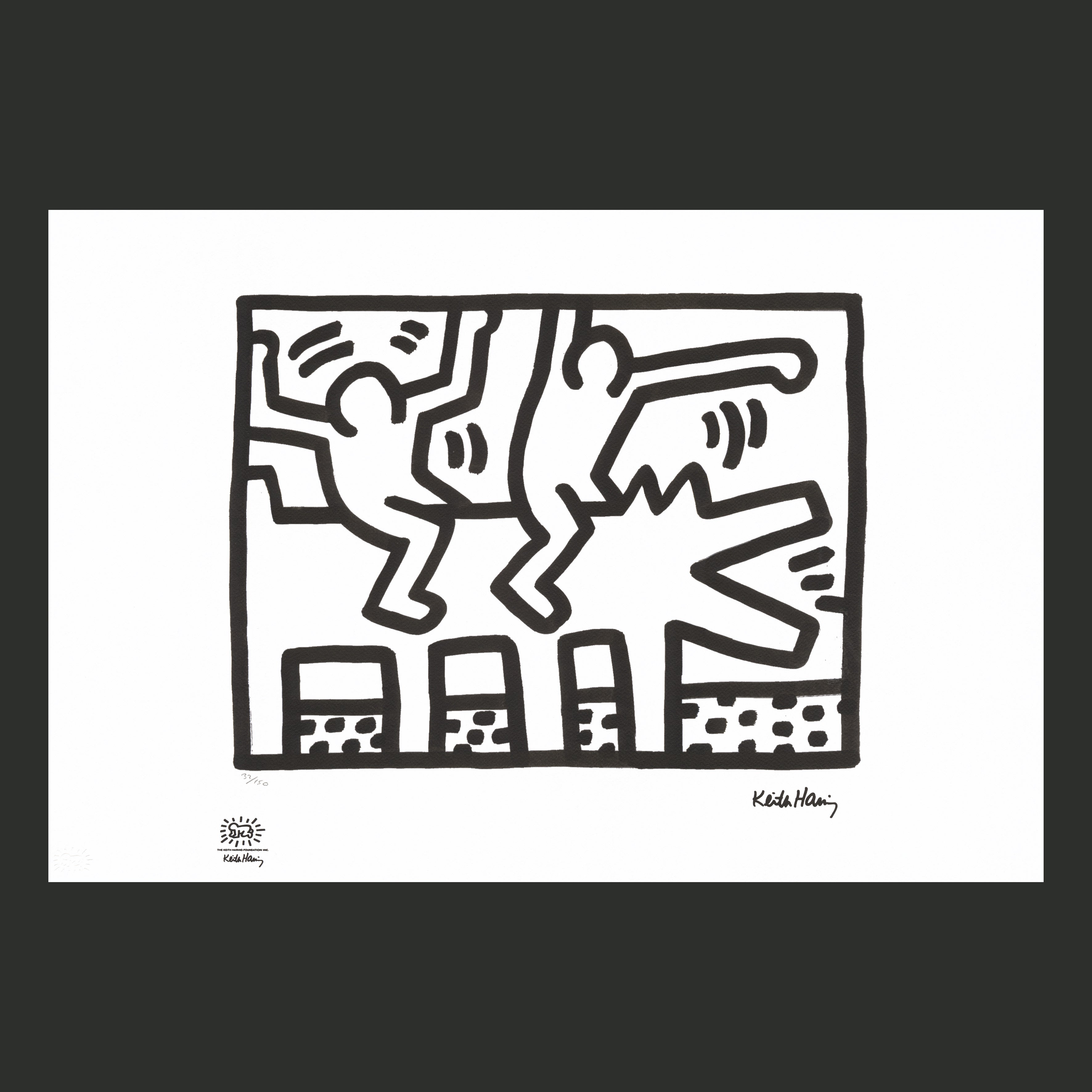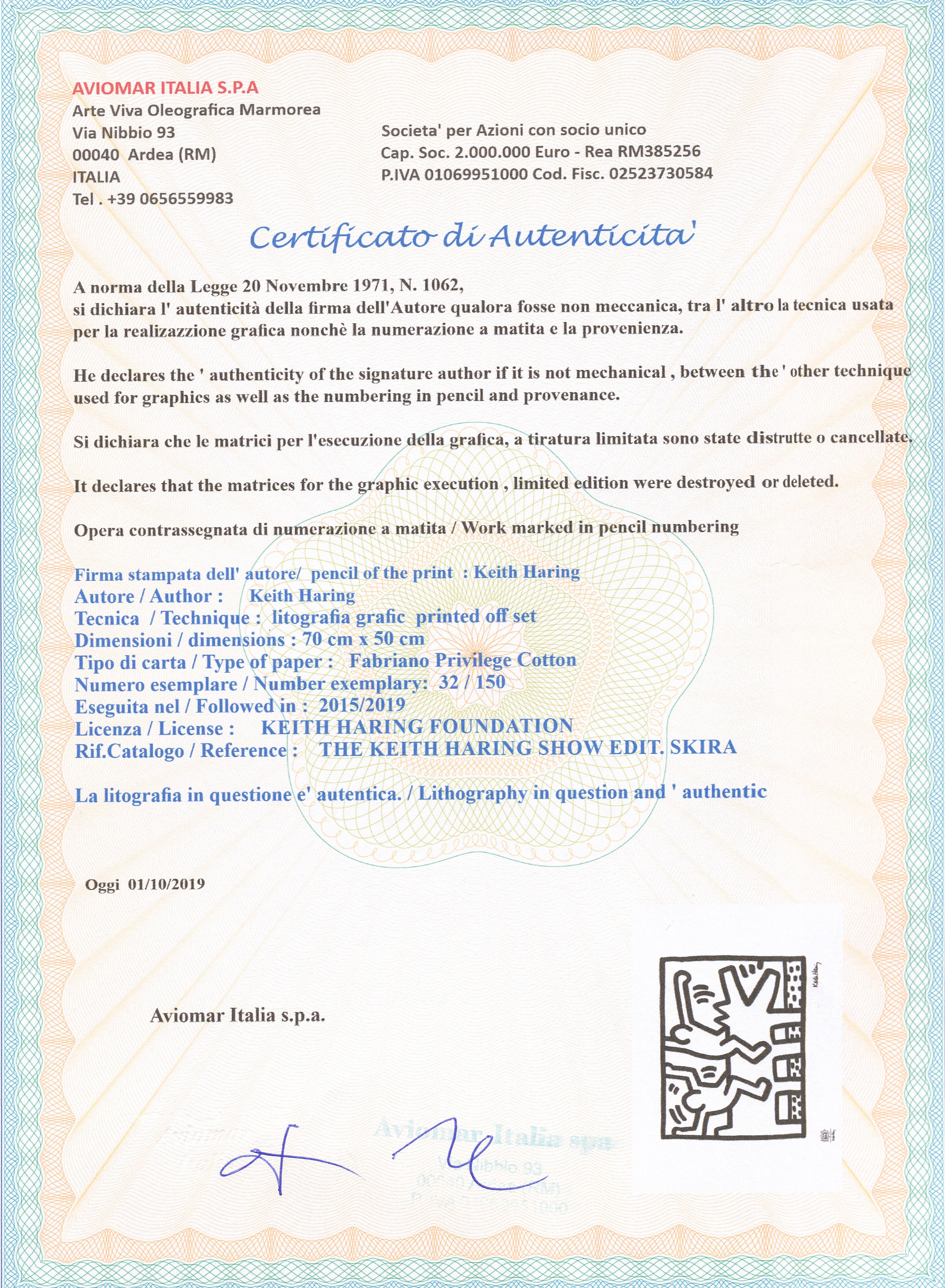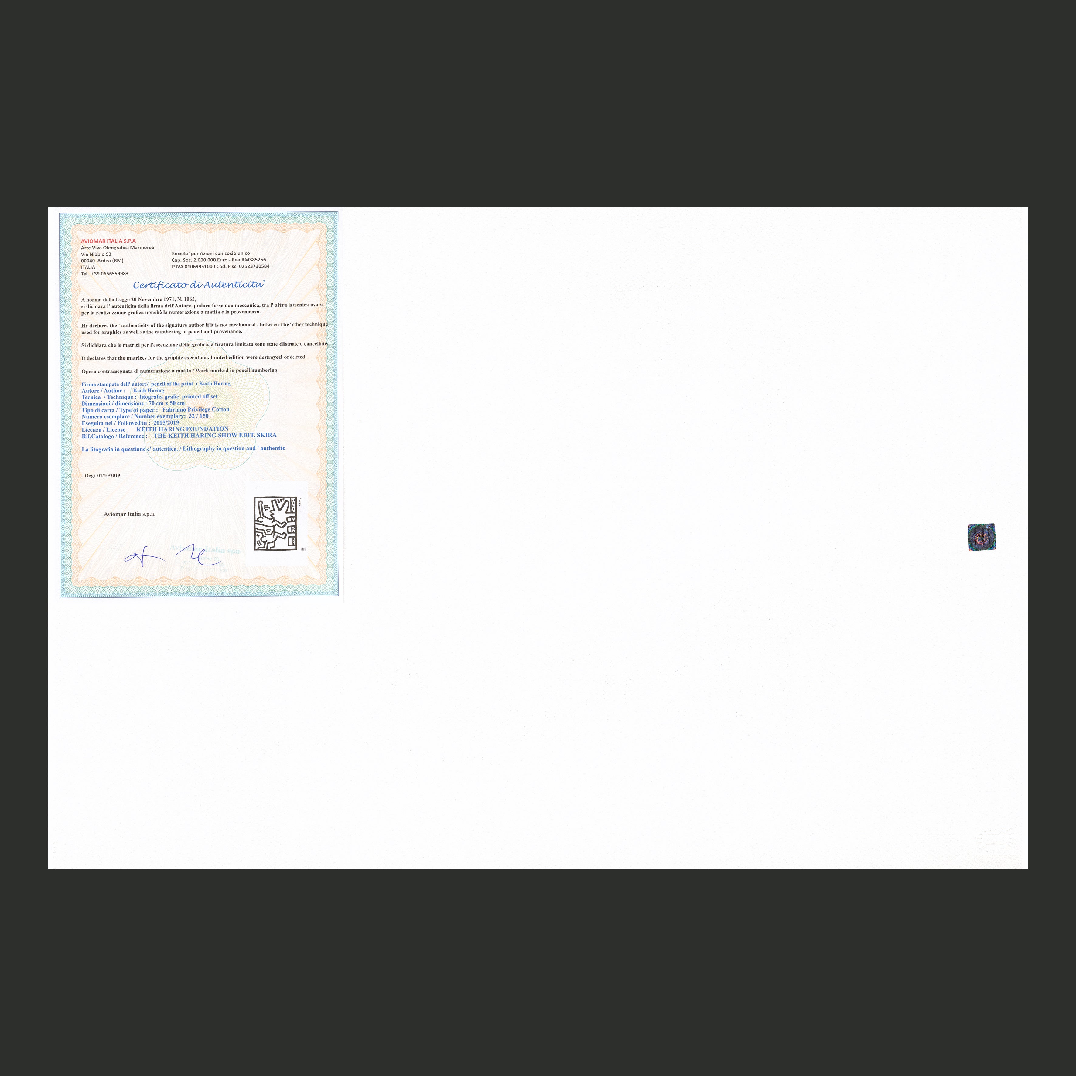 Certifikovaný grafický list, 50 x 70 cm. Číslováno 32/150, certifikát, slepotisk a licence KEITH HARING FOUNDATION, ruční papír Fabriano Privilege Cotton. Signováno vpravo dole Keith Haring.