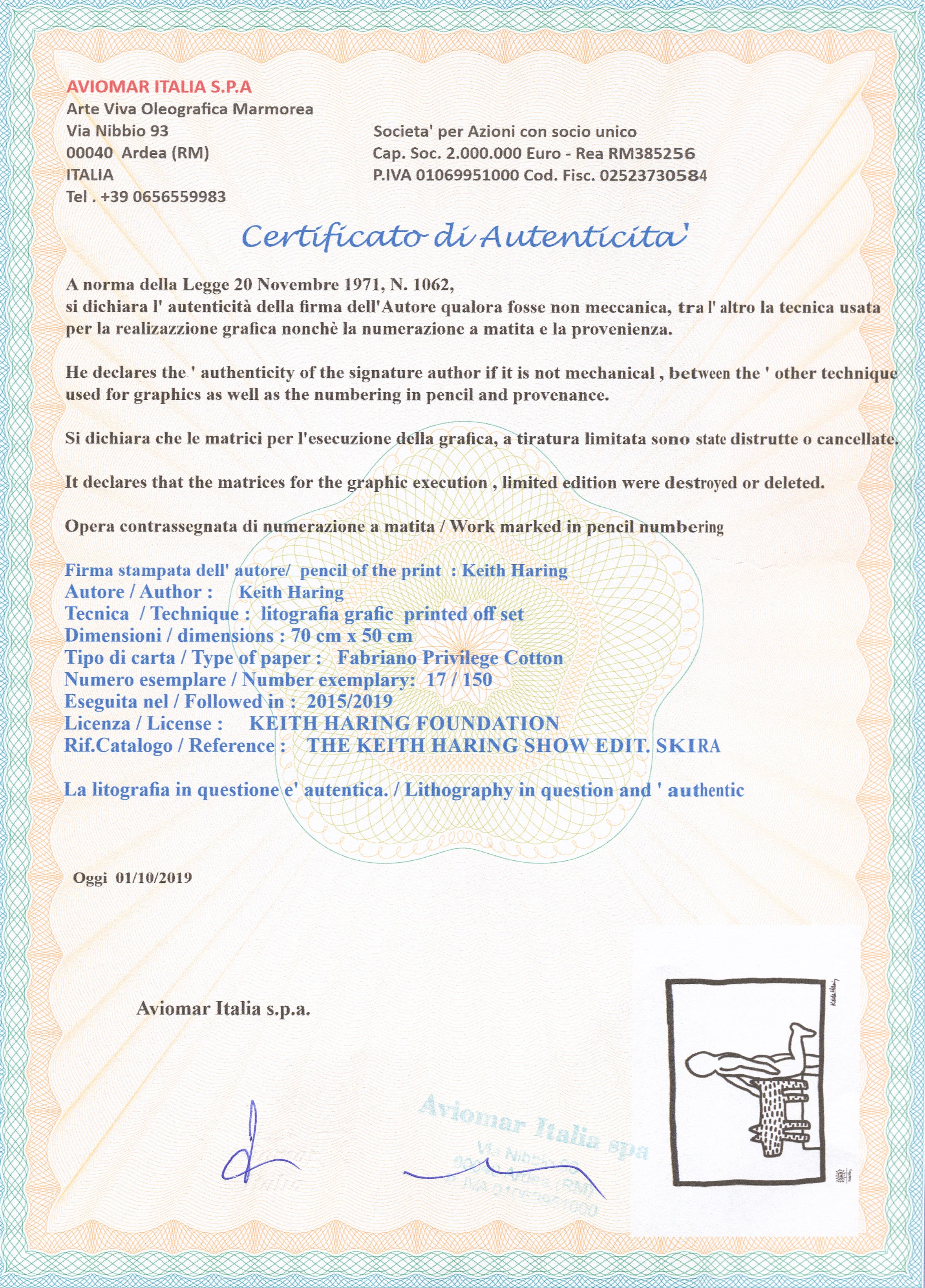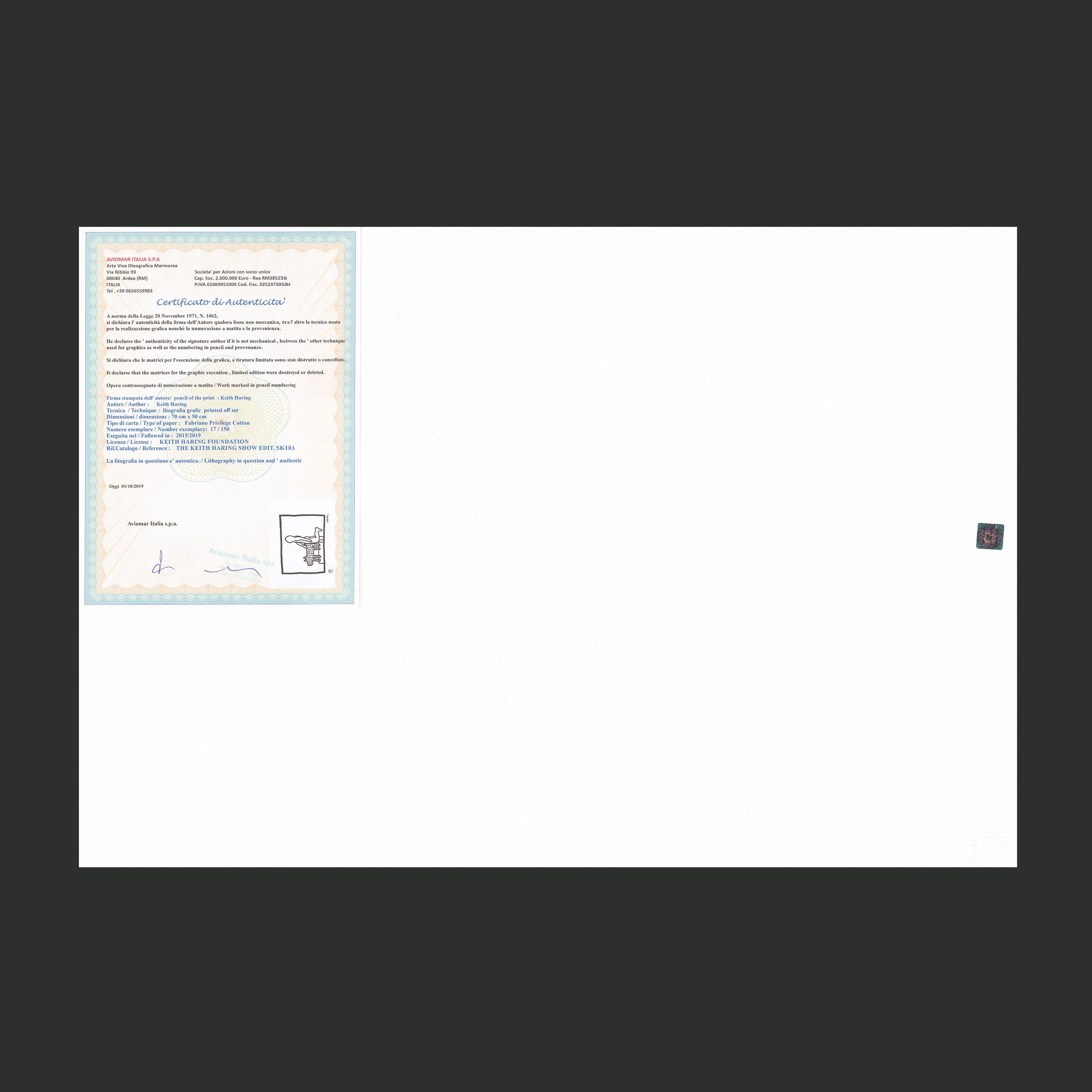 Certifikovaný grafický list, 50 x 70 cm. Číslováno, certifikát, slepotisk a licence KEITH HARING FOUNDATION, ruční papír Fabriano Privilege Cotton. Signováno vpravo dole Keith Haring.