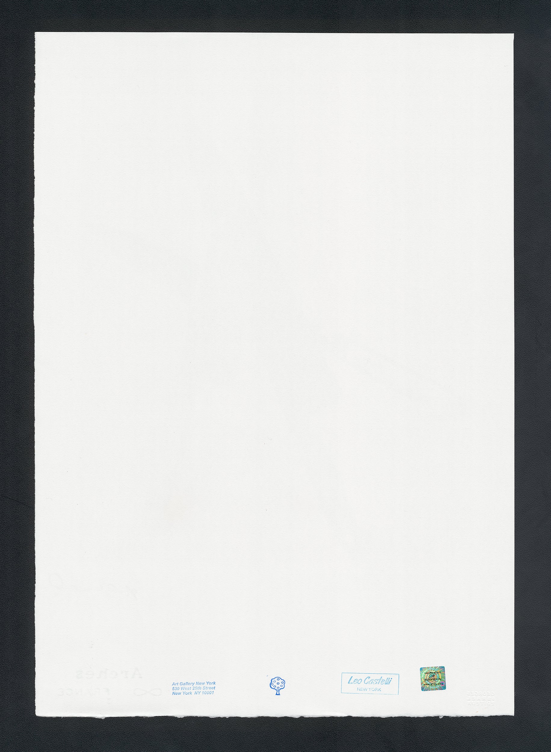 Certifikovaný grafický list, 38 x 56 cm. Certifikát, slepotisk © ANDY WARHOL, ruční papír Fabriano Privilege. Signováno vpravo dole Andy Warhol. Na zadní straně razítka: ANDY WARHOL Factory.
