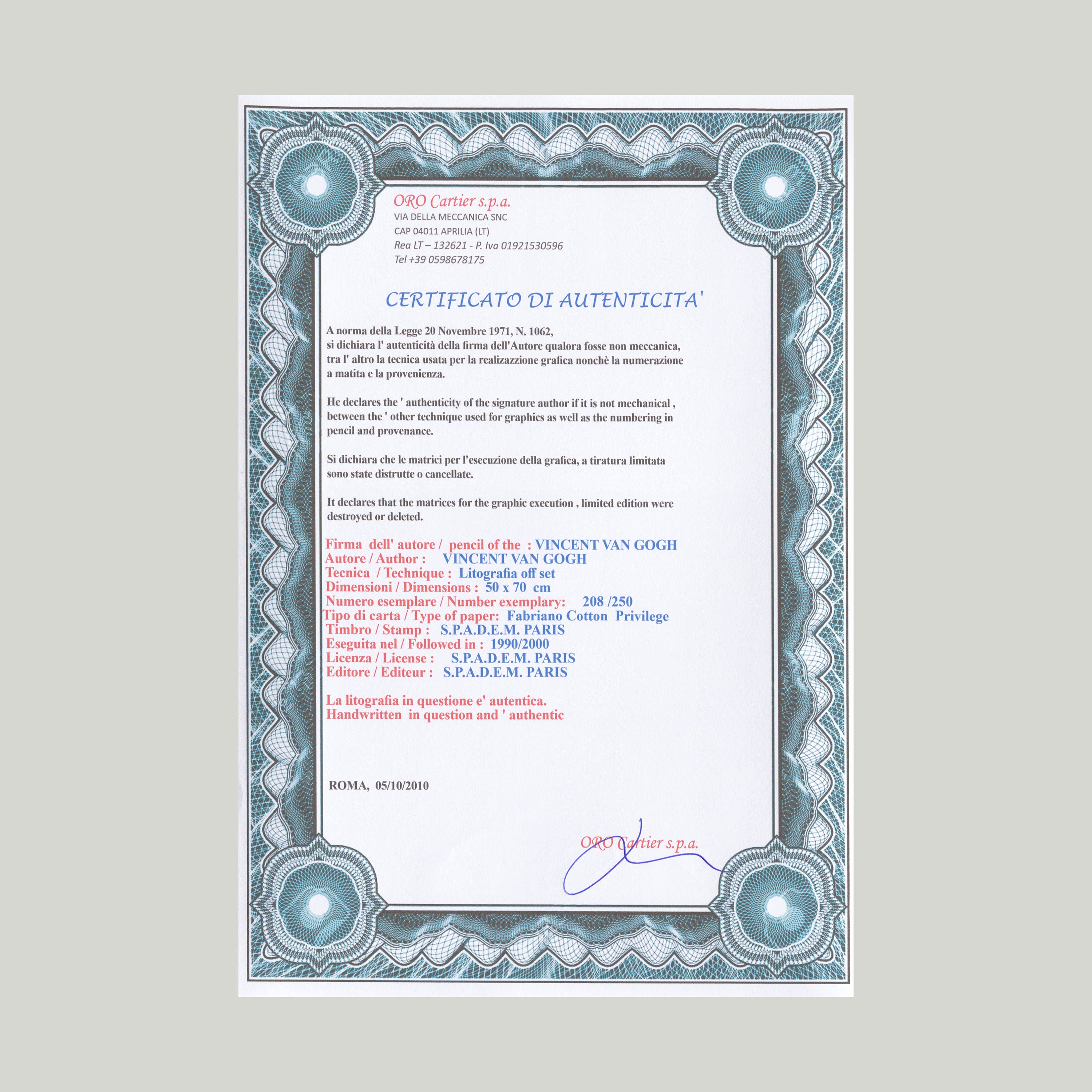 Certifikovaný grafický list, 50x70 cm. Číslováno 208/250. Certifikát, ruční papír Fabriano Cotton Privilege. Signováno vpravo dole Vincent van Gogh. Slepotisk S.P.A.D.E.M. Paris. Číslováno tužkou