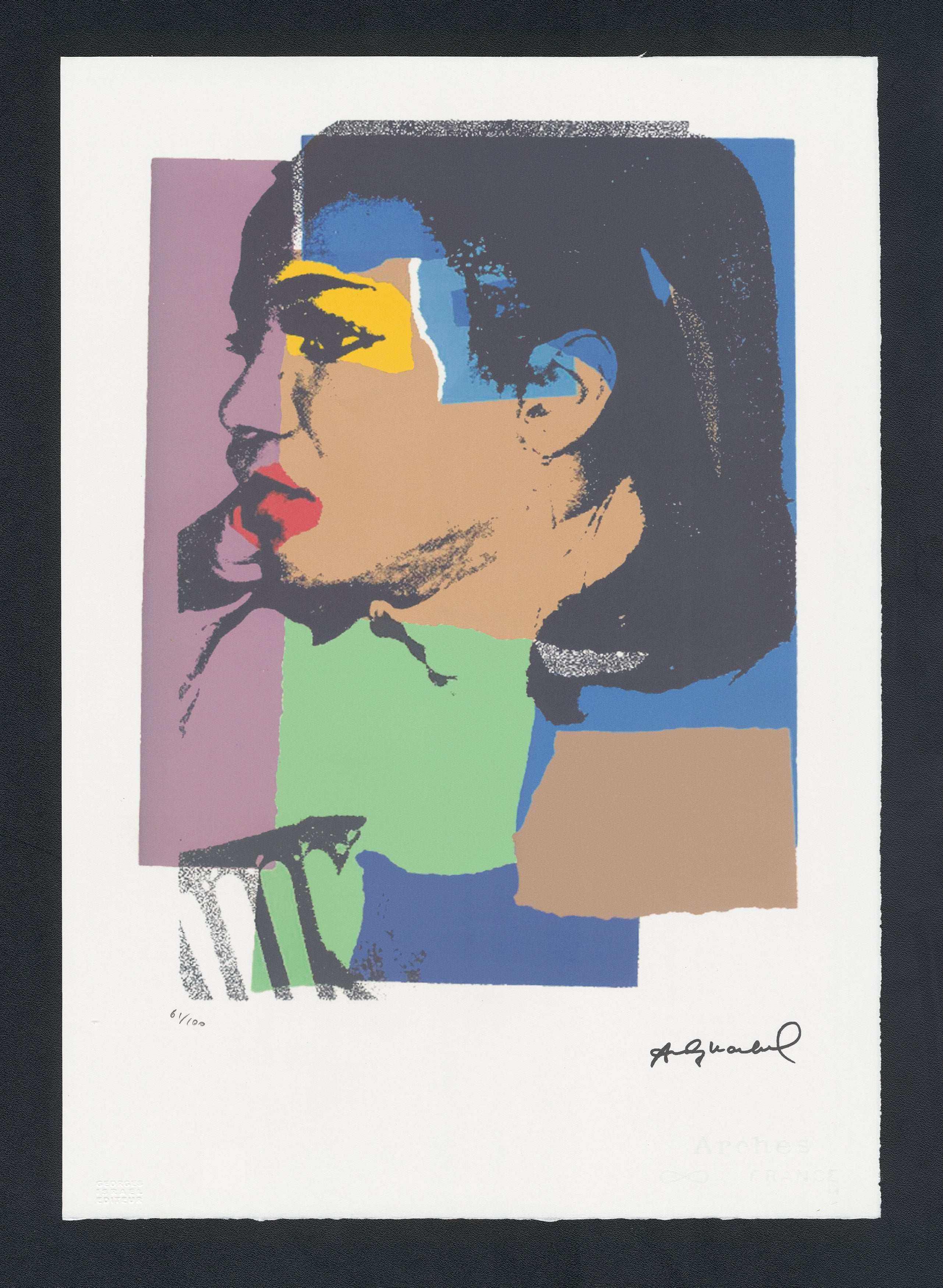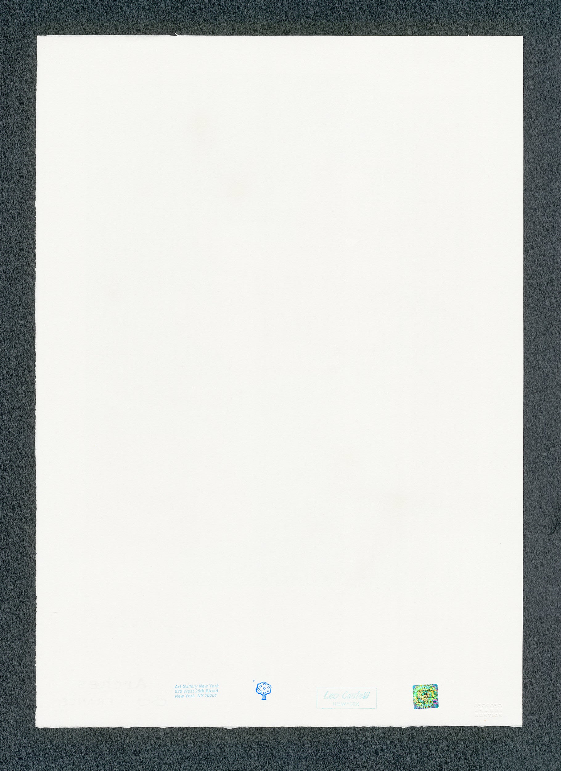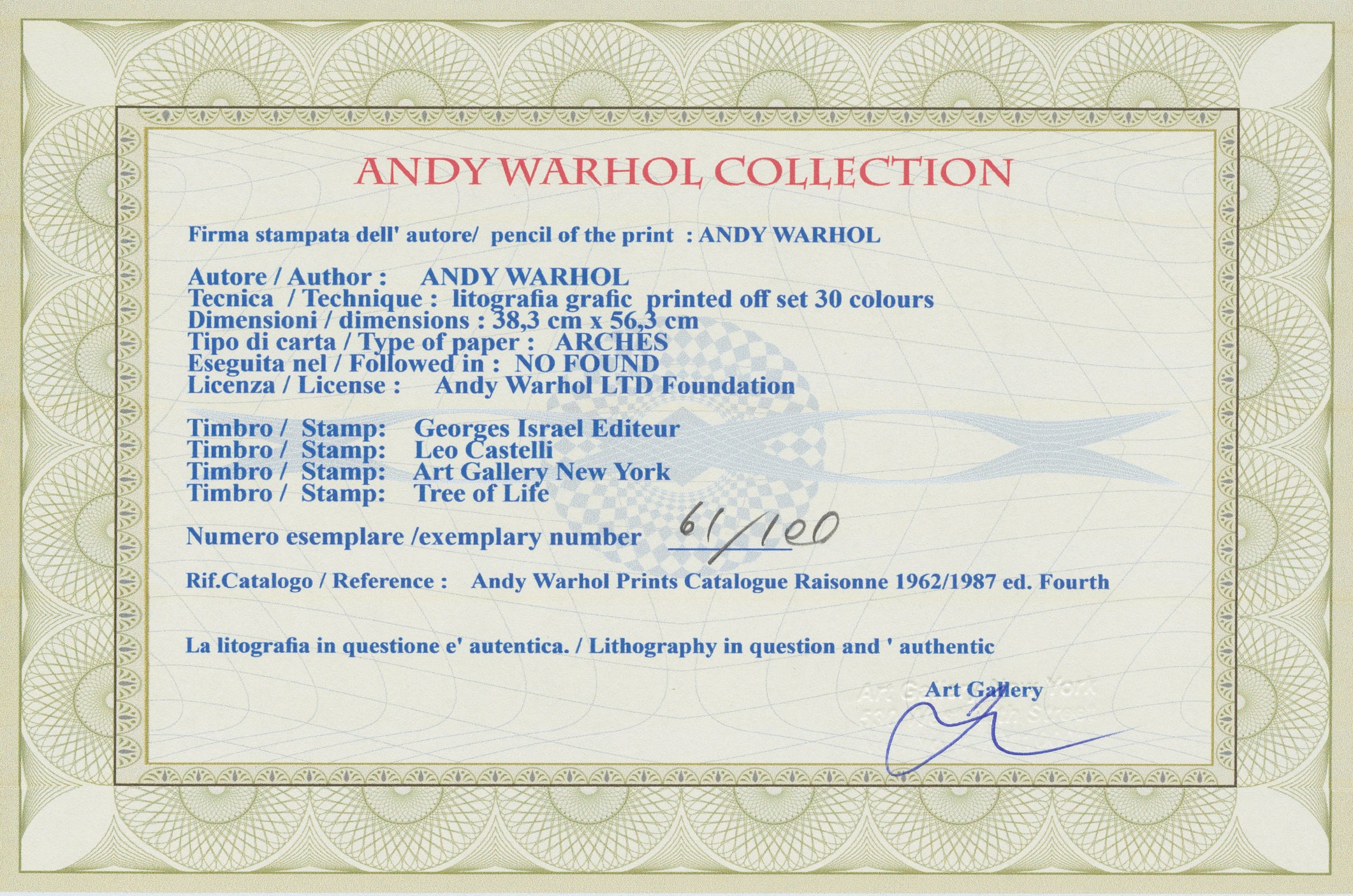 Certifikovaný grafický list, 38 x 56 cm, 61/100. Certifikát, slepotisk © ANDY WARHOL, ruční papír Fabriano Privilege. Signováno vpravo dole Andy Warhol. Na zadní straně razítka: ANDY WARHOL Factory.