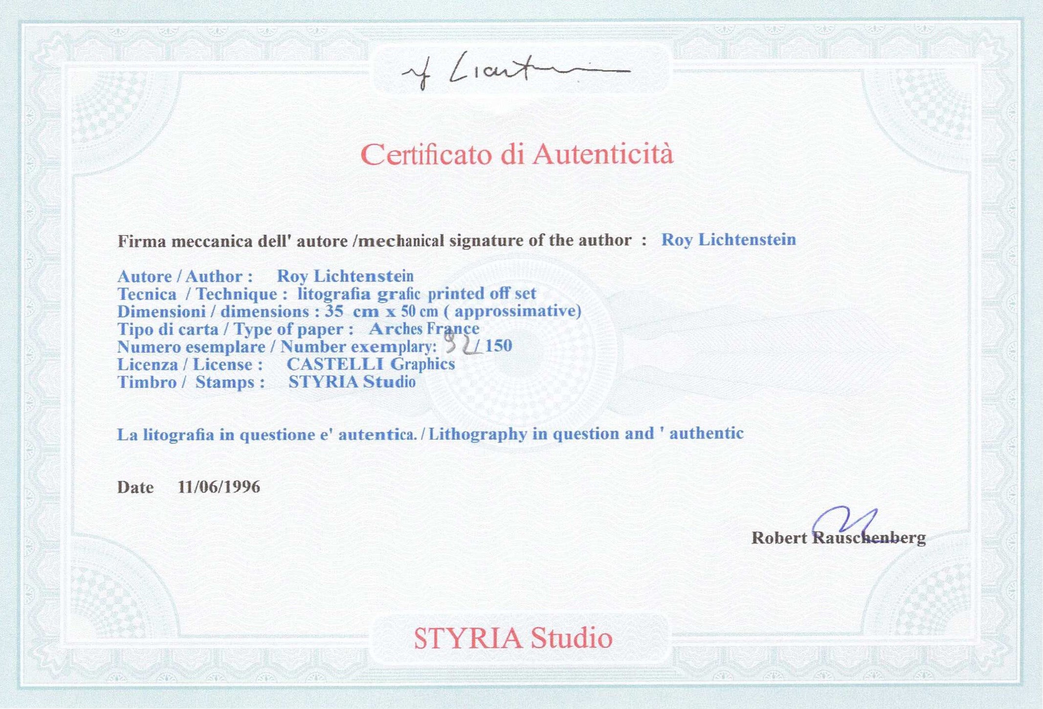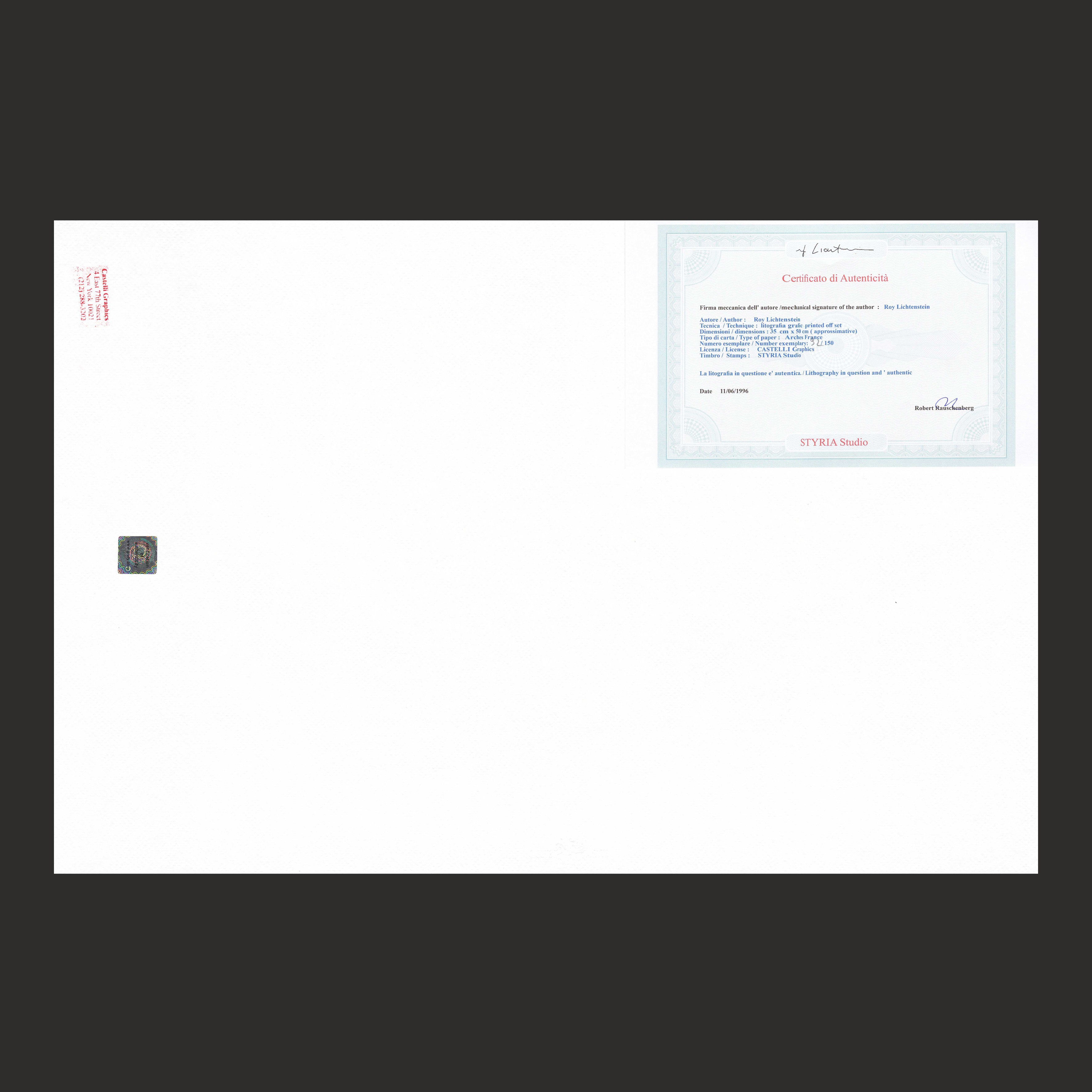 Certifikovaný grafický list, 35 x 50 cm. Certifikát, slepotisk STYRIA Studio, ruční papír Arches France. Signováno vpravo dole Roy Lichtenstein ©. Na zadní straně razítko: CASTELLI Graphics.