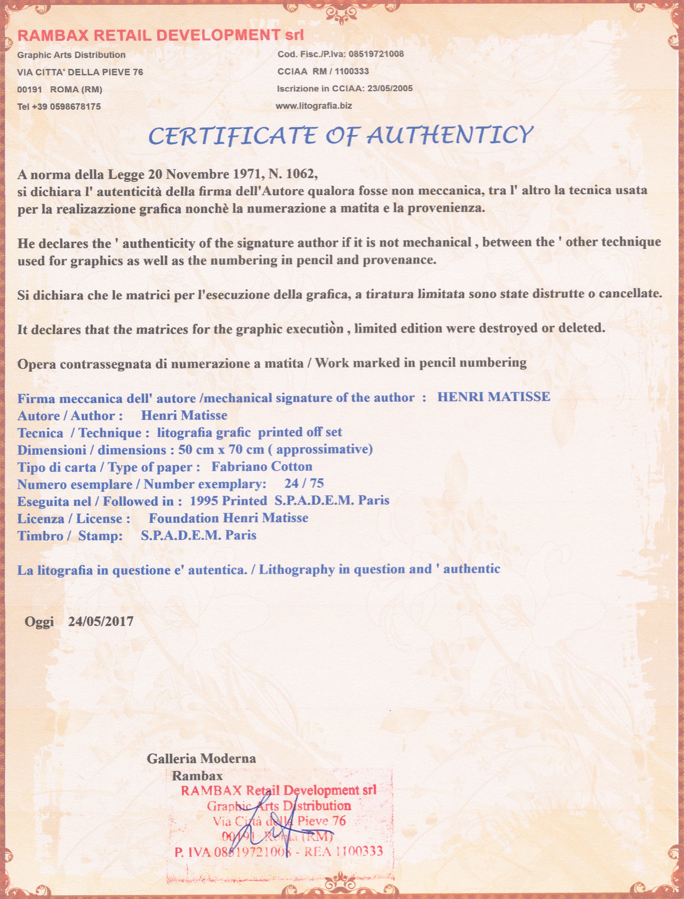 Grafický list 50x70 cm v limitovaném nákladu. Tisk č. 24/75. Slepotiskové razítko vydavatele díla. Ruční papír. Volný list.