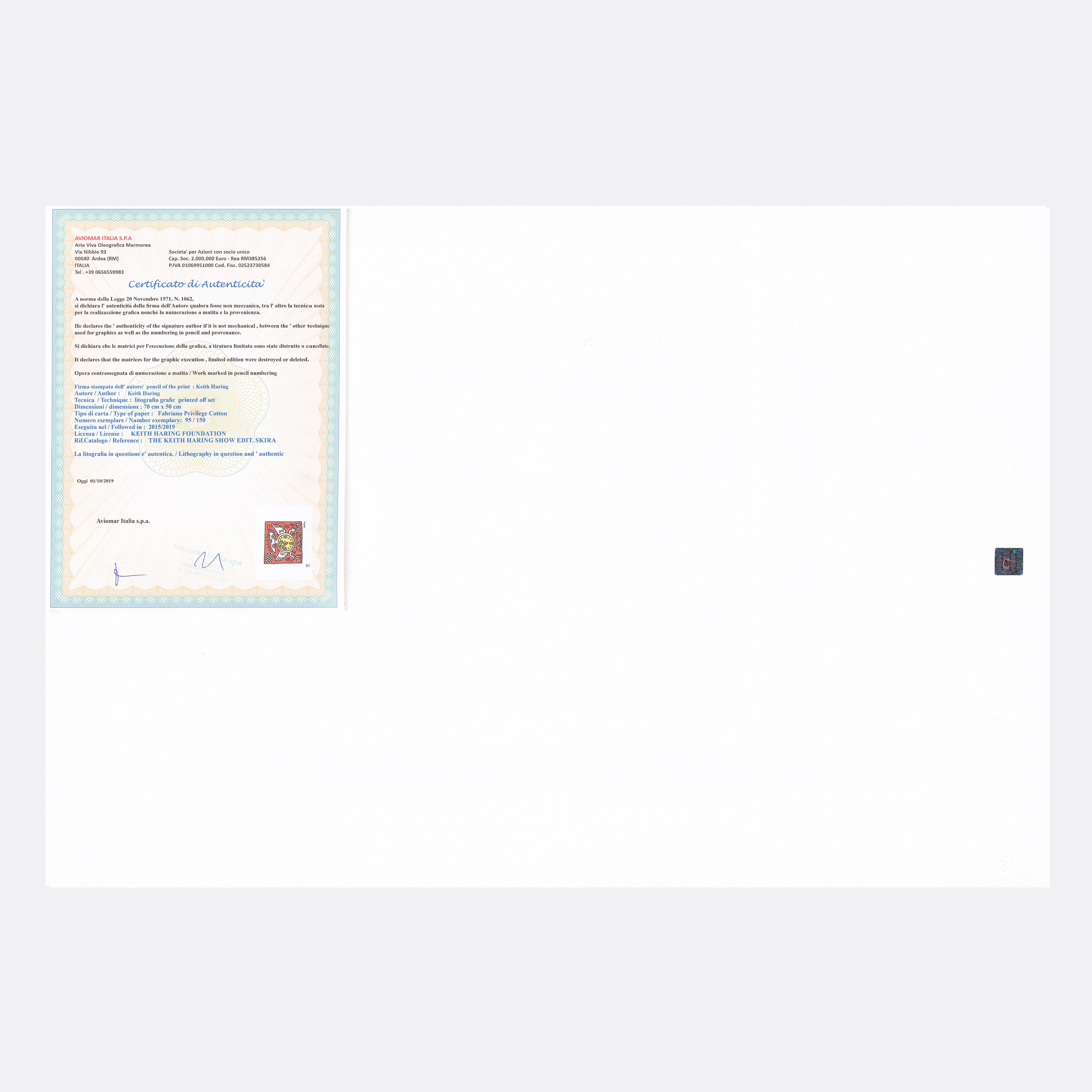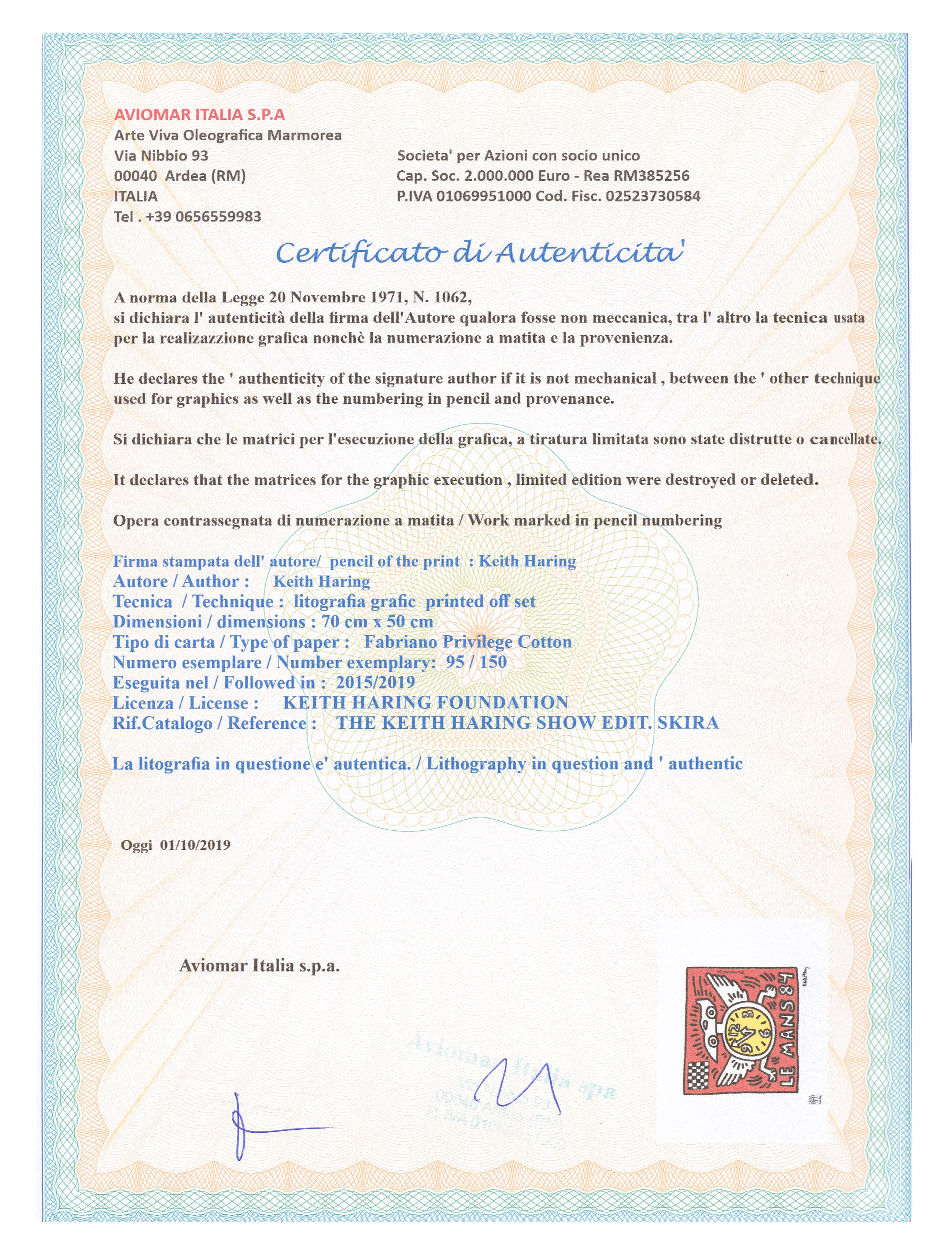 Certifikovaný grafický list, 50 x 70 cm. Číslováno, certifikát, slepotisk a licence KEITH HARING FOUNDATION, ruční papír Fabriano Privilege Cotton. Signováno vpravo dole Keith Haring. Číslo konkrétního grafického listu se může lišit od uvedeného vyobrazení.