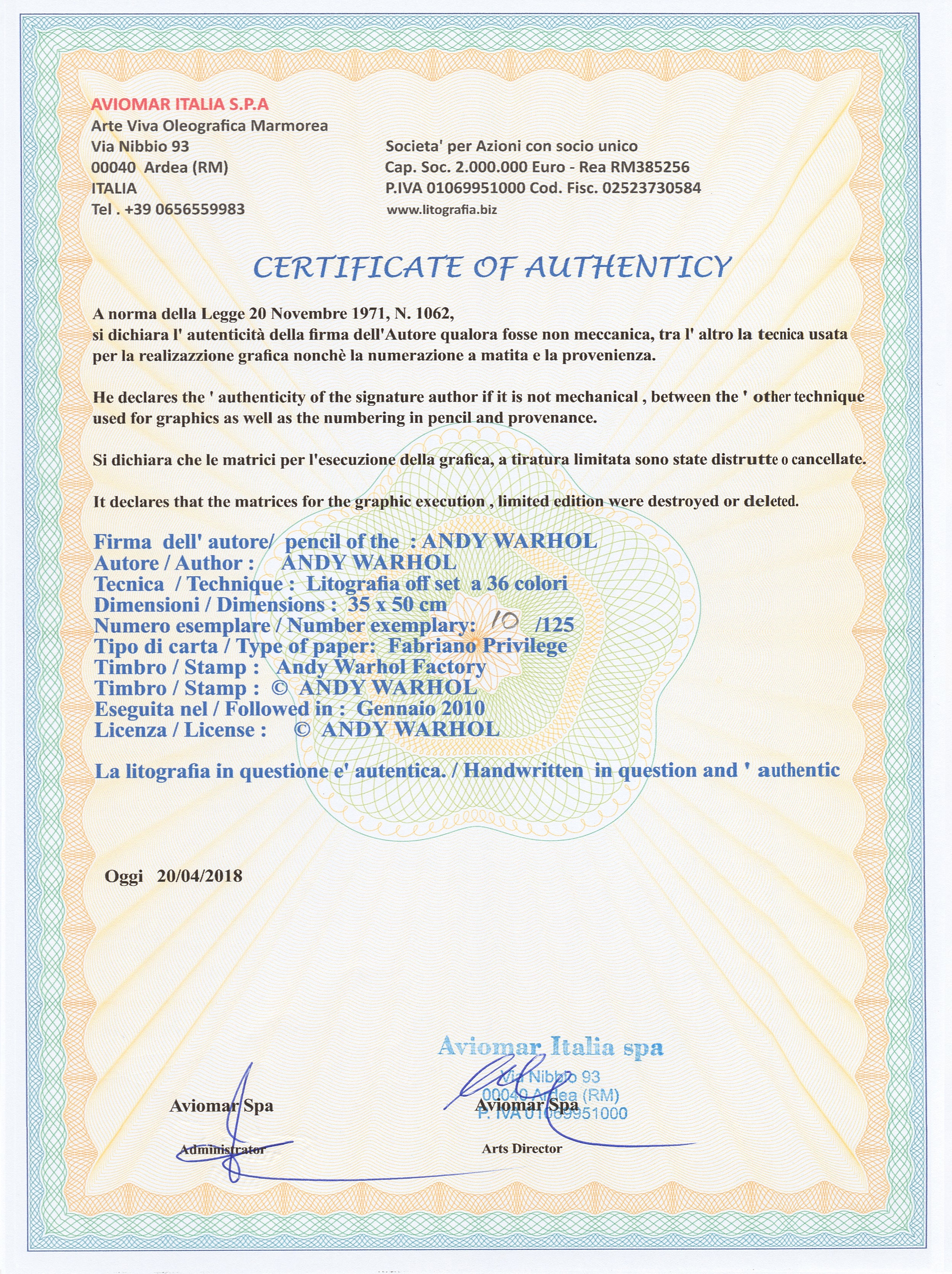 Certifikovaný grafický list, 35 x 50 cm. Certifikát, slepotisk © ANDY WARHOL, ruční papír Fabriano Privilege. Signováno vpravo dole Andy Warhol. Na zadní straně razítka: ANDY WARHOL Factory.