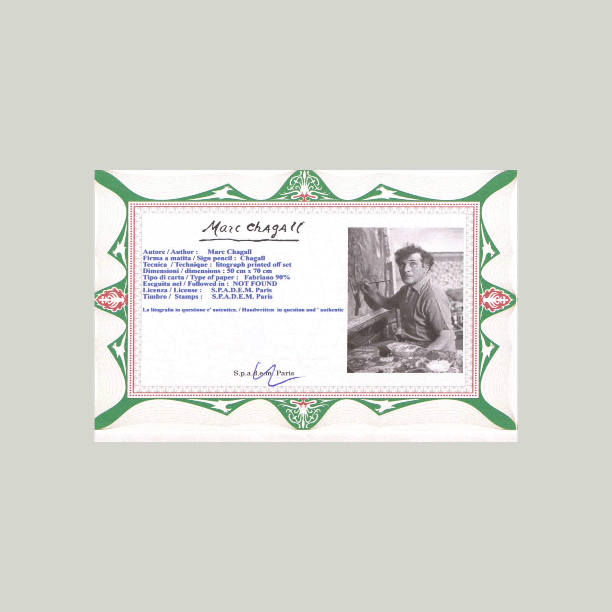 Grafický list 50x70 cm v limitovaném nákladu. Tisk č. 51/300. Slepotiskové razítko S.P.A.D.E.M. Paris. Volný list. Certifikát, ruční papír FABRIANO 90%. Licence: S.P.A.D.E.M. Paris