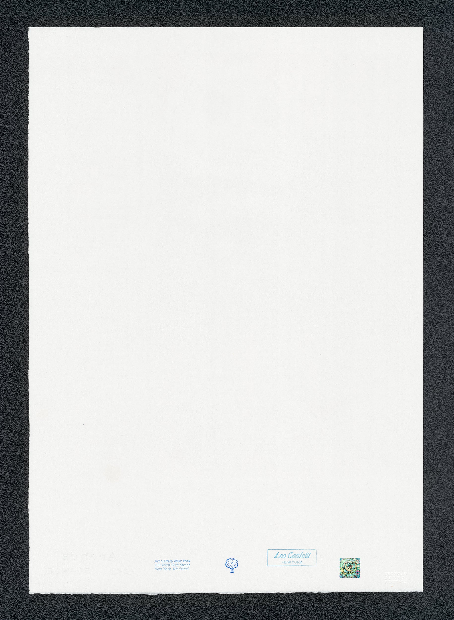 Certifikovaný grafický list, 38 x 56 cm. Certifikát, slepotisk © ANDY WARHOL, ruční papír Fabriano Privilege. Signováno vpravo dole Andy Warhol. Na zadní straně razítka: ANDY WARHOL Factory.