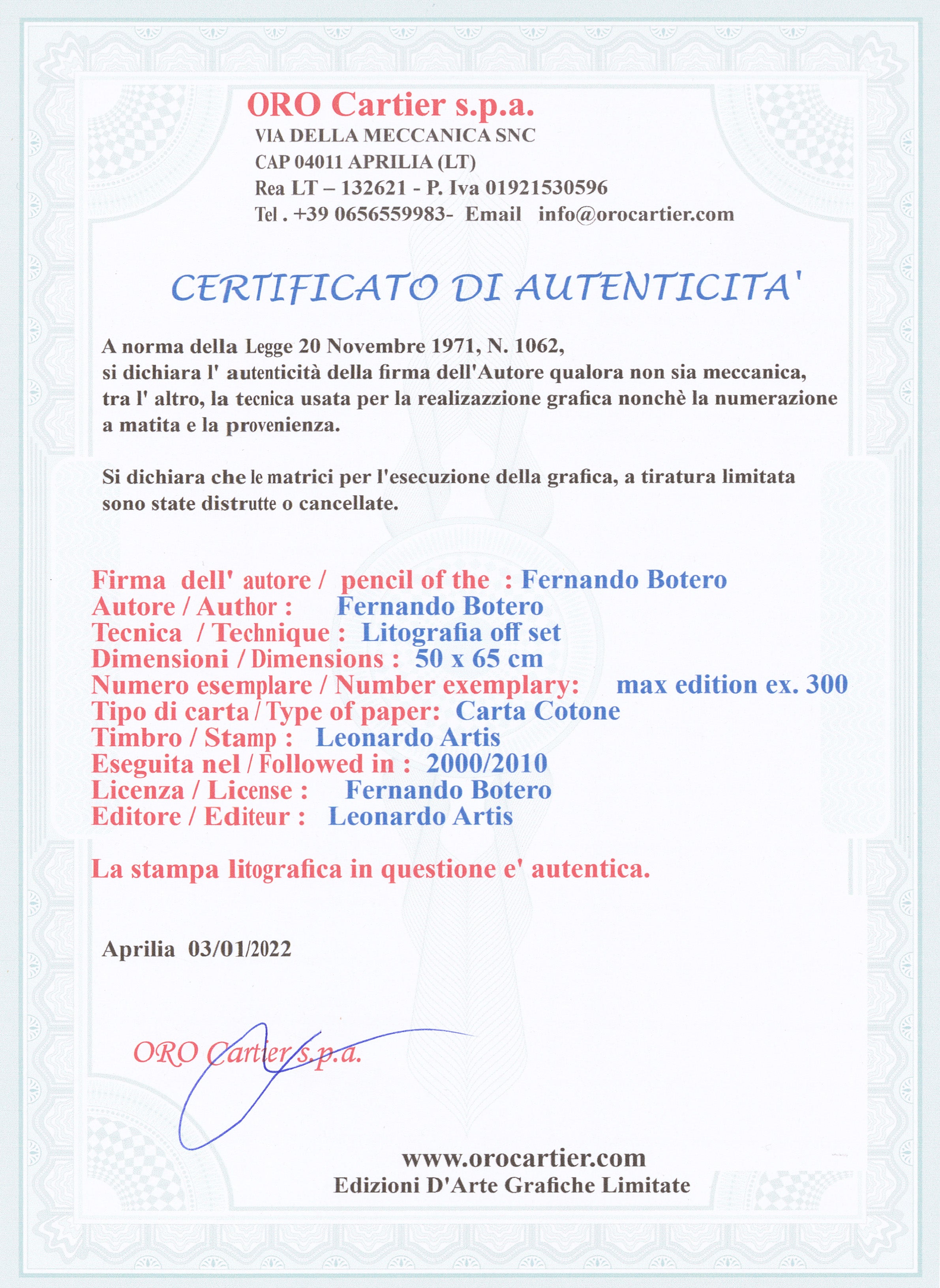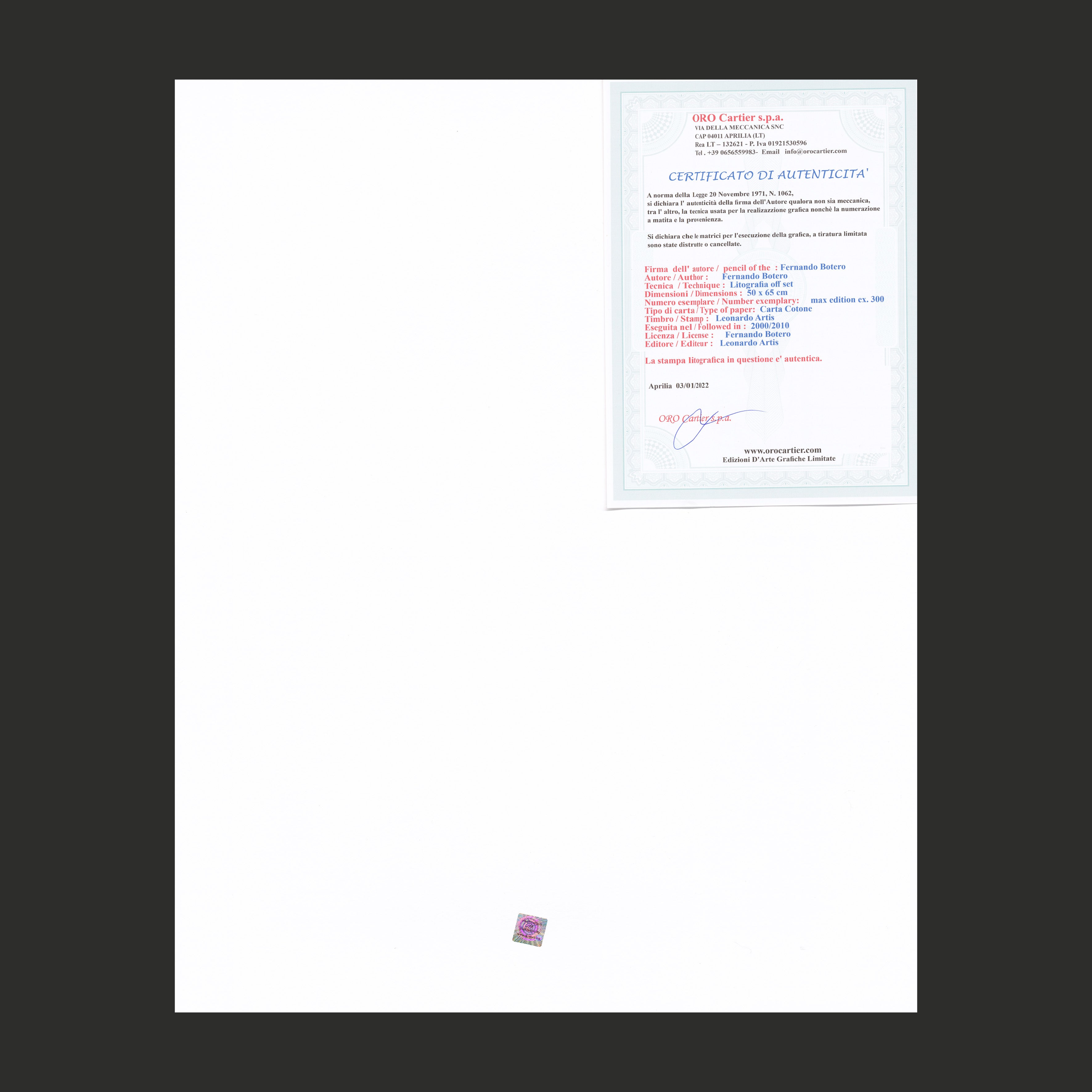 Certifikovaný grafický list, 50 x 650 cm. Číslováno 86/300. Certifikát, ruční papír Carta Cotone. Signováno vpravo dole Botero.
