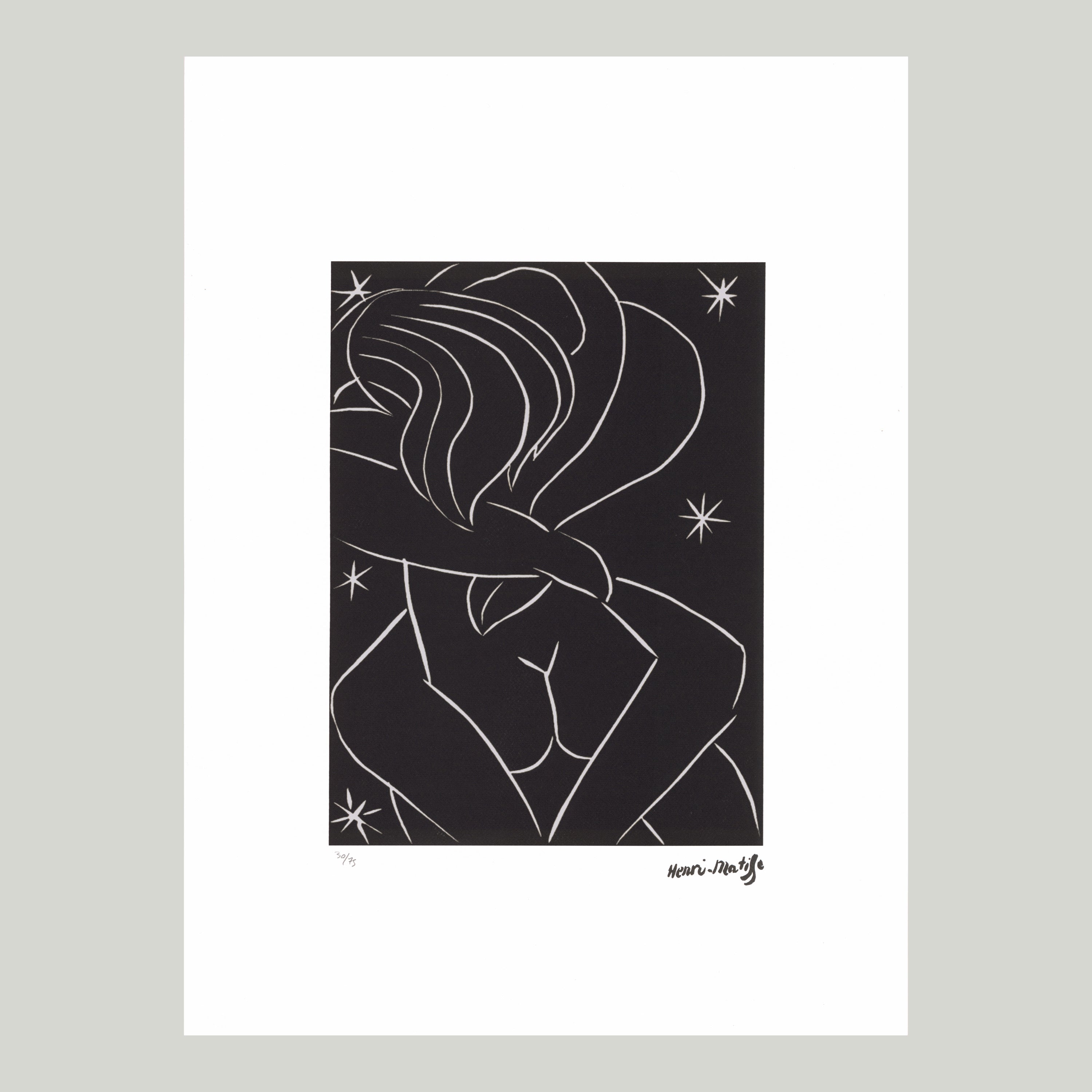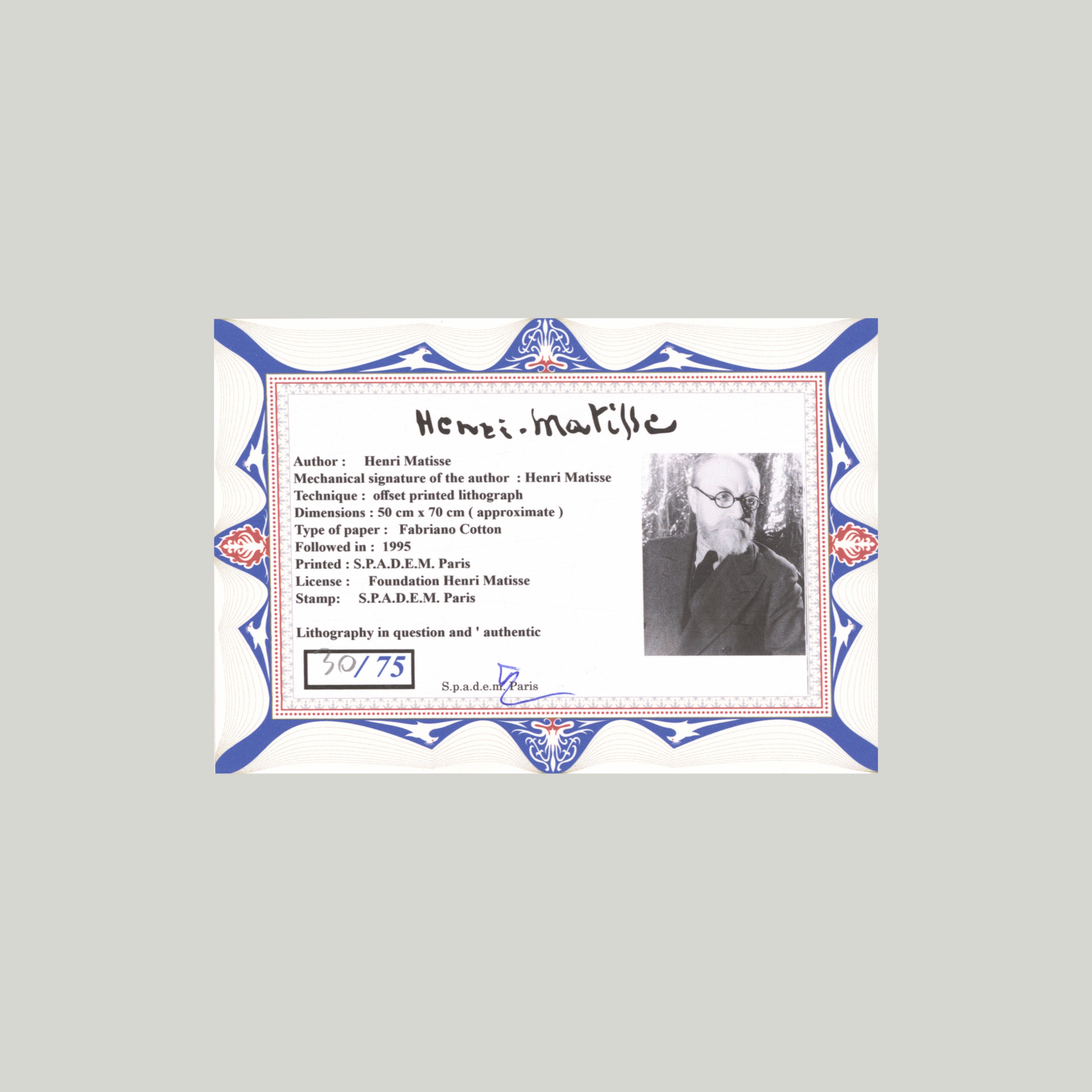 Certifikovaný grafický list, 50x70 cm. Číslováno 30/75. Certifikát, ruční papír Fabriano Cotton. Signováno vpravo dole Henri Matisse. Slepotisk S.P.A.D.E.M. Paris. Číslováno tužkou