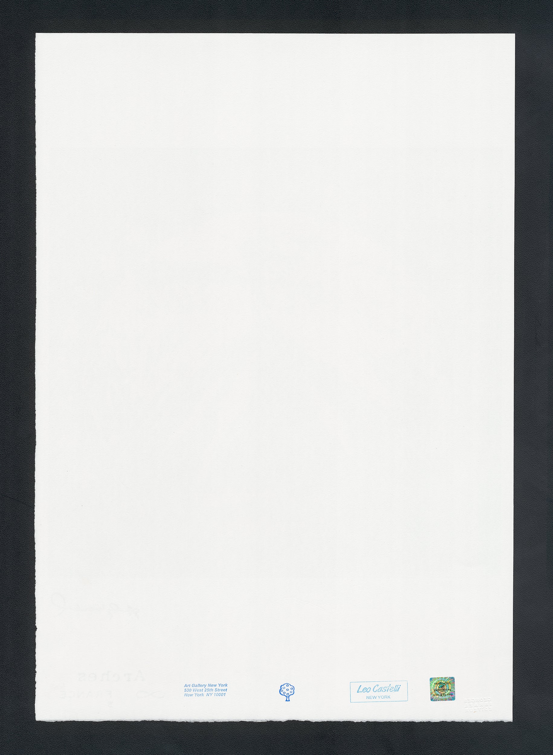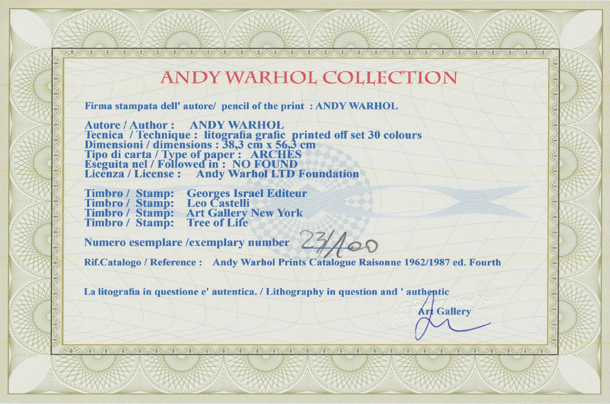 Certifikovaný grafický list, 38 x 56 cm. Certifikát, slepotisk © ANDY WARHOL, ruční papír Fabriano Privilege. Signováno vpravo dole Andy Warhol. Na zadní straně razítka: ANDY WARHOL Factory.