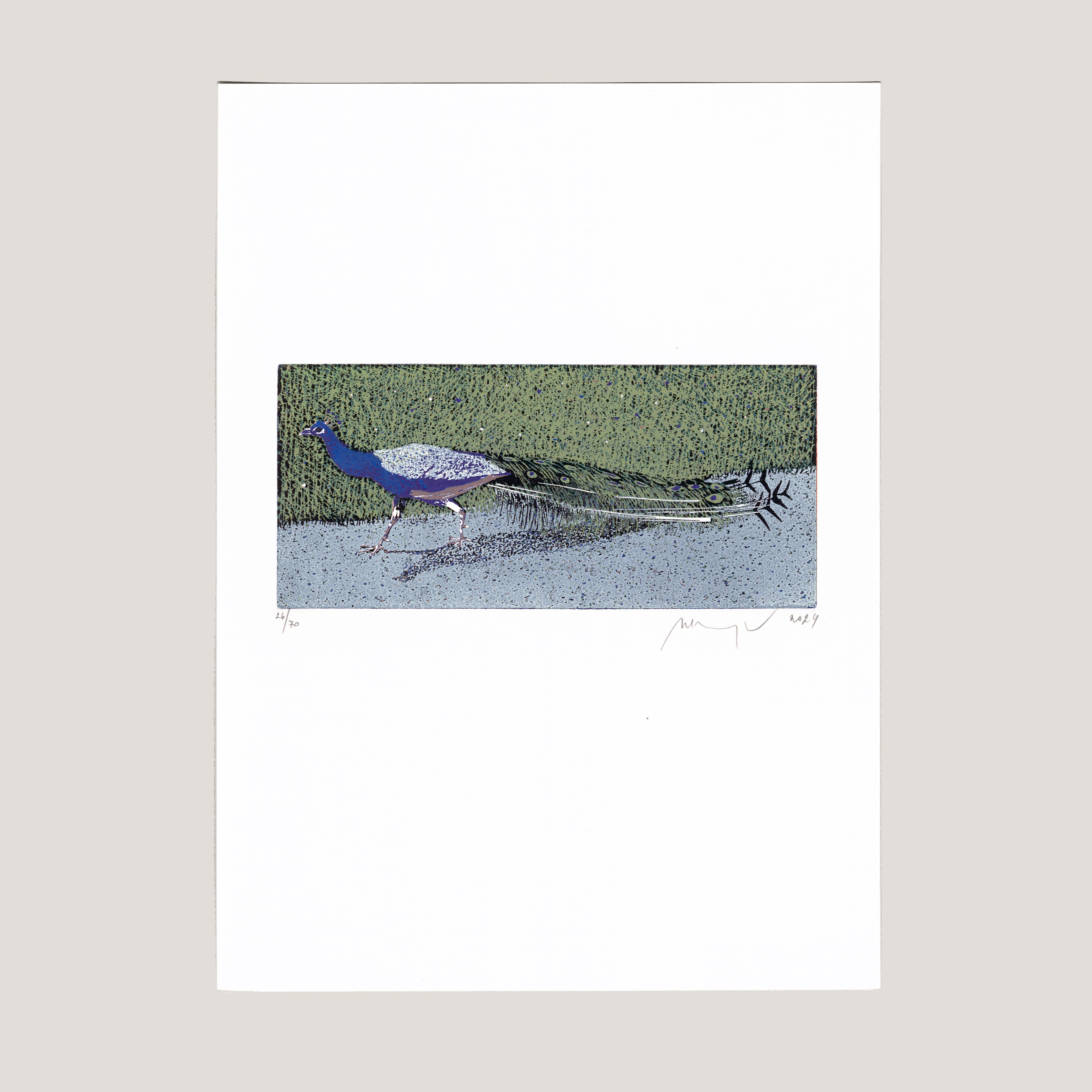 Barevný linoryt 17x8 cm tisková plocha, 21x29,6 cm grafický list číslováno 26/70, signováno M. Manojlín 2024