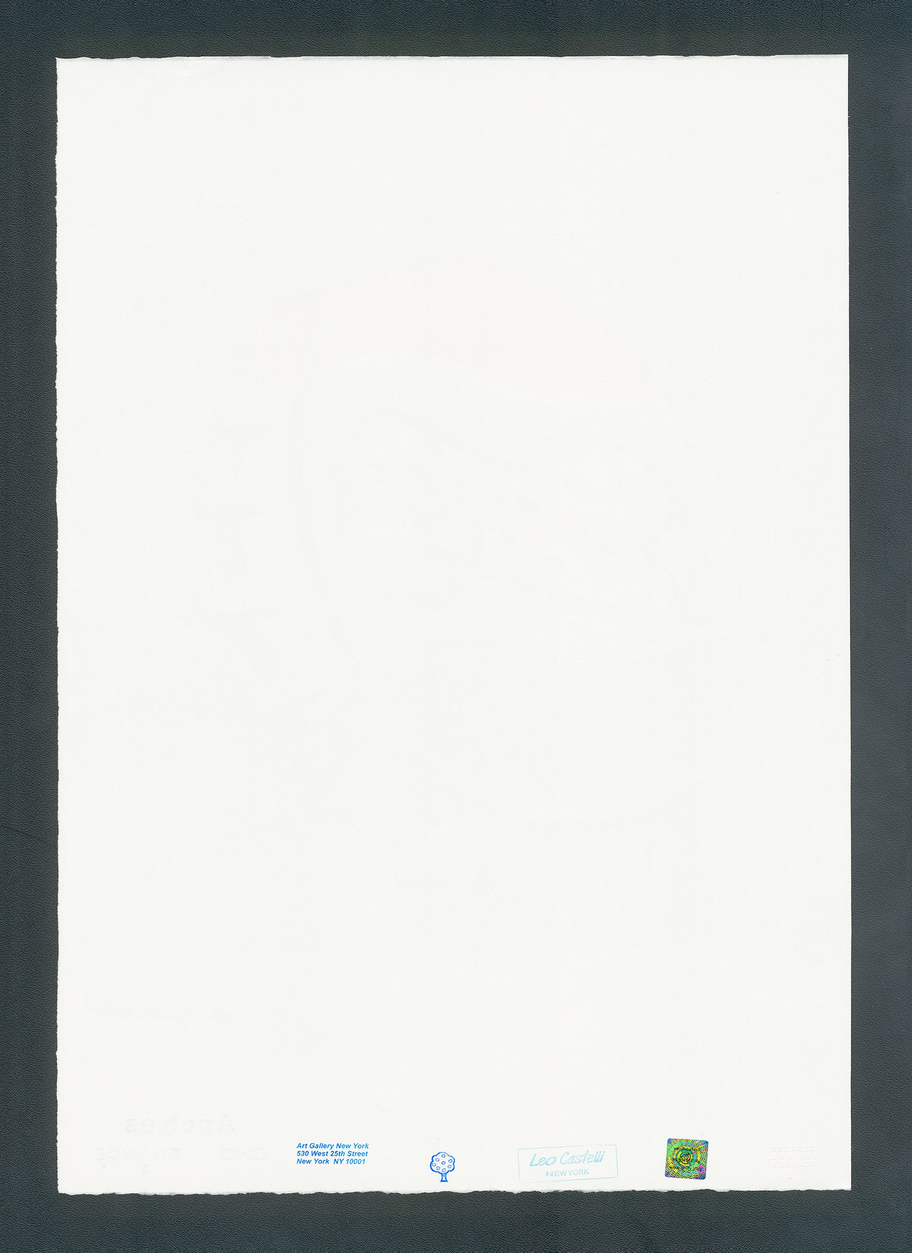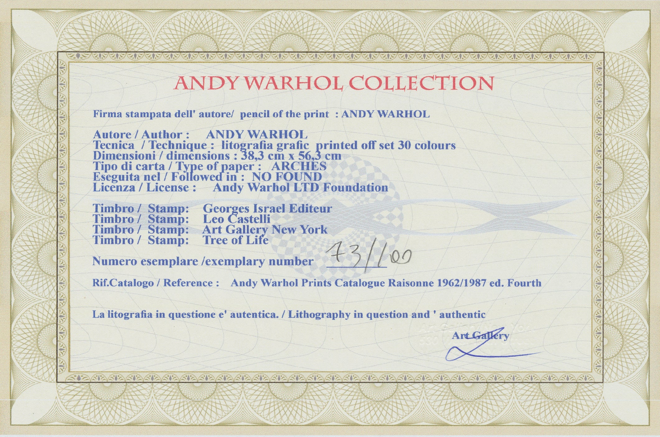 Certifikovaný grafický list, 38 x 56 cm. Certifikát, slepotisk © ANDY WARHOL, ruční papír Fabriano Privilege. Signováno vpravo dole Andy Warhol. Na zadní straně razítka: ANDY WARHOL Factory.