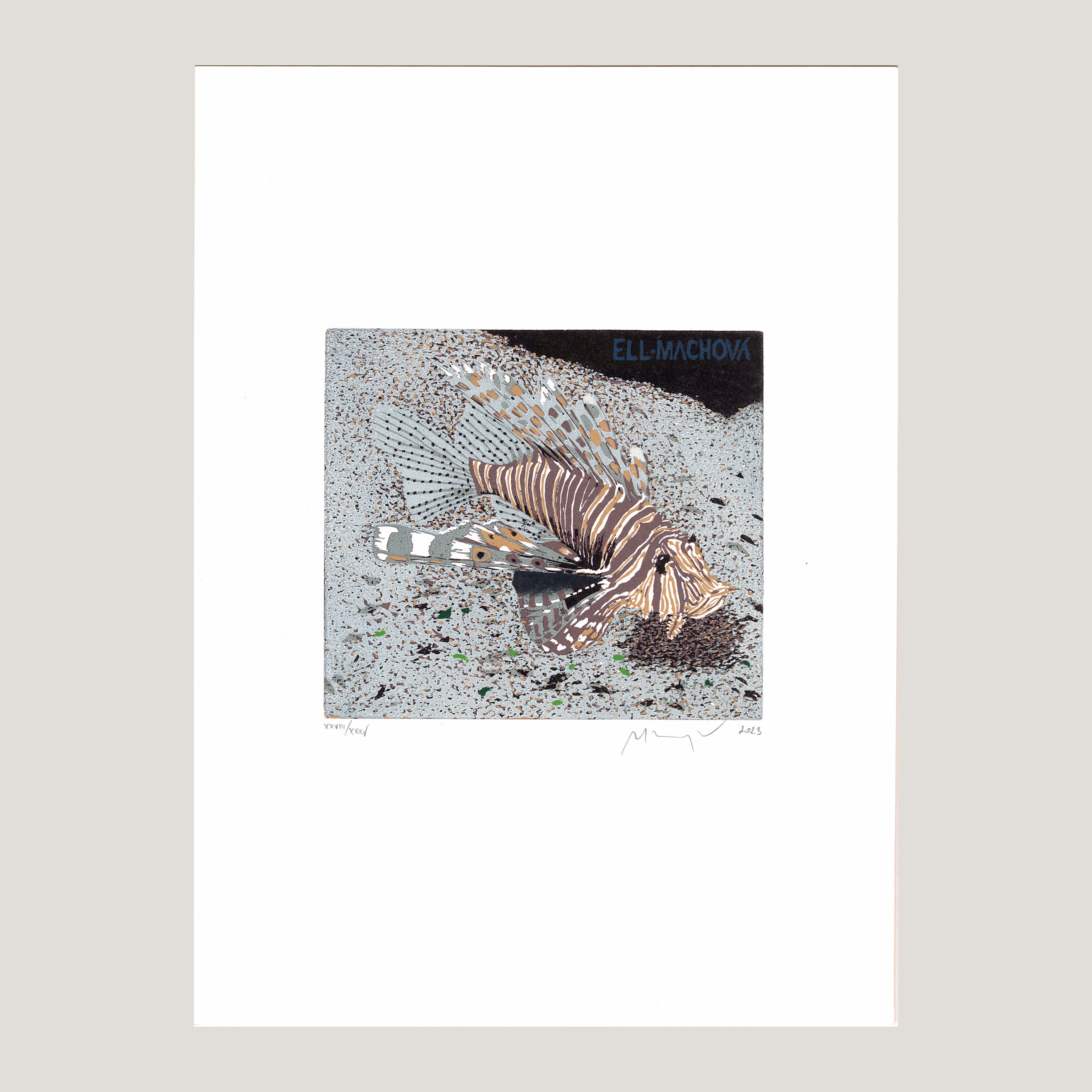 Barevný linoryt tisková plocha 13x12 cm, grafický list 21x29,6 cm číslováno XXVIII/XXXV, signováno M. Manojlín 2023