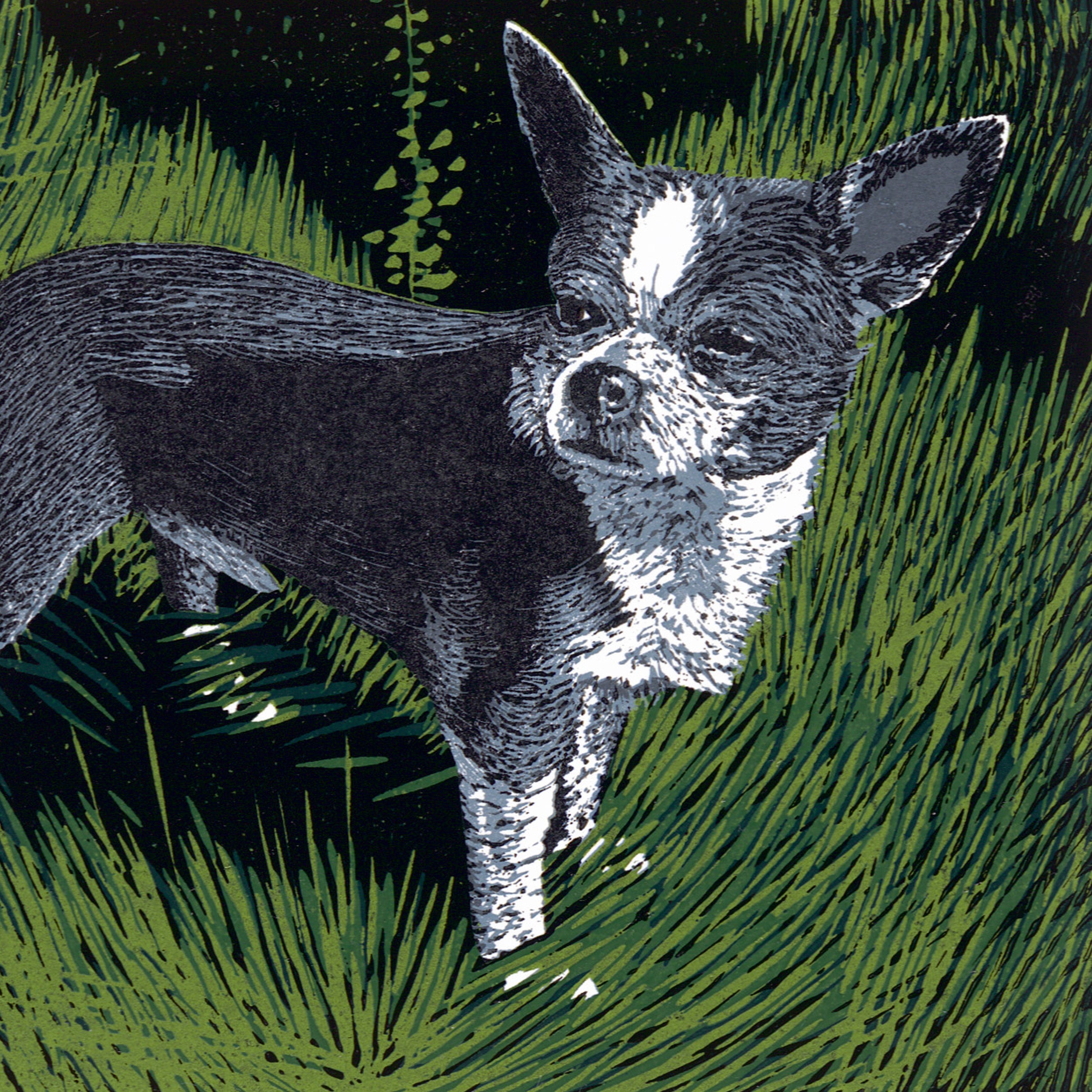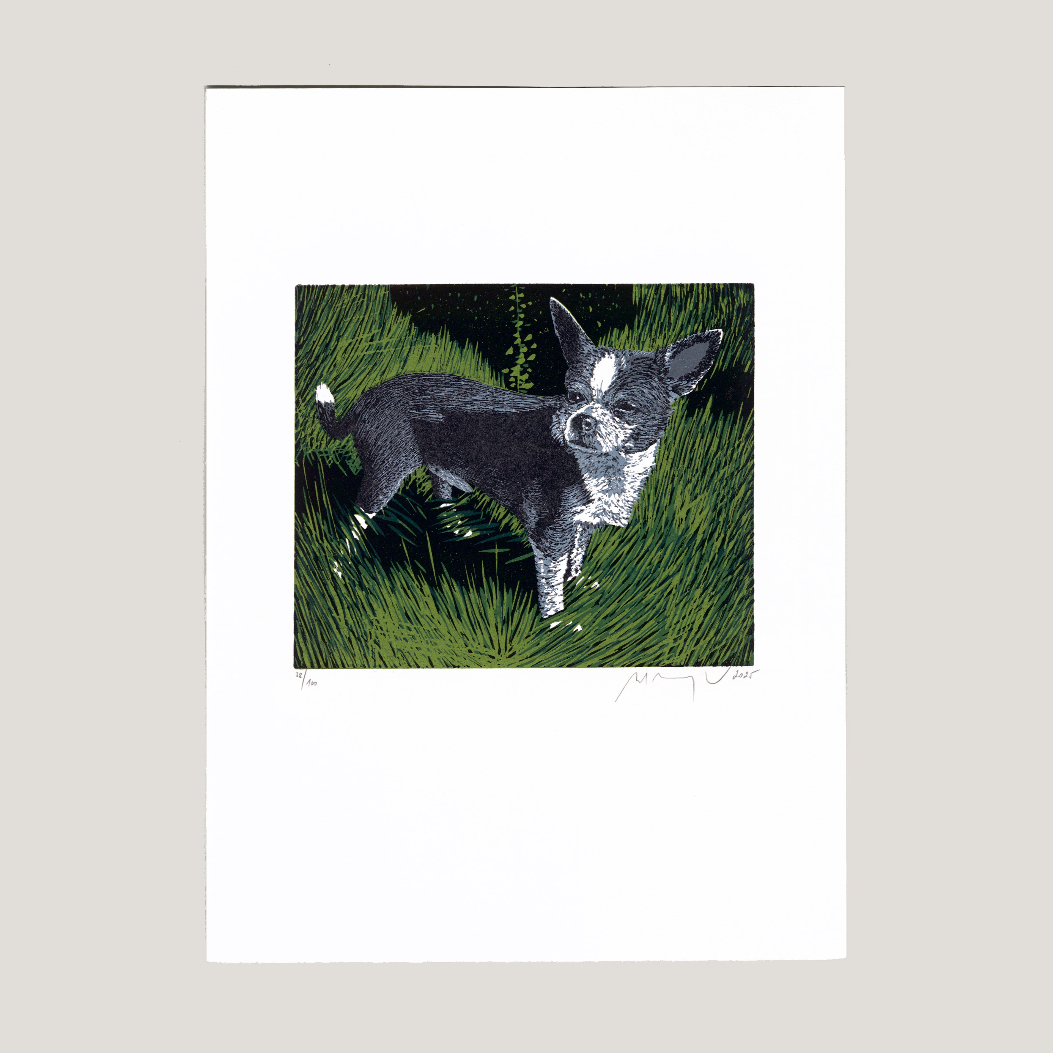 Barevný linoryt 15x13 cm tisková plocha, 21x29,6 cm grafický list číslováno 38/100, signováno M. Manojlín 2025