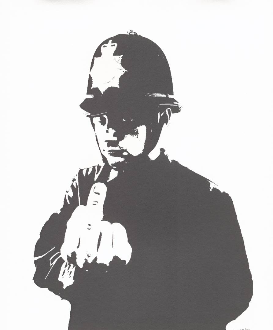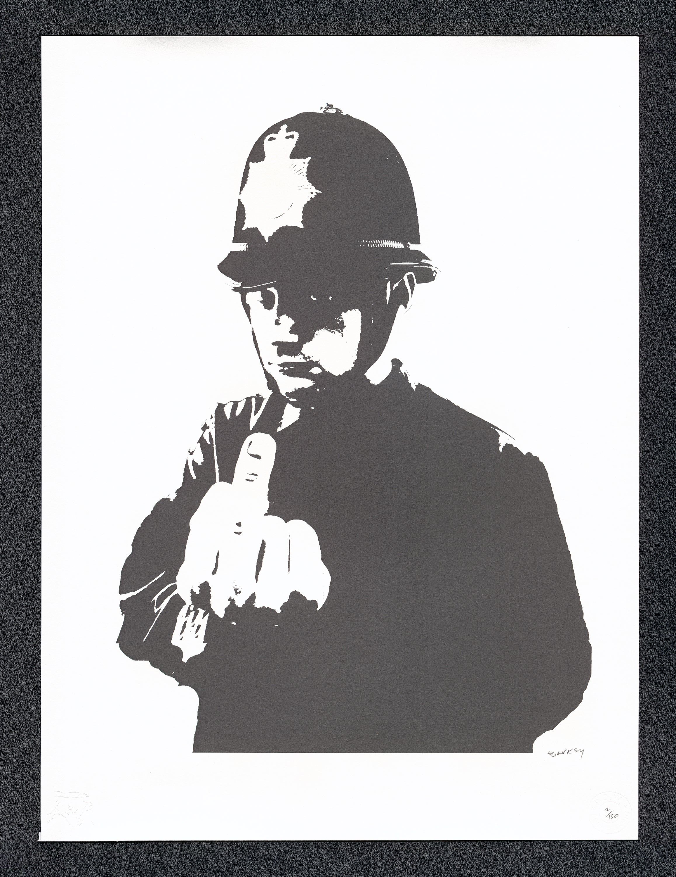 Grafický list, 50 x 70 cm. Číslováno, slepotisk P.O.W.-BANKSY, ruční papír Fabriano Cotton Privilege. Signováno vpravo dole BANKSY.