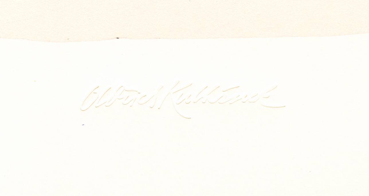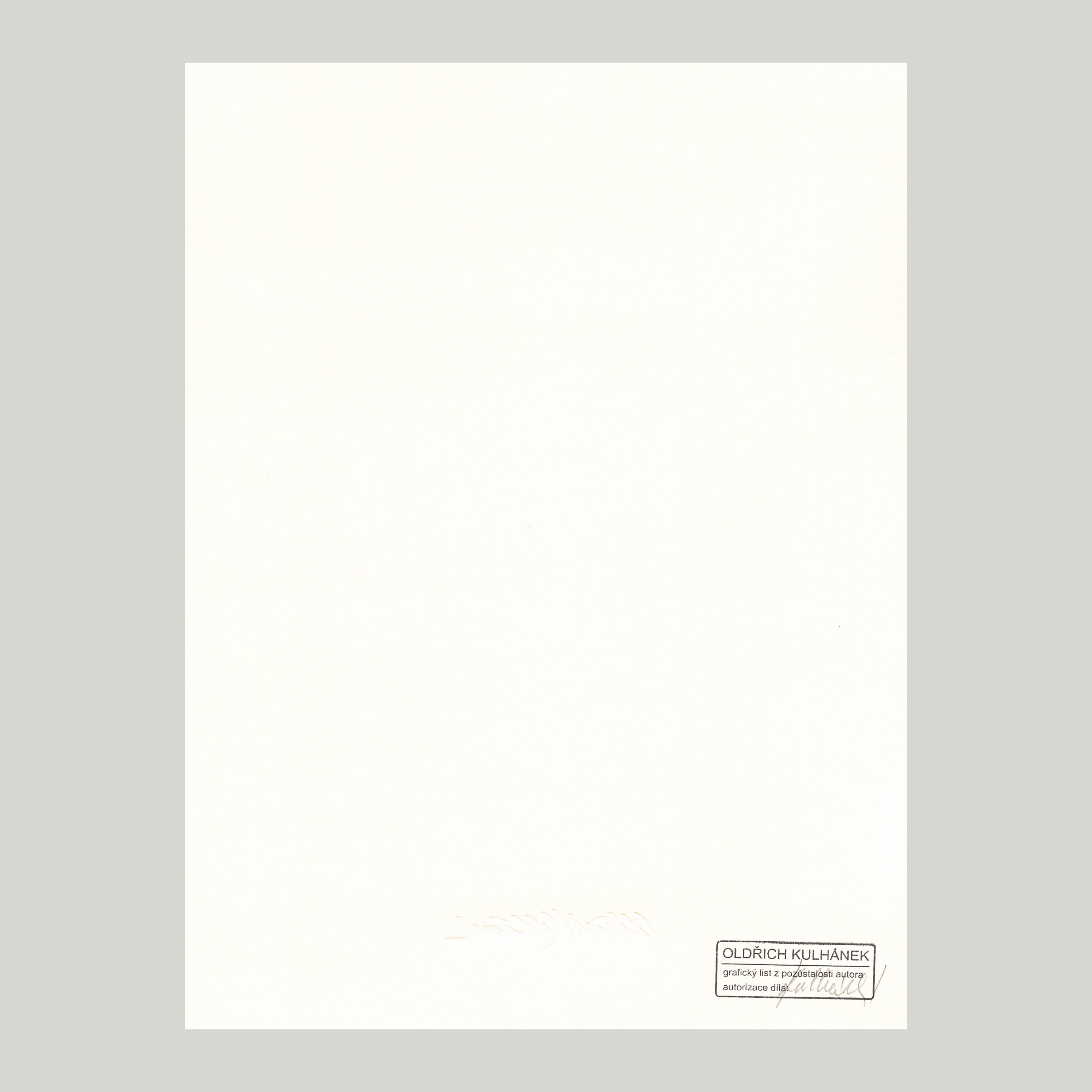 ,,Znovuobjevená" a nikdy nevydaná litografie Oldřicha Kulhánka, kterou vytvořil za svého života na litografický kámen v ateliéru tiskaře Petra Korbeláře. Se souhlasem rodiny autora bylo zhotoveno a autorizováno 140 sběratelských kusů tohoto díla, které lze zakoupit pouze v České Galerii Moderního Umění.