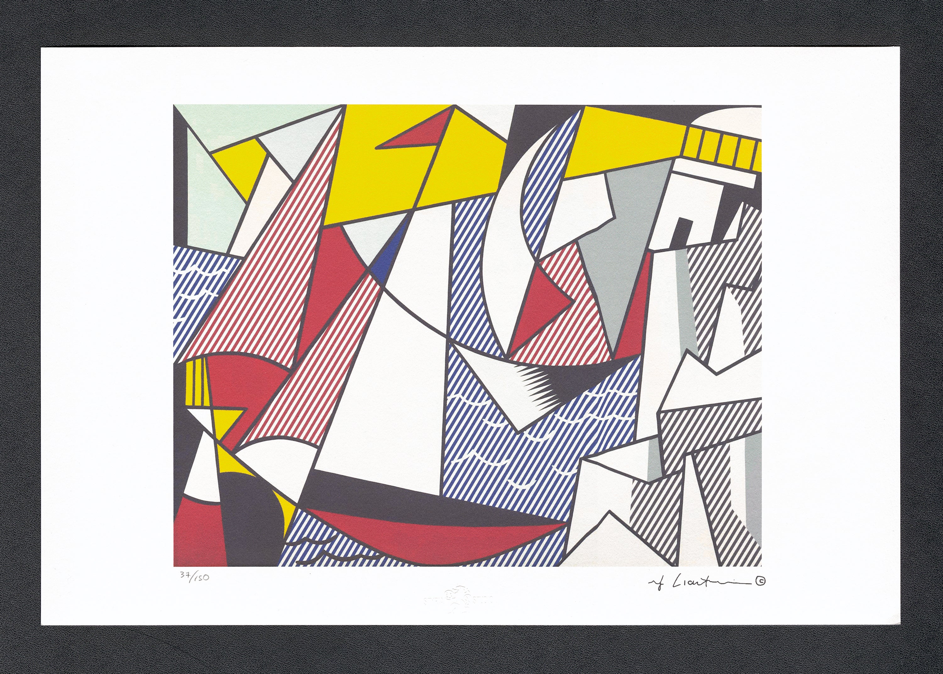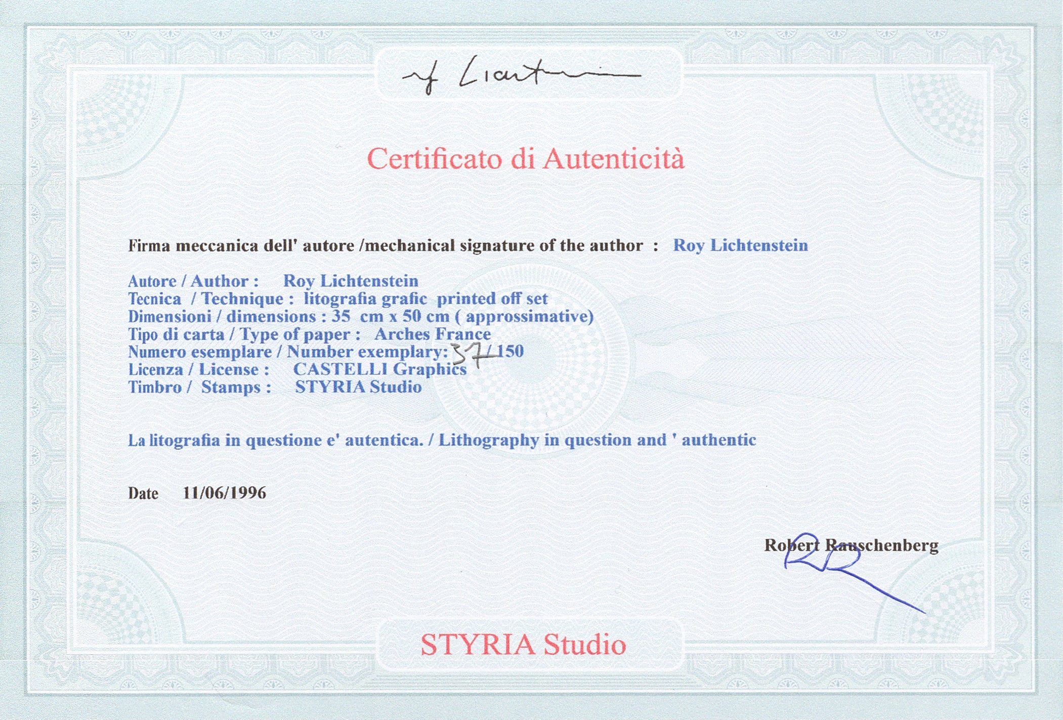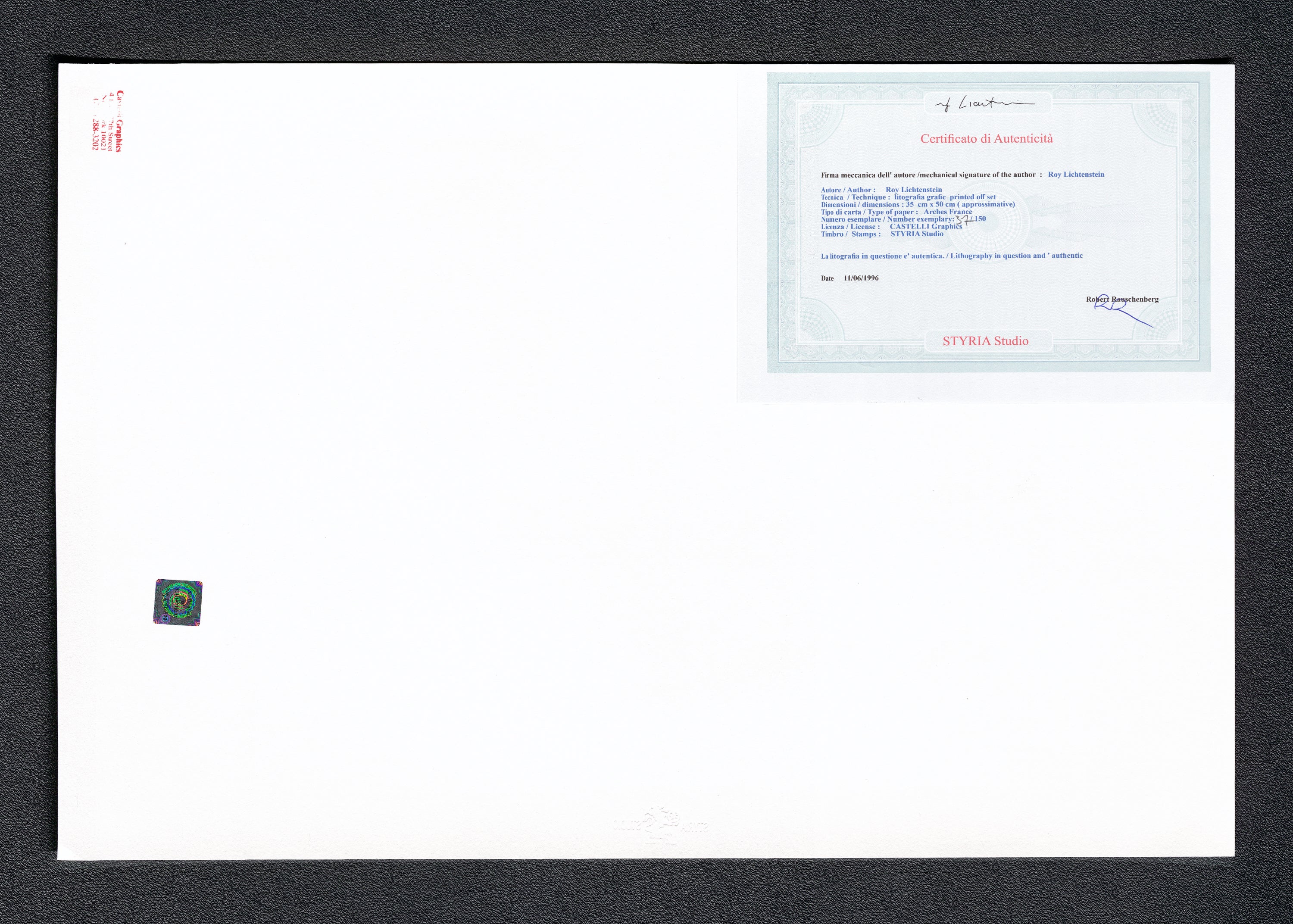 Certifikovaný grafický list, 35 x 50 cm. Certifikát, slepotisk STYRIA Studio, ruční papír Arches France. Signováno vpravo dole Roy Lichtenstein ©. Na zadní straně razítko: CASTELLI Graphics.