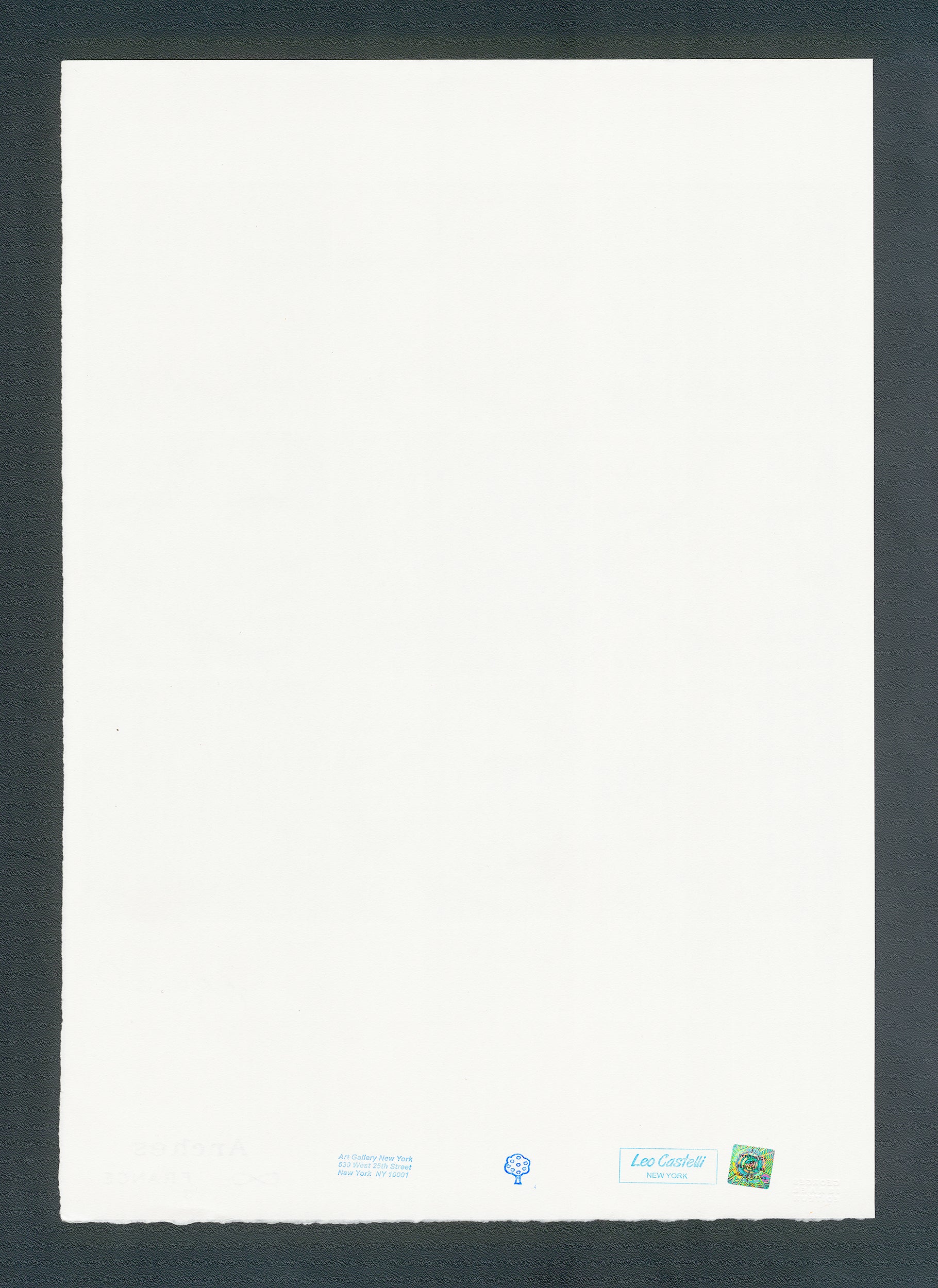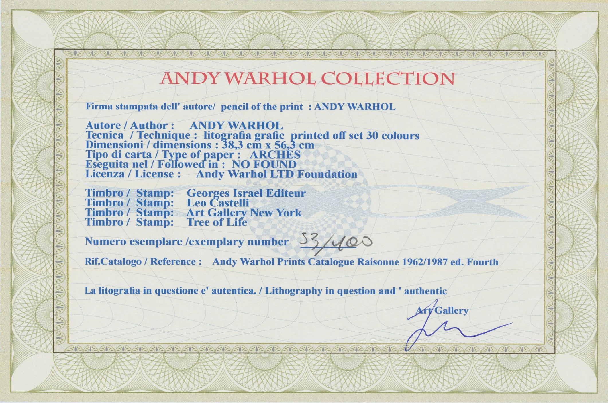 Certifikovaný grafický list, 38 x 56 cm, 53/100. Certifikát, slepotisk © ANDY WARHOL, ruční papír Fabriano Privilege. Signováno vpravo dole Andy Warhol. Na zadní straně razítka: ANDY WARHOL Factory.