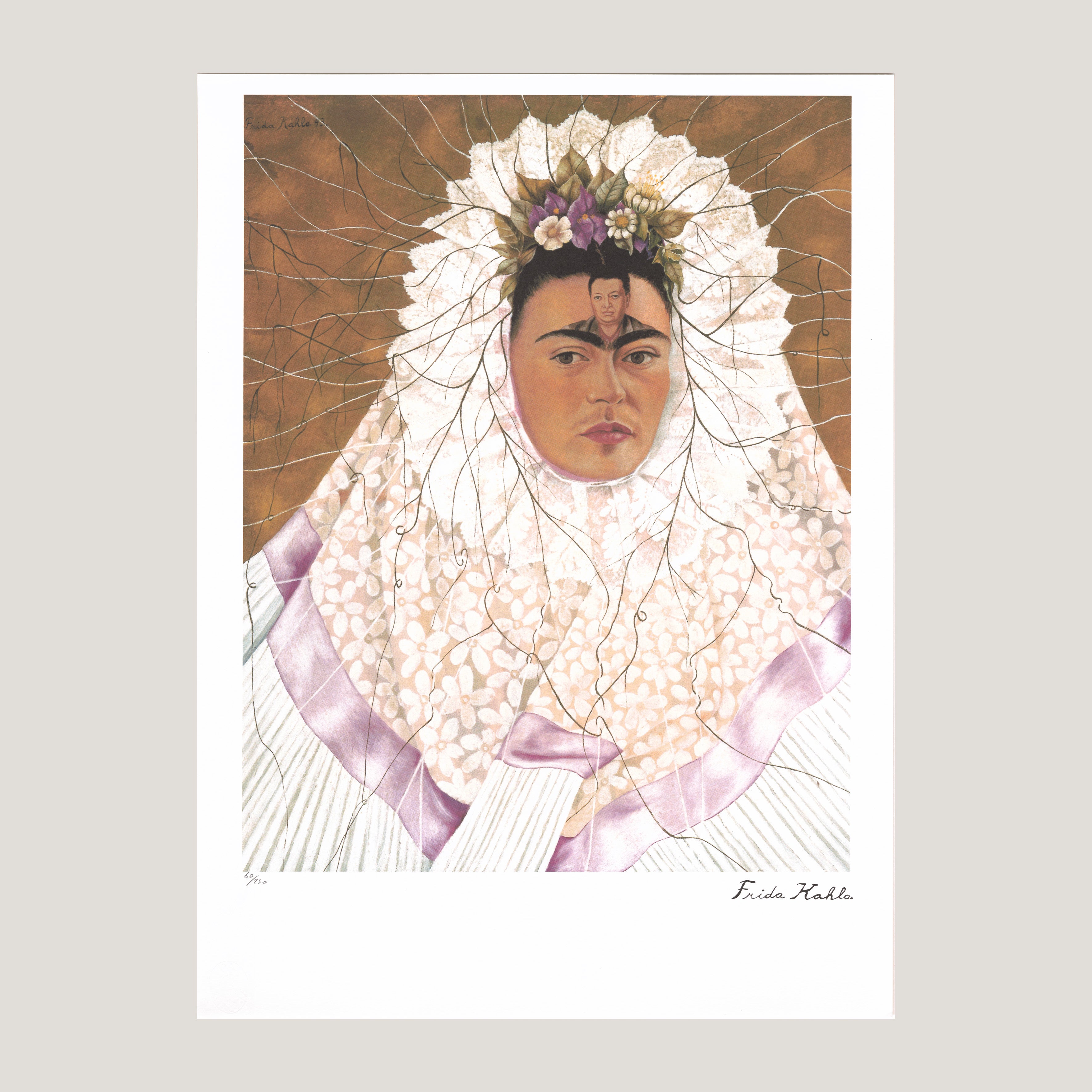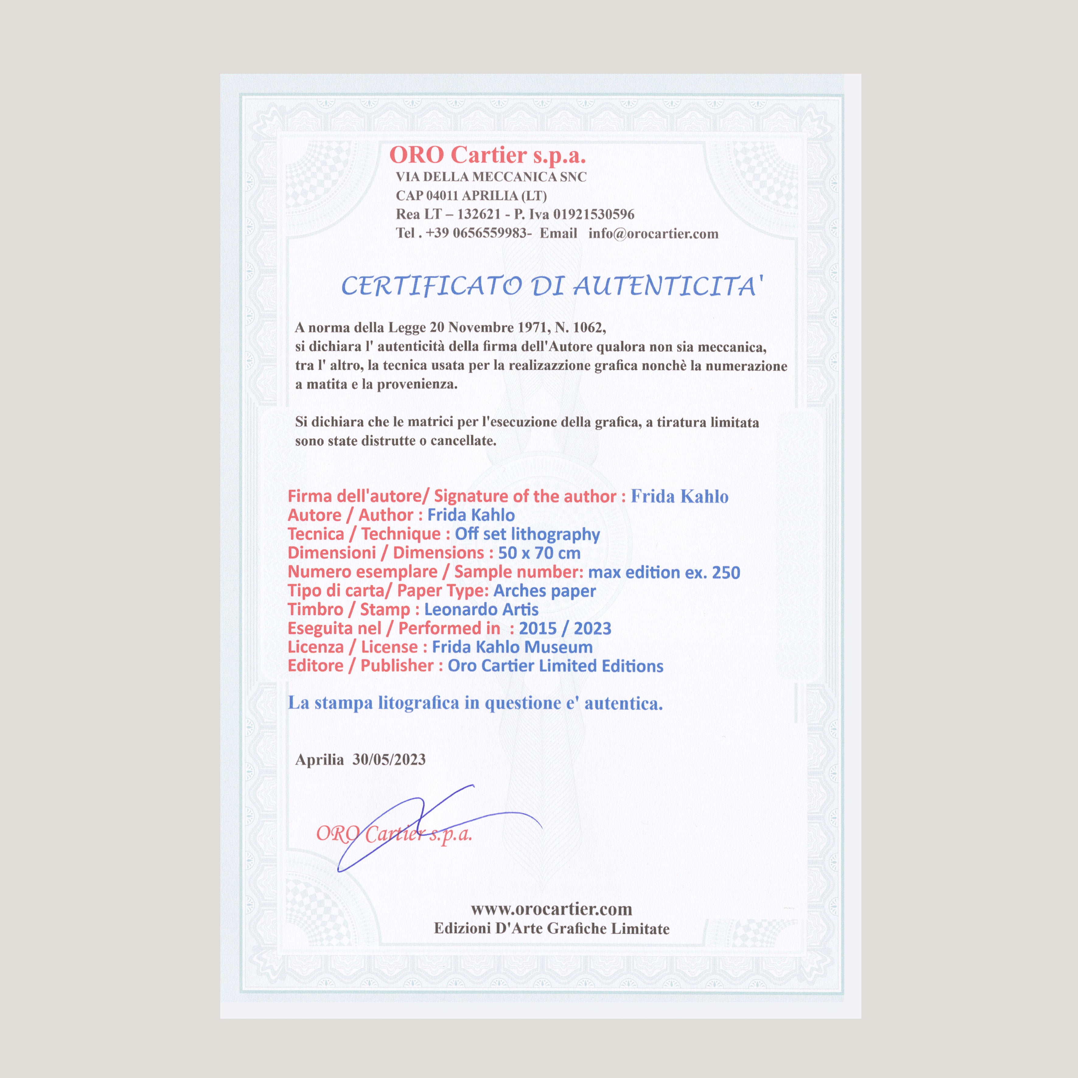 Grafický list 50x70 cm v limitovaném nákladu. Tisk č. 60/250. Slepotiskové razítko Leonardo Artis. Volný list. Certifikát, ruční papír Arches. Licence: Frida Kahlo Museum. Editor: Oro Cartier Limited Editions