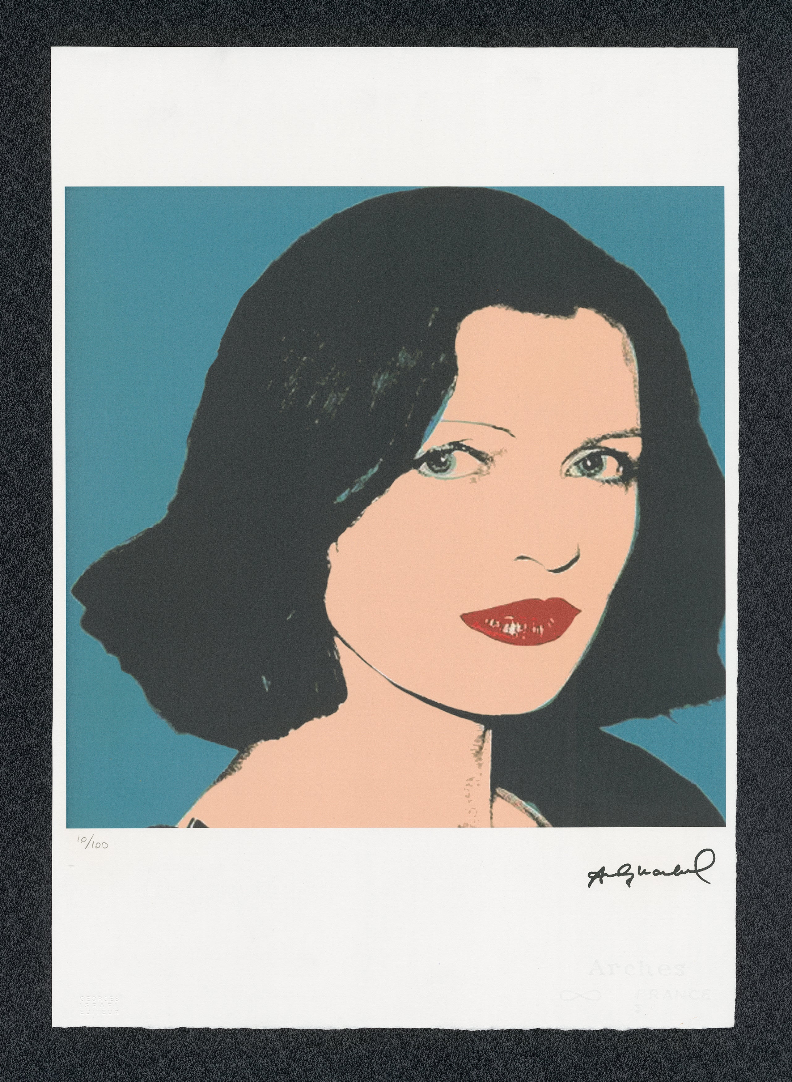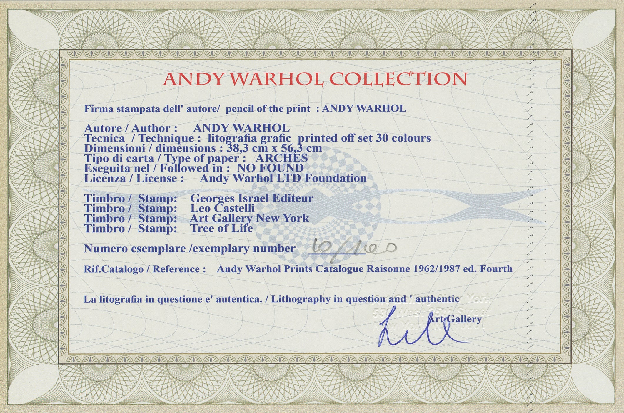 Certifikovaný grafický list, 38 x 56 cm, 10/100. Certifikát, slepotisk © ANDY WARHOL, ruční papír Fabriano Privilege. Signováno vpravo dole Andy Warhol. Na zadní straně razítka: ANDY WARHOL Factory.