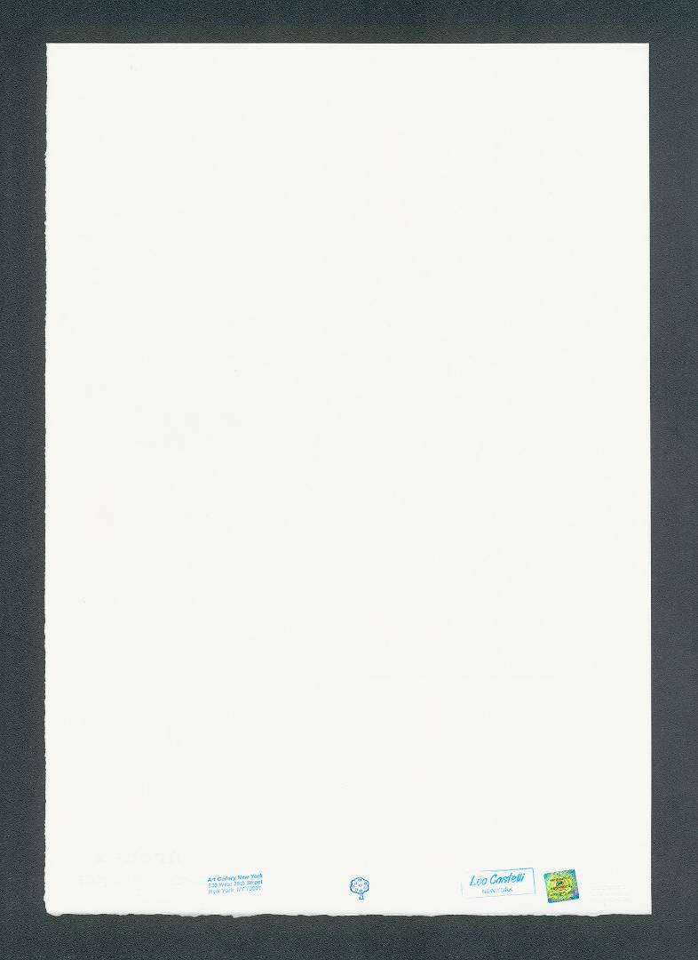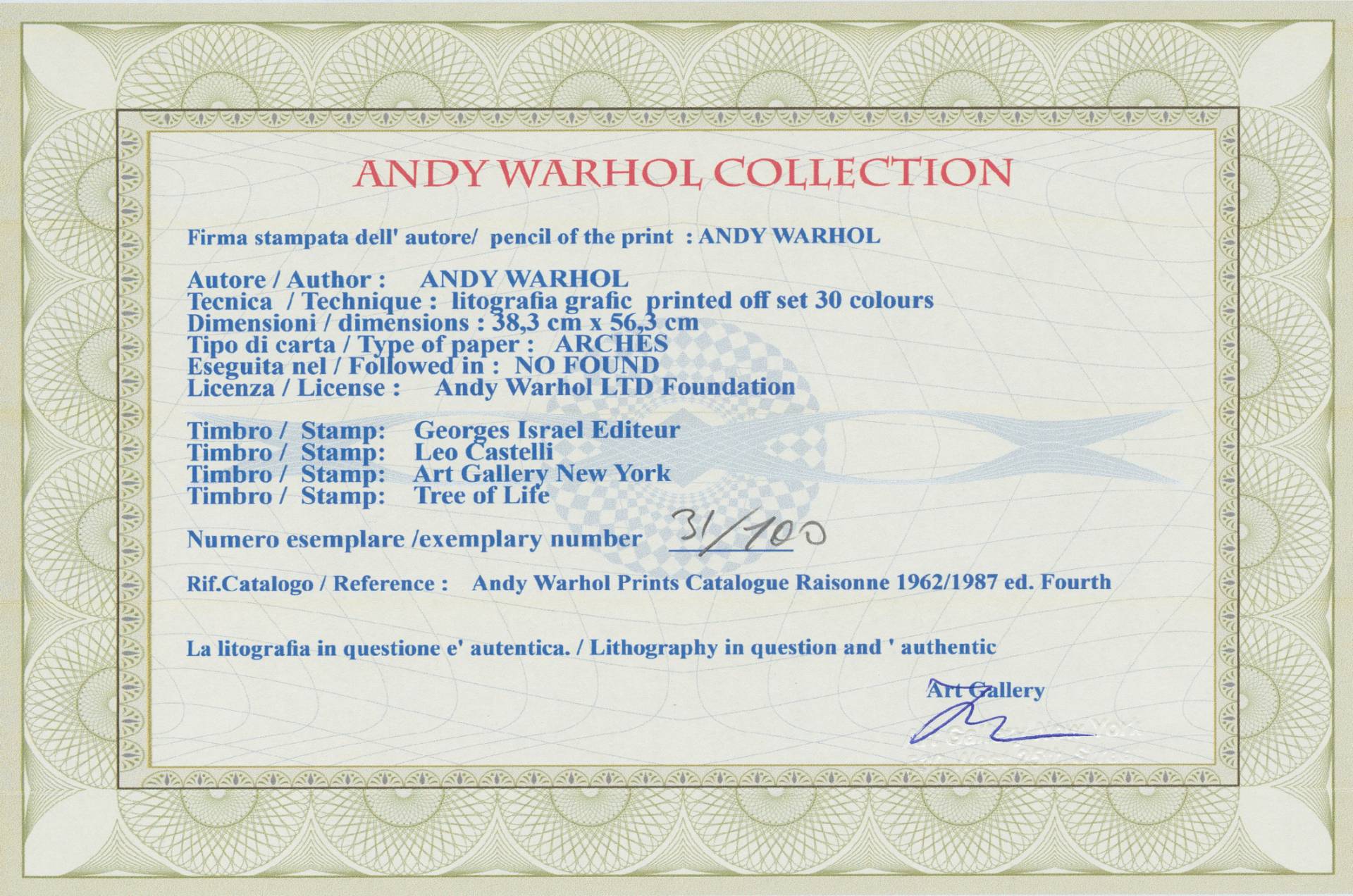 Certifikovaný grafický list, 38 x 56 cm, 31/100. Certifikát, slepotisk © ANDY WARHOL, ruční papír Fabriano Privilege. Signováno vpravo dole Andy Warhol. Na zadní straně razítka: ANDY WARHOL Factory.