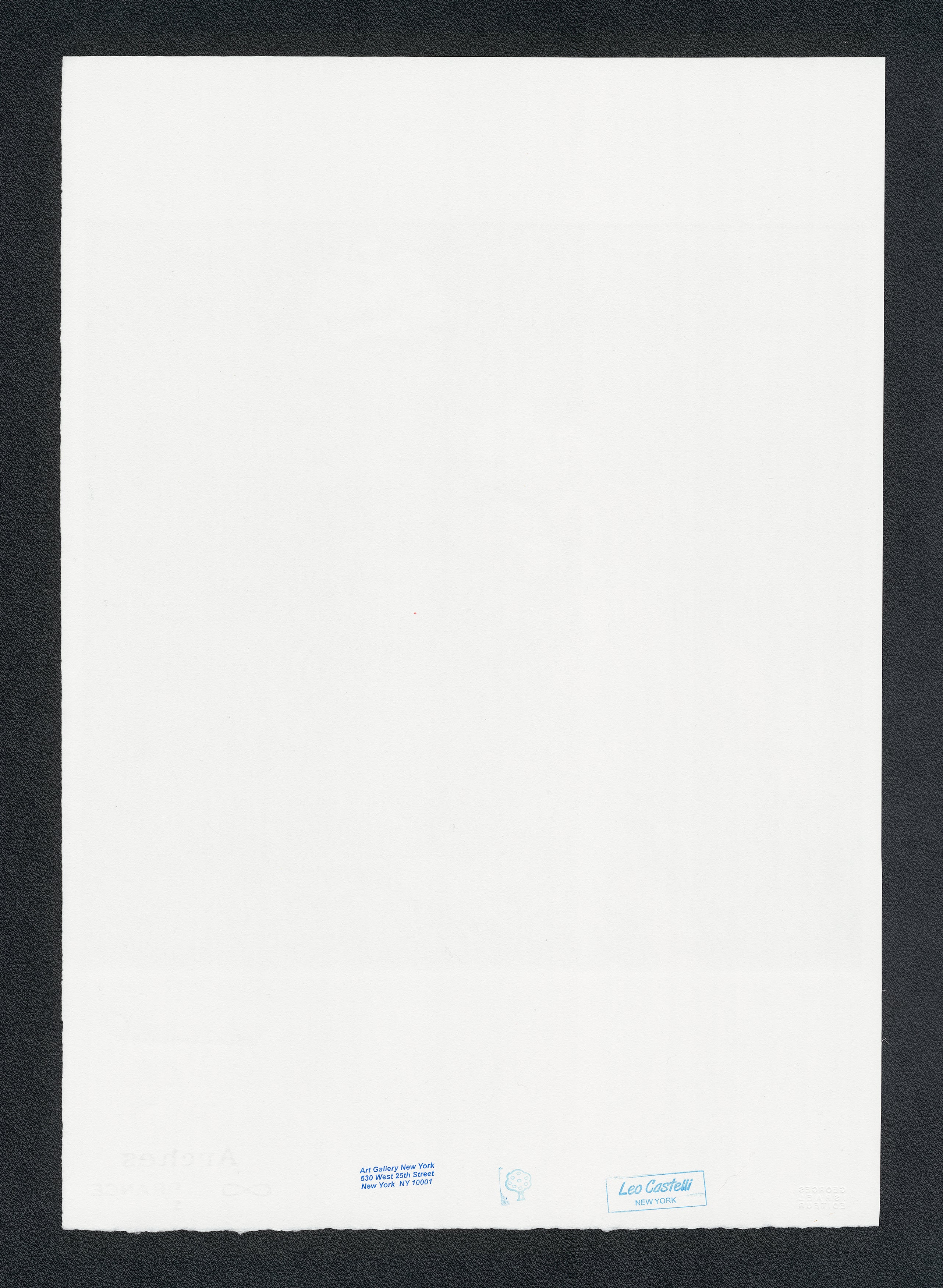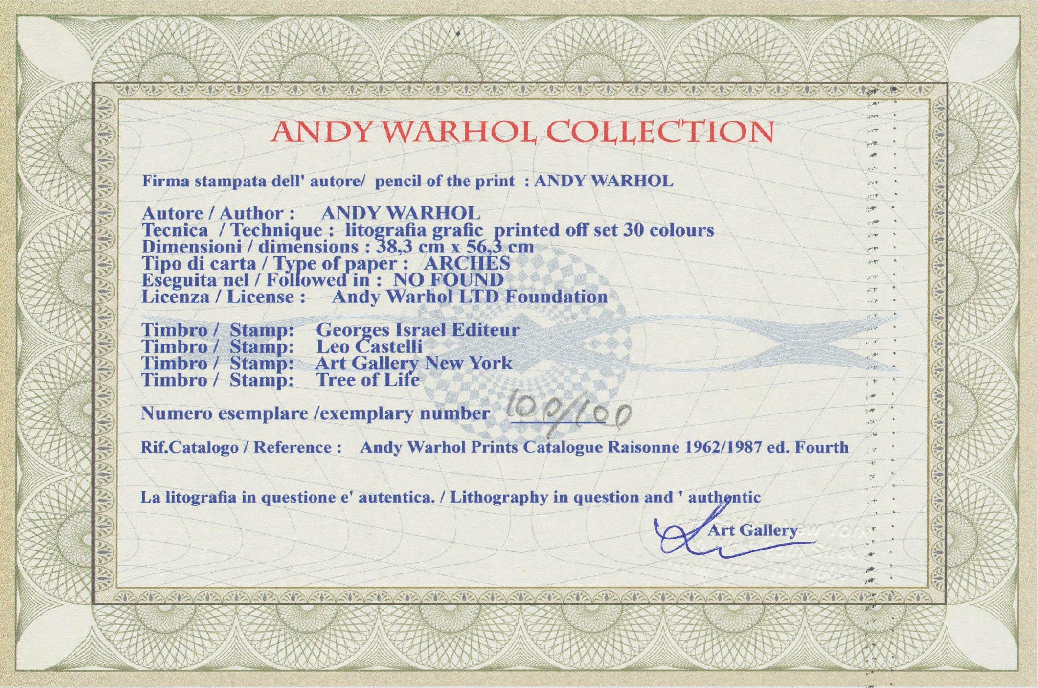 Certifikovaný grafický list, 38 x 56 cm, 100/100. Certifikát, slepotisk © ANDY WARHOL, ruční papír Fabriano Privilege. Signováno vpravo dole Andy Warhol. Na zadní straně razítka: ANDY WARHOL Factory.