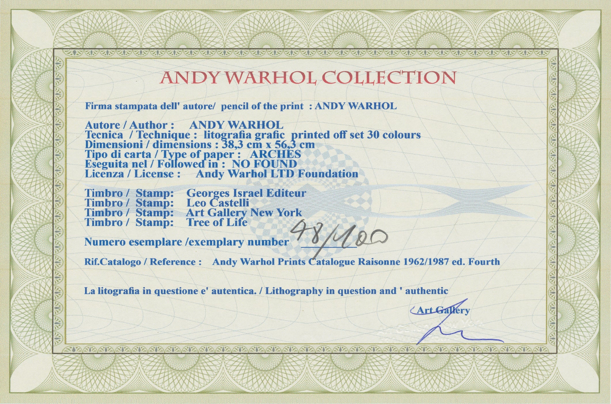 Certifikovaný grafický list, 38 x 56 cm, 48/100. Certifikát, slepotisk © ANDY WARHOL, ruční papír Fabriano Privilege. Signováno vpravo dole Andy Warhol. Na zadní straně razítka: ANDY WARHOL Factory.