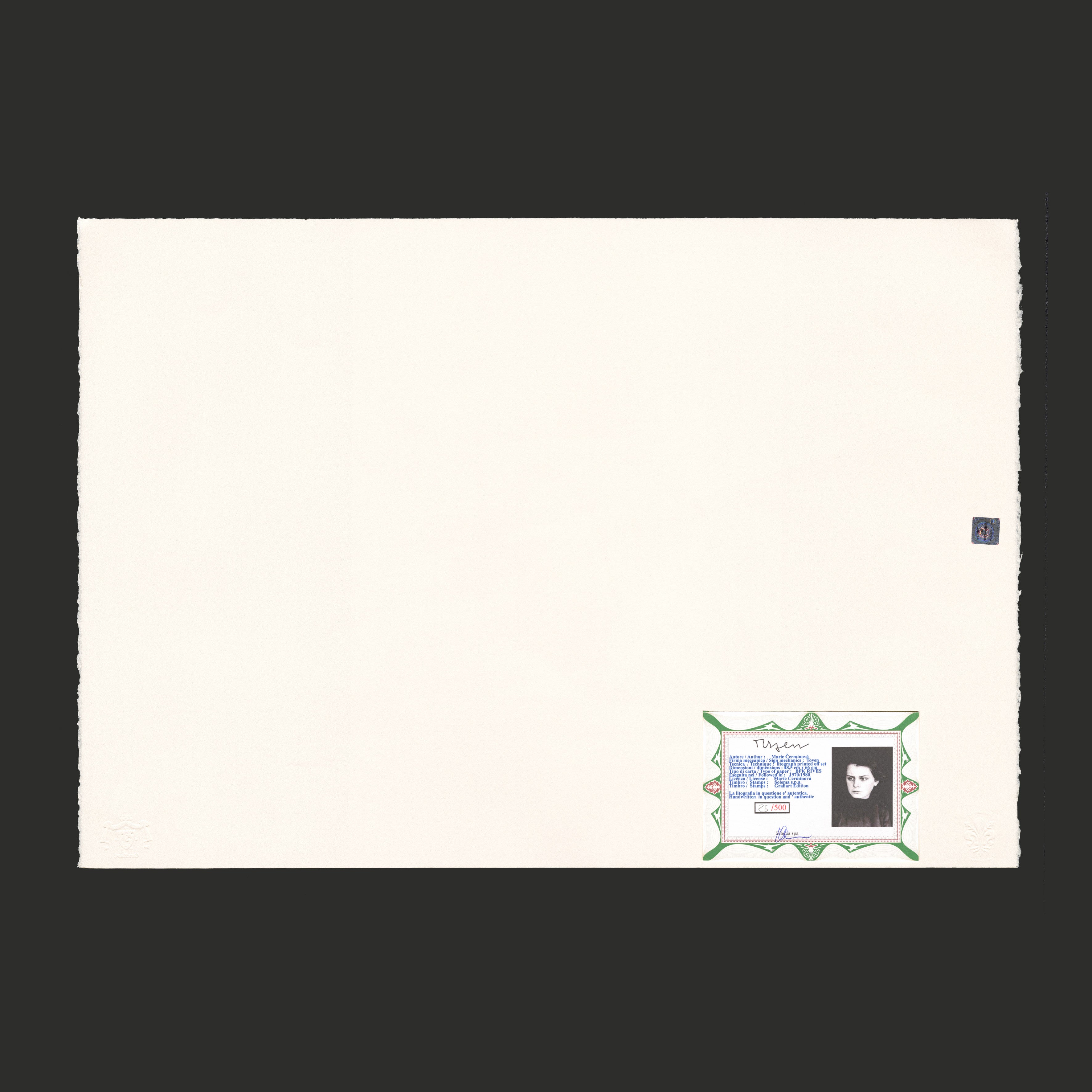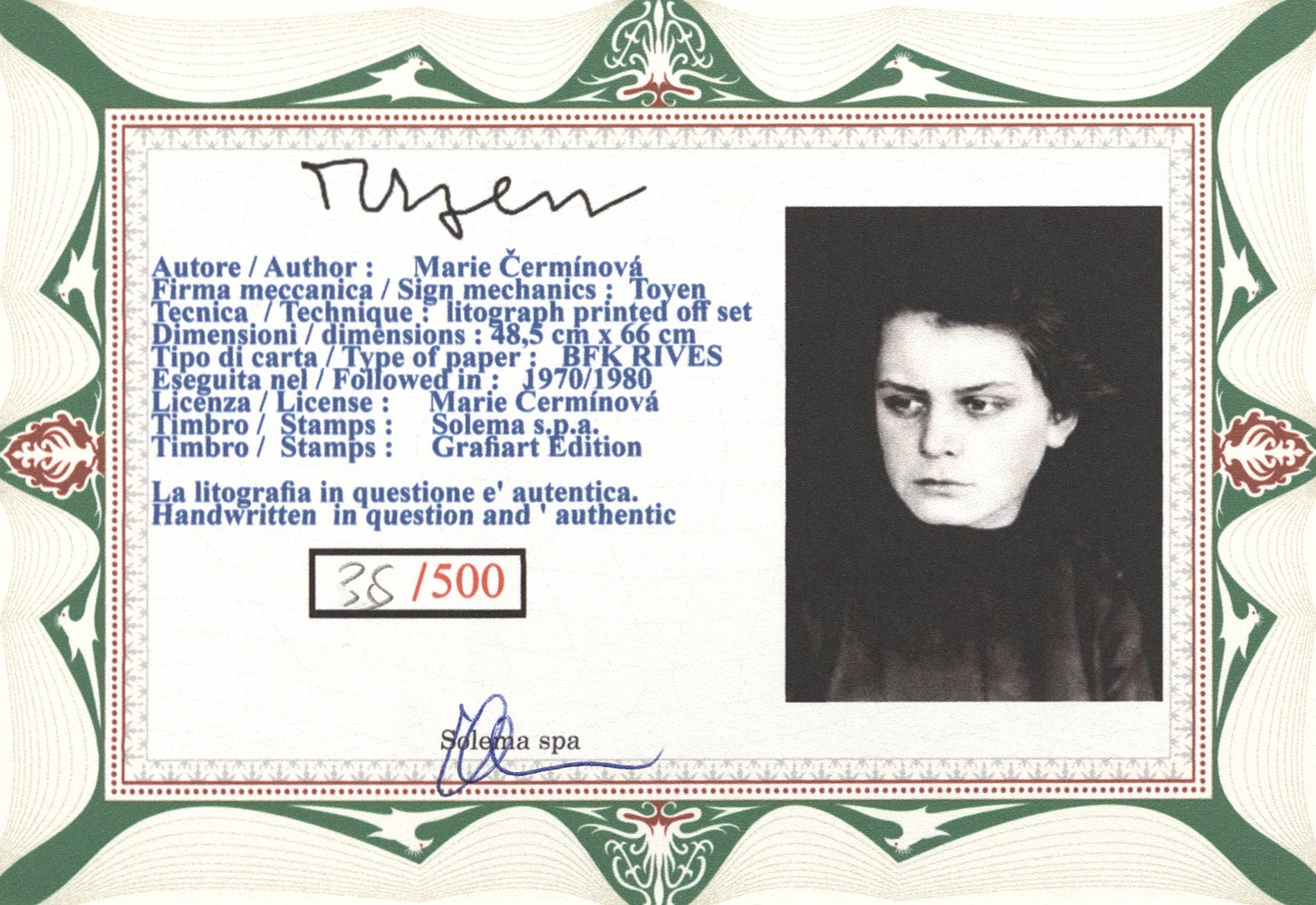 Certifikovaný grafický list, 47,7 x 66,5 cm. Číslováno 36/500. Certifikát, ruční papír BFK RIVES. Signováno vpravo dole Toyen. Slepotiskové razítko: Solema s.p.a., Grafiart Edition.