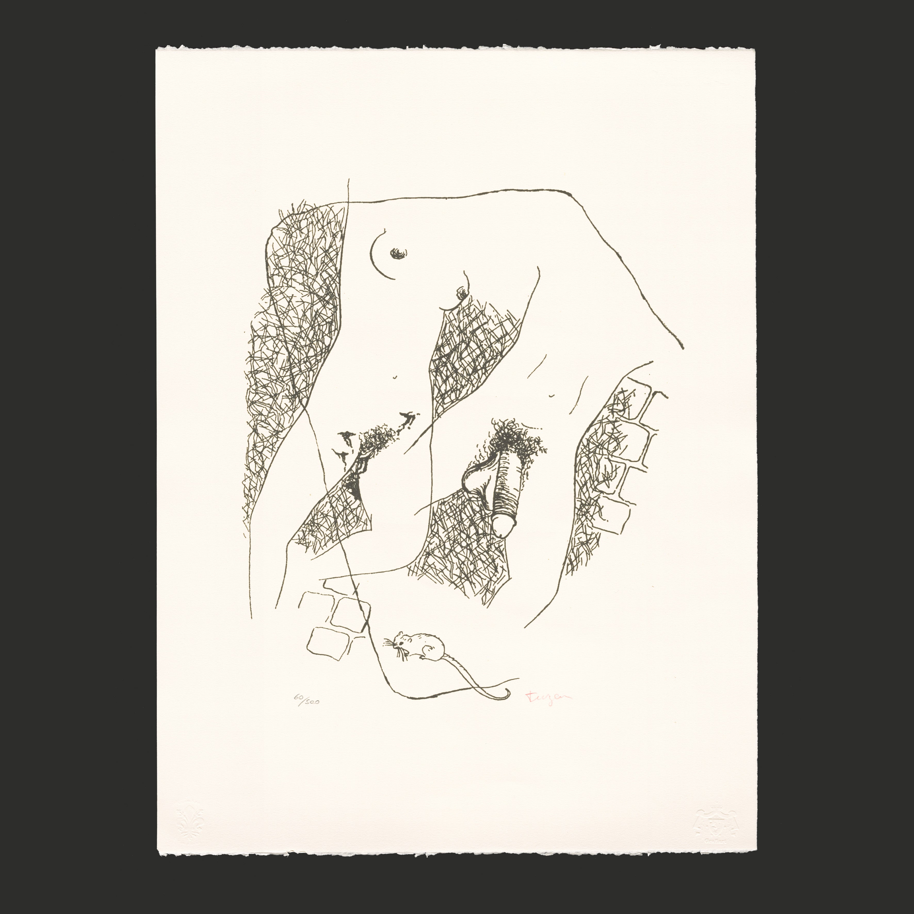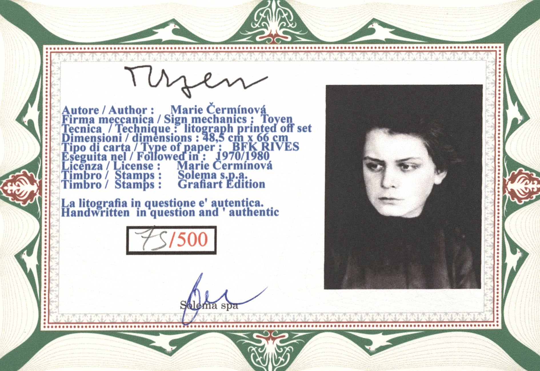 Certifikovaný grafický list, 47,7 x 66,5 cm. Číslováno 60/500. Certifikát, ruční papír BFK RIVES. Signováno vpravo dole Toyen. Slepotiskové razítko: Solema s.p.a., Grafiart Edition.