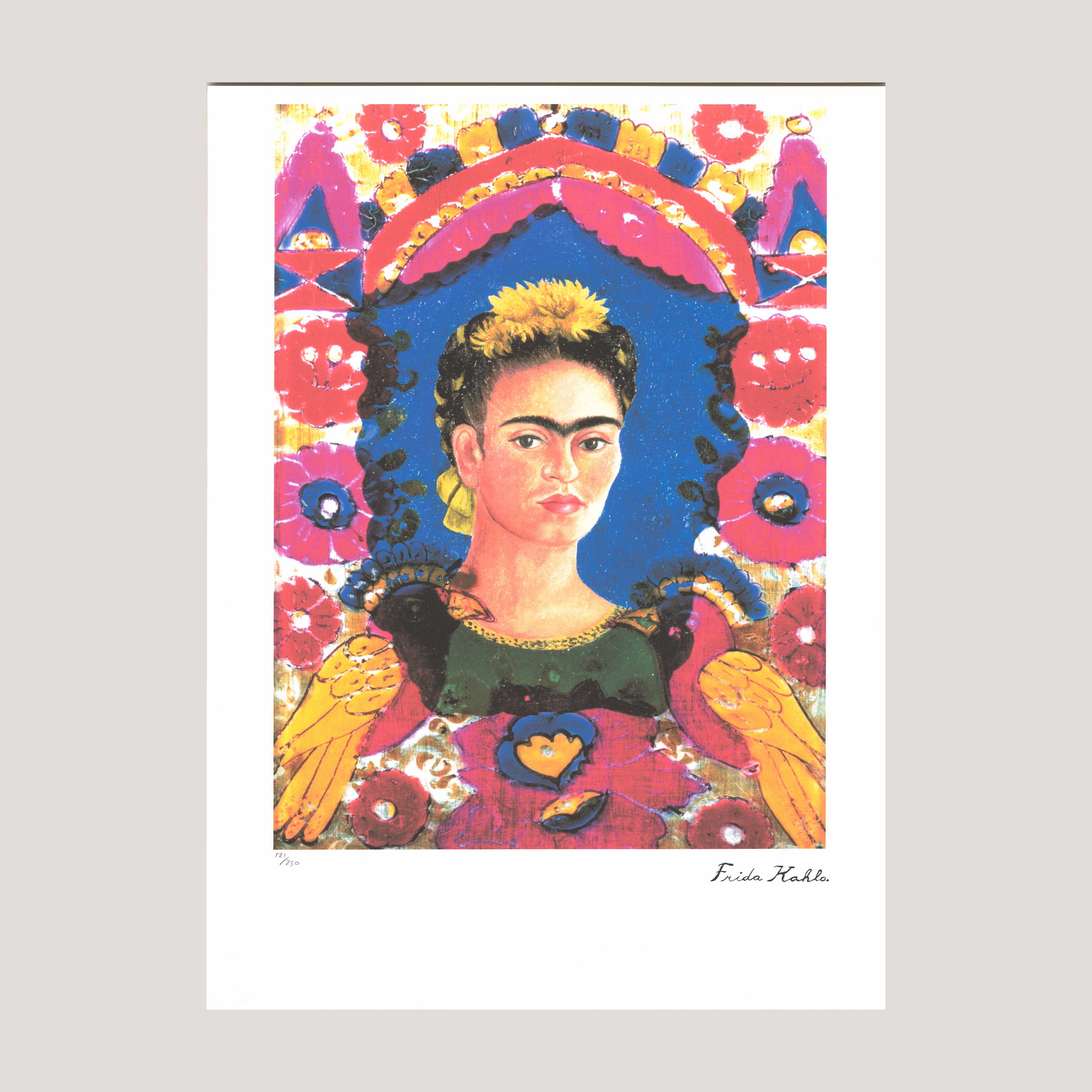 Grafický list 50x70 cm v limitovaném nákladu. Tisk č. 121/250. Slepotiskové razítko Leonardo Artis. Volný list. Certifikát, ruční papír Arches. Licence: Frida Kahlo Museum. Editor: Oro Cartier Limited Editions