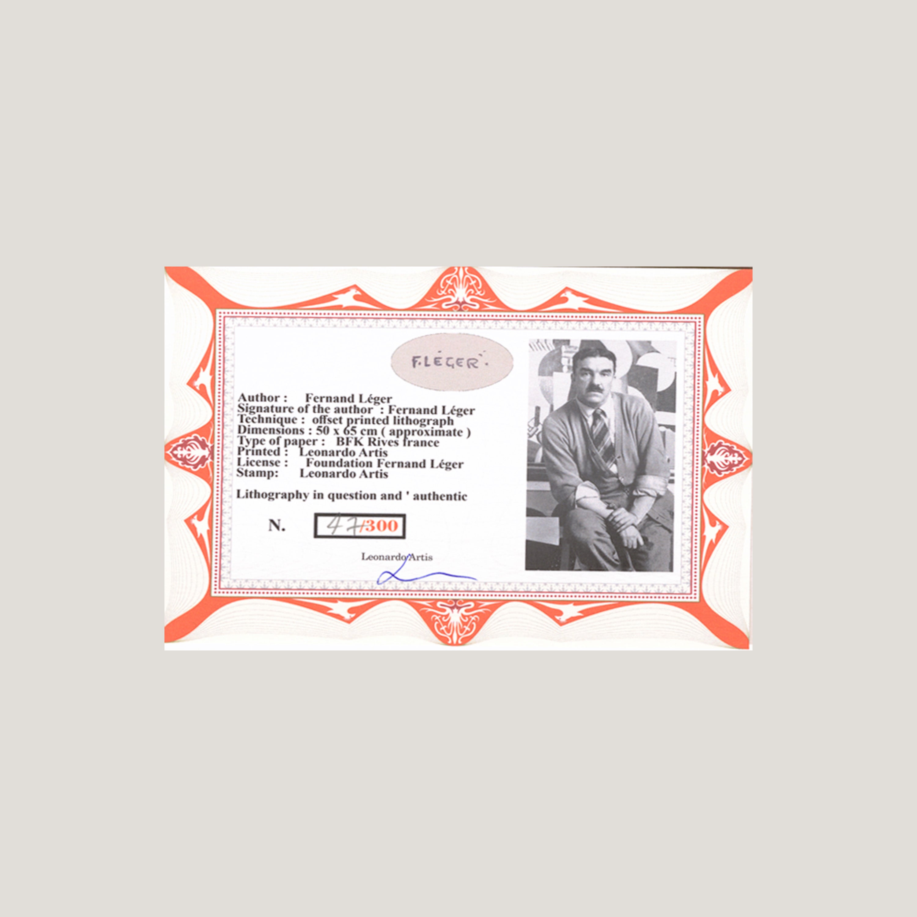 Certifikovaný grafický list, 50x65 cm, 47/300. Certifikát, slepotisk Leonardo Artis, ruční papír BFK Rivers france. License: Foundation Fernand Léger.