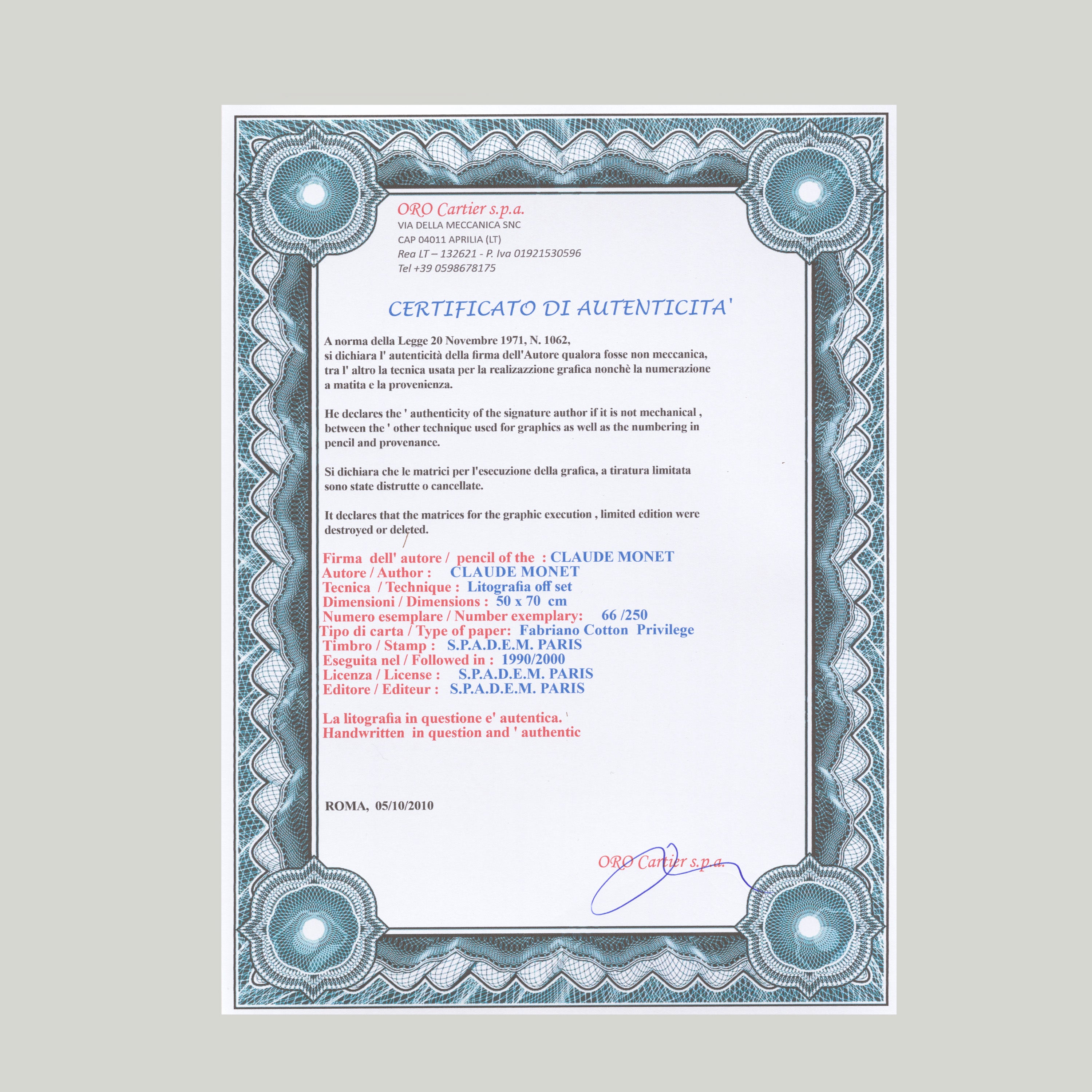 Certifikovaný grafický list, 50x70 cm. Číslováno 66/250. Certifikát, ruční papír Fabriano Cotton Privilege. Signováno vpravo dole Claude Monet. Slepotisk S.P.A.D.E.M. Paris. Číslováno tužkou