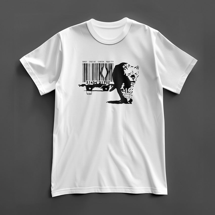 Banksyho motiv kombinuje čárový kód s divokou šelmou, čímž kritizuje konzumerismus a jeho dopad na přírodu.