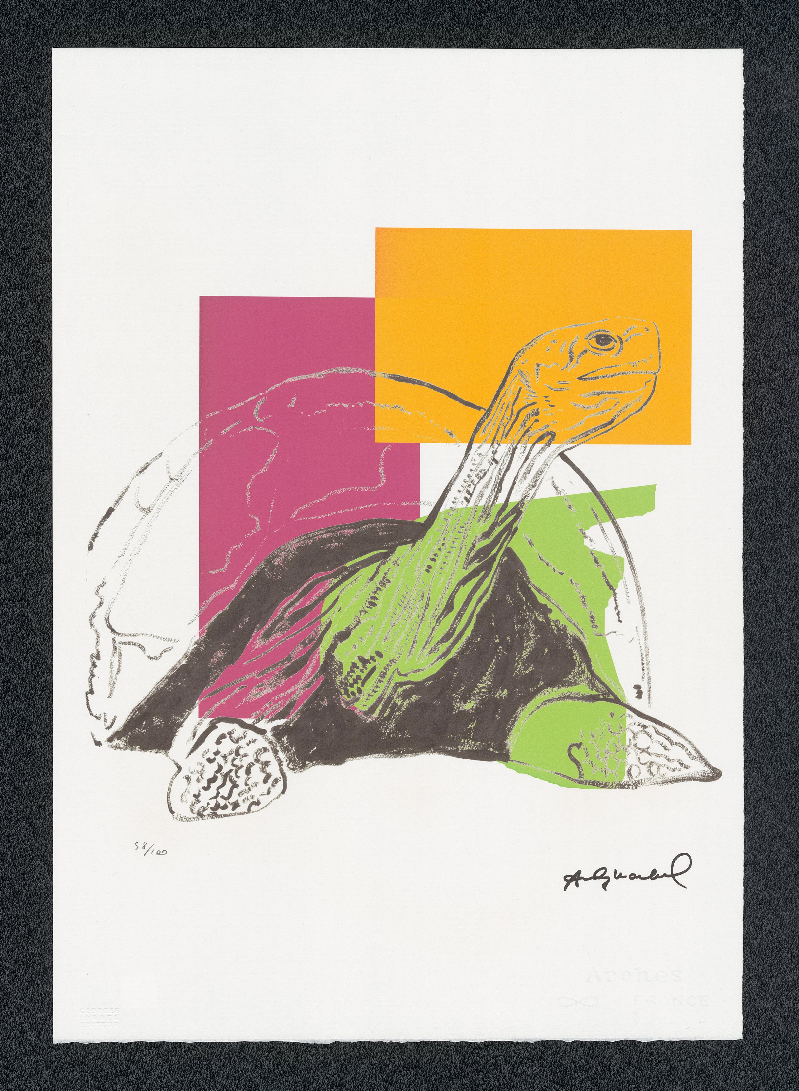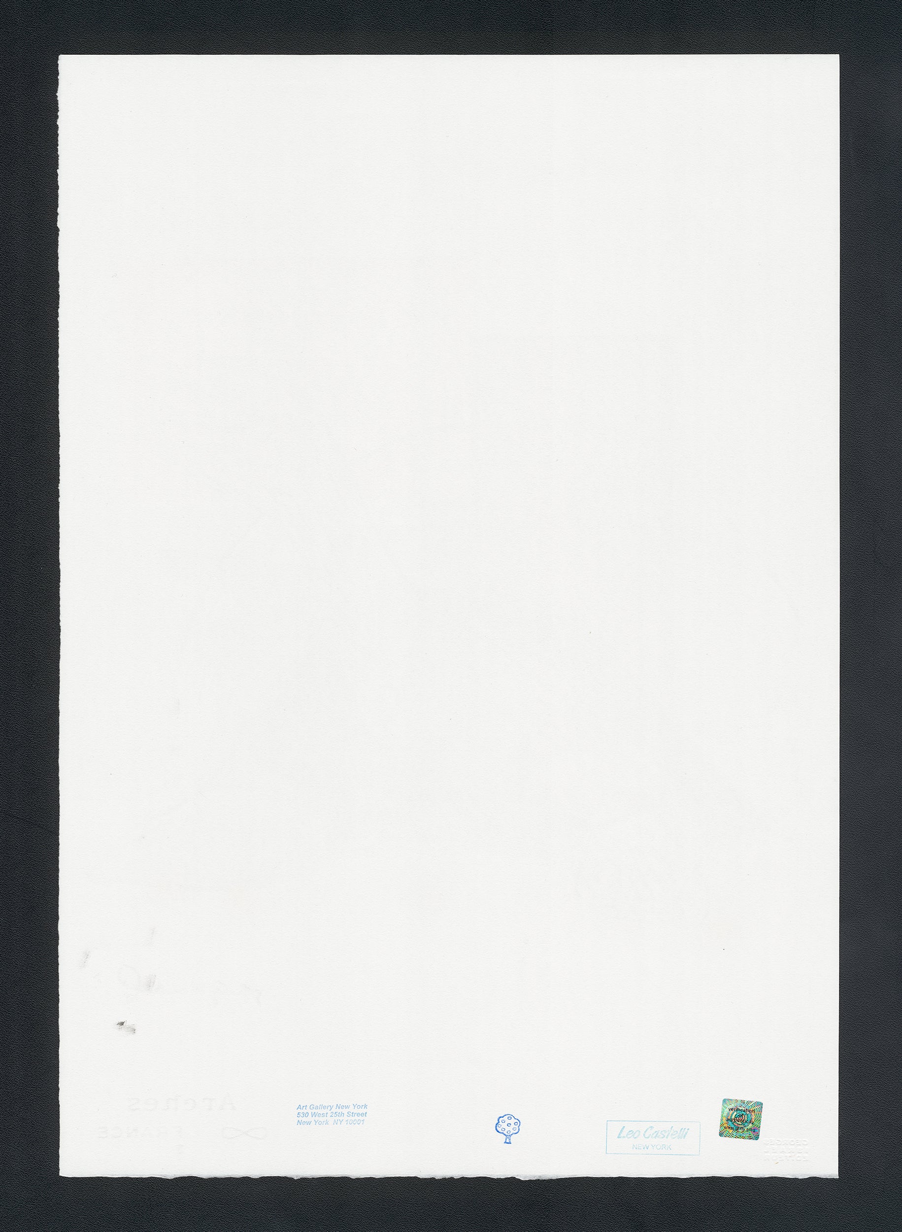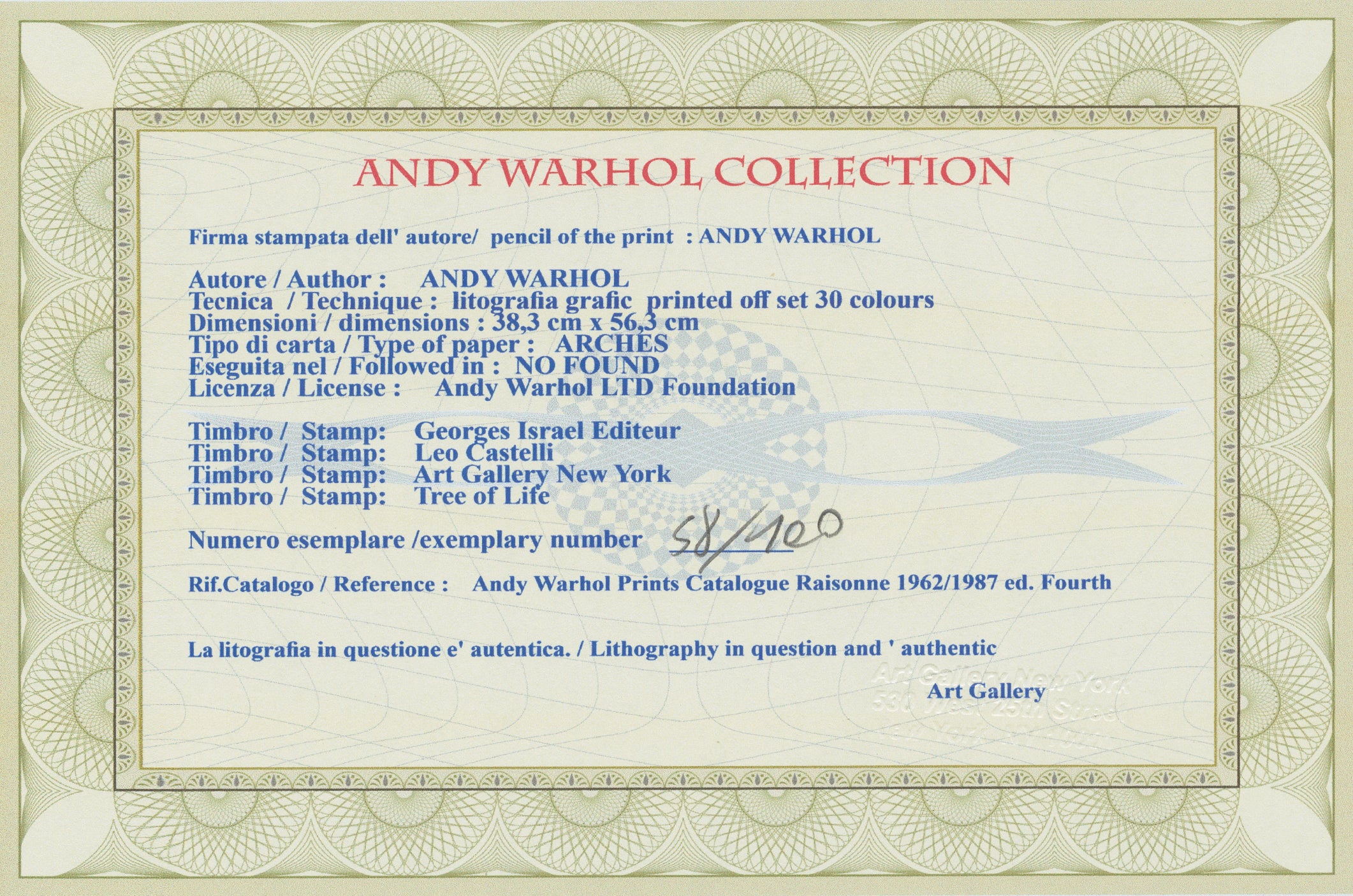 Certifikovaný grafický list, 38 x 56 cm. Certifikát, slepotisk © ANDY WARHOL, ruční papír Fabriano Privilege. Signováno vpravo dole Andy Warhol. Na zadní straně razítka: ANDY WARHOL Factory.
