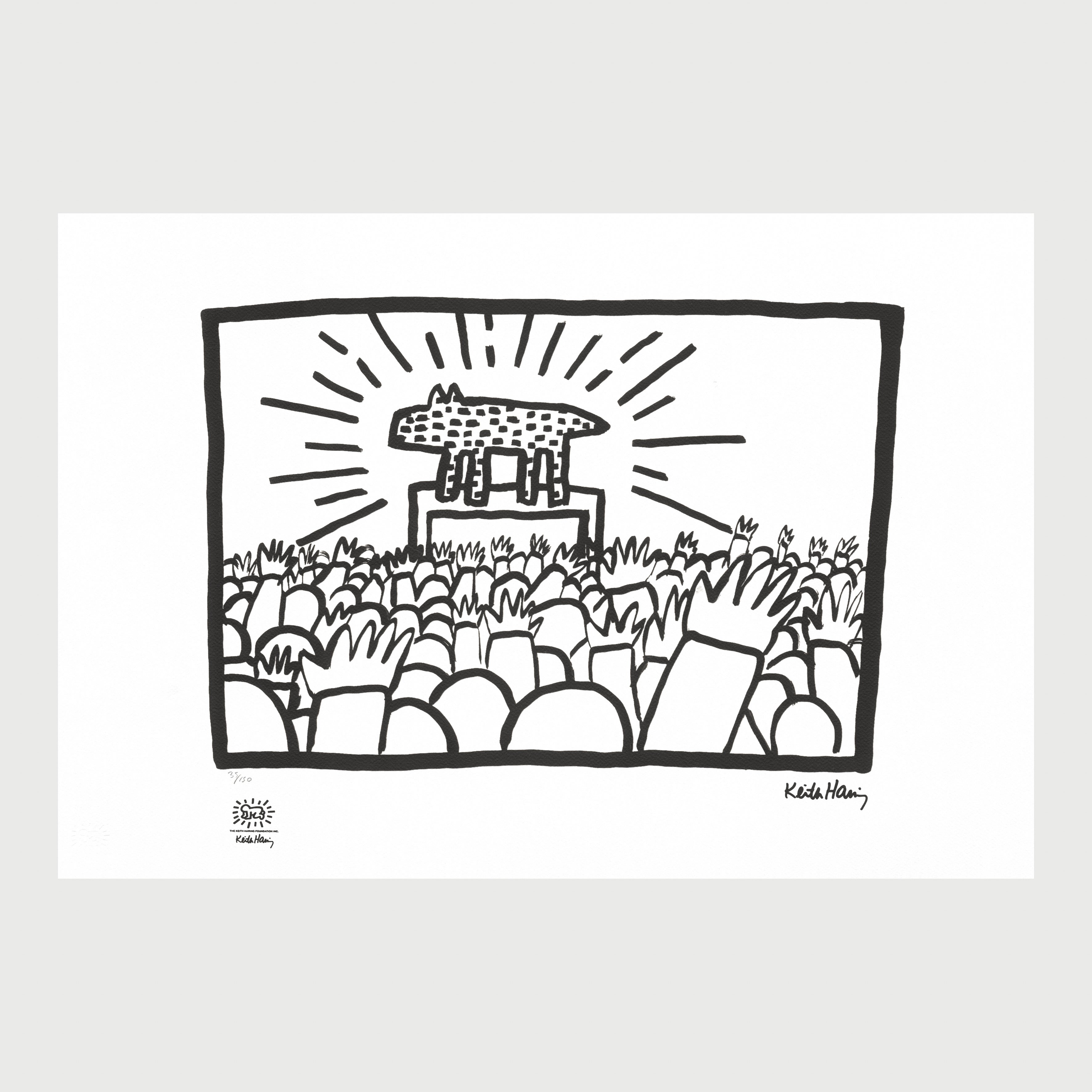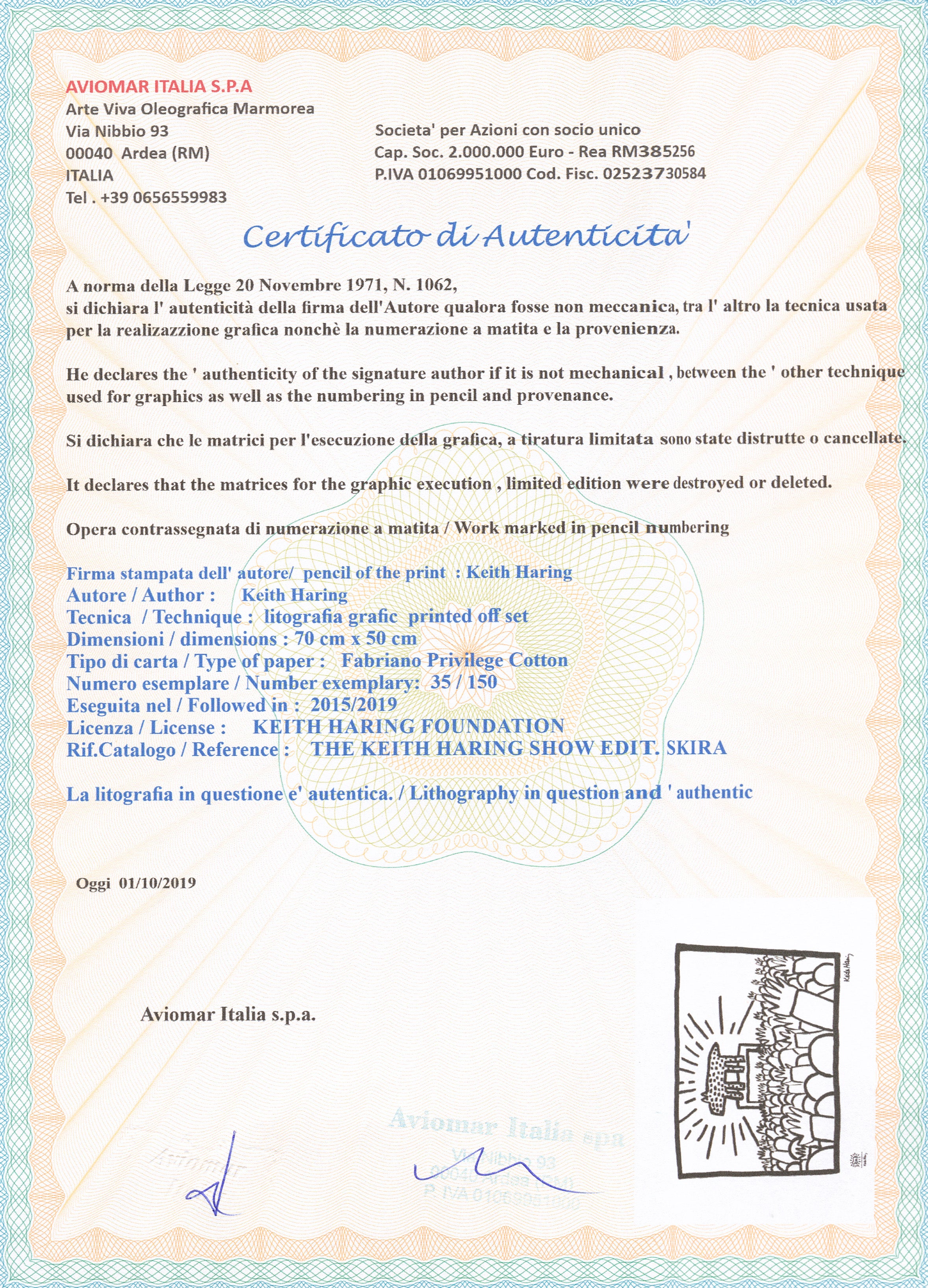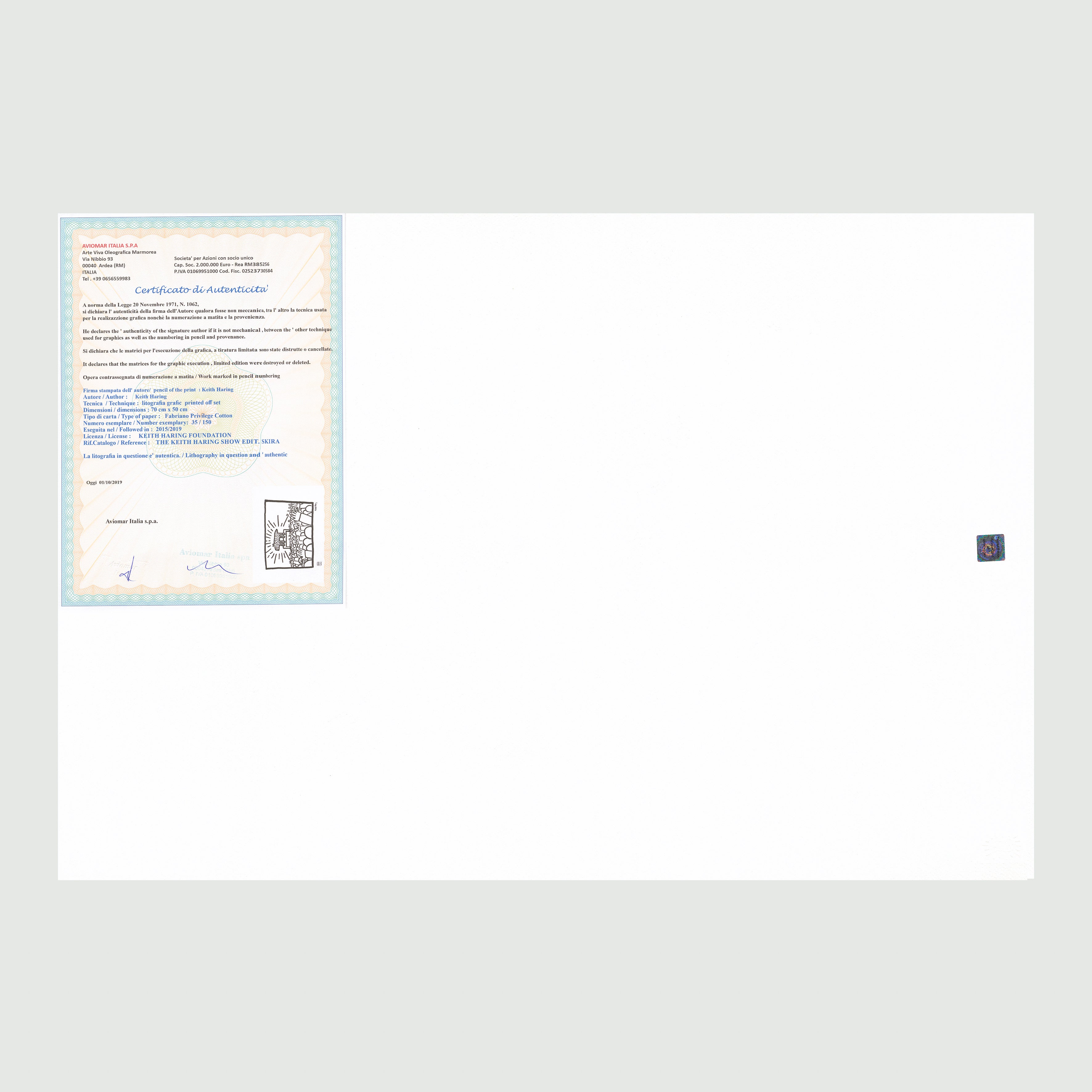 Certifikovaný grafický list, 50 x 70 cm. Číslováno 19/150. Certifikát, slepotisk a licence KEITH HARING FOUNDATION, ruční papír Fabriano Privilege Cotton. Signováno vpravo dole Keith Haring.